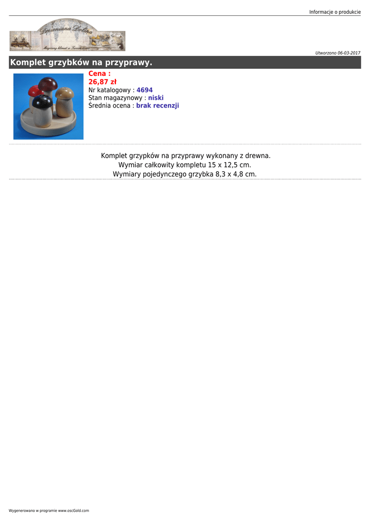 Informacje o produkcie Utworzono 06-03-2017 Komplet grzybków na przyprawy. Cena : 26,87 zł Nr katalogowy : 4694 Stan magazynowy : niski Średnia ocena : brak recenzji Komplet grzypków na przyprawy wykonany z drewna. Wymiar całkowity kompletu 15 x 12,5 cm. Wymiary pojedynczego grzybka 8,3 x 4,8 cm. Wygenerowano w programie www.oscGold.com