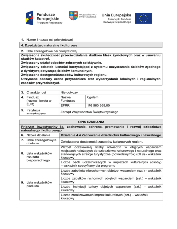 1. Numer i nazwa osi priorytetowej 4. Dziedzictwo naturalne i kulturowe 2. Cele szczegółowe osi priorytetowej Zwiększona skuteczność przeciwdziałania skutkom klęsk żywiołowych oraz w usuwaniu skutków katastrof. Zwiększony udział odpadów zebranych selektywnie. Zwiększony odsetek ludności korzystającej z systemu oczyszczania ścieków zgodnego z dyrektywą dotyczącą ścieków komunalnych. Zwiększona dostępność zasobów kulturowych regionu. Utrzymane obszary cenne przyrodniczo oraz wykorzystanie lokalnych i regionalnych zasobów przyrodniczych. 3. Charakter osi Nie dotyczy 4. Fundusz (nazwa i kwota w EUR) Nazwa Funduszu Ogółem EFRR 176 560 369,00 5. Instytucja zarządzająca Zarząd Województwa Świętokrzyskiego OPIS DZIAŁANIA Priorytet inwestycyjny 6c. zachowanie, ochrona, promowanie i rozwój dziedzictwa naturalnego i kulturowego 6. Nazwa działania Działanie 4.4 Zachowanie dziedzictwa kulturowego i naturalnego 7. Cel/e szczegółowy/e działania Zwiększona dostępność zasobów kulturowych regionu 8. Lista wskaźników rezultatu bezpośredniego Wzrost oczekiwanej liczby odwiedzin w objętych wsparciem miejscach należących do dziedzictwa kulturowego i naturalnego oraz stanowiących atrakcje turystyczne (odwiedziny/rok) (CI 9) – wskaźnik kluczowy Liczba osób uczestniczących w imprezach kulturalnych (osoby) – wskaźnik specyficzny dla programu Liczba zabytków nieruchomych objętych wsparciem (szt.) – wskaźnik kluczowy 9. Lista wskaźników produktu Liczba zabytków ruchomych objętych wsparciem (szt.) – wskaźnik kluczowy Liczba instytucji kultury objętych wsparciem (szt.) – wskaźnik kluczowy Liczba zrealizowanych imprez kulturalnych (szt.) – wskaźnik kluczowy 10. Typy projektów W ramach działania wsparcie znajdą przedsięwzięcia z zakresu: zachowania i zabezpieczenia obiektów dziedzictwa kulturowego i obiektów zabytkowych (w tym: konserwacja, renowacja, rewaloryzacja oraz zabezpieczenie tych obiektów przed zagrożeniami wraz z zagospodarowaniem ich otoczenia) wraz z dostosowaniem do funkcji turystycznych lub prowadzenia działalności kulturalnej, w tym działalności gospodarczej. Projekty związane z ochroną i zachowaniem dziedzictwa kulturowego dotyczyć mogą jedynie obiektów znajdujących się na terenie województwa świętokrzyskiego, wpisanych do rejestru zabytków prowadzonego przez wojewódzkiego konserwatora zabytków. rozwoju zasobów kultury i ochrony dziedzictwa narodowego i kulturowego, w tym rozbudowa, przebudowa obiektów publicznej infrastruktury kulturalnej oraz zagospodarowanie ich otoczenia wraz z dostosowaniem tych obiektów do prowadzenia działalności kulturalnej, w tym działalności gospodarczej. Wsparcie nie będzie kierowane na budowę od podstaw nowej infrastruktury kulturalnej. zakupu wyposażenia oraz konserwacji muzealiów, materiałów archiwalnych, starodruków itp. promocji dziedzictwa kulturowego regionu wraz z tworzeniem i promocją produktów tradycyjnych i regionalnych oraz kompleksowych produktów turystycznych (w tym tworzenie szlaków kulturowych). Działania informacyjno-promocyjne będą wspierane jedynie jako element szerszego działania w ramach projektu, organizacji wydarzeń kulturalnych. Warunkami przyznania wsparcia będzie spełnienie następujących kryteriów: szczególny wpływ na gospodarkę regionalną, wykazany przez wymierne długoterminowe korzyści, wkład w cele Strategii UE dla Regionu Morza Bałtyckiego w ramach Obszaru Priorytetowego Kultura, mianowicie promowanie kultury, dziedzictwa kulturowego oraz przemysłu kreatywnego, wysokość wkładu EFRR nie może przekroczyć wkładu sektora prywatnego w realizację projektu (z wyłączeniem bezpośrednich przychodów ze sprzedaży biletów). Dopuszcza się możliwość finansowania termomodernizacji obiektów infrastruktury kulturalnej w wysokości nie wyższej niż 30% wartości kosztów kwalifikowalnych projektu. Jeżeli projekt dotyczy modernizacji kilku obiektów, termomodernizacja nie może przekroczyć 30% wartości kosztów kwalifikowalnych dla każdego zadania (obiektu) w ramach projektu. Ponadto przy wyborze projektów do dofinansowania w ramach działania brane będą pod uwagę aspekty t.j.: analiza popytu (w tym szacunkowa liczba odwiedzających), realizacja priorytetów rozwoju kultury, długoterminowa stabilność finansowa (w tym dywersyfikacja zasobów finansowych), zapewnienie trwałości efektów społeczno-gospodarczych projektów w tym m.in.: tworzenie nowych miejsc pracy i wpływ na gospodarkę oraz rozwój ekultury i kreatywnego przemysłu kulturowego. Projekty realizowane w ramach działania powinny uwzględniać potrzeby osób niepełnosprawnych. 11. Typ beneficjenta Jednostki samorządu terytorialnego, samorządowe wojewódzkie osoby prawne, instytucje kultury, instytucje ochrony dziedzictwa narodowego, kulturowego (w tym archiwum państwowe), ROT i lokalne organizacje turystyczne, organizacje pozarządowe posiadające osobowość prawną, związki i stowarzyszenia jst, kościelne osoby prawne, przedsiębiorcy, związki wyznaniowe oraz szkoły i uczelnie artystyczne 12. Grupa docelowa/ ostateczni odbiorcy wsparcia Nie dotyczy 13. Instytucja pośrednicząca (jeśli dotyczy) Nie dotyczy 14. Instytucja wdrażająca (jeśli dotyczy) Nie dotyczy 15. Kategoria(e) regionu(ów) wraz z przypisaniem kwot UE (EUR) (Wkład ze środków unijnych na działanie) Słabiej rozwinięty 37 412 210,00 16. Mechanizmy powiązania interwencji z innymi Nie dotyczy działaniami w ramach PO lub z innymi PO (jeśli dotyczy) 17. Instrumenty terytorialne (jeśli dotyczy) Z alokacji wydzielono środki dla następujących Obszarów Strategicznej Interwencji: obszar uzdrowiskowy (w zakresie dot. ochrony zasobów środowiska naturalnego, które stanowią potencjał tych terenów), obszar obejmujący gminy: Busko-Zdrój i SolecZdrój; obszar Gór Świętokrzyskich obejmujący gminy: Bodzentyn, Nowa Słupia, Pawłów, Bieliny, Ł