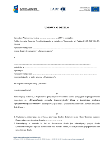 UMOWA O DZIEŁO Zawarta w Warszawie, w dniu ………………………2009 r. pomiędzy: Polską Agencją Rozwoju Przedsiębiorczości z siedzibą w Warszawie, ul. Pańska 81/83, NIP 526-2501-444, reprezentowaną przez: ......................................................................................................................... zwaną dalej w treści umowy „Zamawiającym” a .................................................................................................................................................... z siedzibą w ............................................................................................................................................ wpisaną do …………………………………………………………………………………………….. reprezentowaną przez …………………………………………………………………………………. zwanym/(ą) dalej w treści umowy „Wykonawcą”, zaś wspólnie zwanymi dalej „Stronami” o następującej treści: §1 Zamawiający zamawia, a Wykonawca przyjmuje do wykonania dzieło polegające na przygotowaniu ekspertyzy pt.: „Determinanty rozwoju innowacyjności firmy w kontekście poziomu wykształcenia pracowników”. Szczegółowy opis dzieła – przedmiotu zamówienia zawiera załącznik 1 do Umowy. §2 1. Wykonawca zobowiązuje się wykonać powyŜsze dzieło i dostarczyć je na własny koszt do siedziby Zamawiającego w terminie do dnia……………………. 2. Zamawiający w terminie 14 dni od dostarczenia dzieła jest zobowiązany przyjąć dzieło i poinformować jakie zgłasza zastrzeŜenia oraz określić termin, w którym oczekuje poprawienia lub uzupełnienia dzieła. 3. Brak zastrzeŜeń w terminie, o którym mowa w ust.2, oznacza, Ŝe Zamawiający przyjął dzieło bez zastrzeŜeń. §3 1. Zamawiający zobowiązuje się do zapłaty wynagrodzenia za wykonanie dzieła i za przeniesienie praw, o których mowa w § 6, w wysokości ...................................(słownie.....................................). 2. Wartość autorskich praw majątkowych, o których mowa w §6, wynosi........................................ zł. 3. Wynagrodzenie zostanie wypłacone po przyjęciu dzieła, w terminie 30 dni od dnia otrzymania przez Zamawiającego prawidłowo wystawionej faktury. 4. W przypadku naliczenia Wykonawcy kary umownej, płatności na rzecz Wykonawcy, są dokonywane w terminie określonym w ust. 3, liczonym od dnia wpływu naleŜnej kwoty kary umownej na rachunek bankowy wskazany przez Zamawiającego w wezwaniu do uiszczenia takiej kary. 5. Zapłata wynagrodzenia zostanie dokonana przelewem na rachunek Wykonawcy Nr ...................................................................prowadzony przez Bank .................................................... 6. Zamawiający oświadcza, iŜ niniejsze dzieło jest współfinansowane ze środków Unii Europejskiej w ramach Europejskiego Funduszu Społecznego. §4 1. W przypadku niewykonania lub nie naleŜytego wykonania dzieła w umówionym terminie, Wykonawca zapłaci Zamawiającemu karę umowną w wysokości 0,2% wartości wynagrodzenia, o którym mowa w § 3 ust. 1, za kaŜdy dzień niewykonania lub nienaleŜytego wykonania dzieła. 2. W przypadku niewykonania dzieła w terminie 7 dni od upływu terminu ustalonego w umowie, Zamawiający moŜe odstąpić od umowy bez wyznaczania dodatkowego terminu do wykonania dzieła. 3. Zamawiający zastrzega sobie prawo do dochodzenia na zasadach ogólnych odszkodowania przewyŜszającego wysokość kary umownej. §5 1. Wykonawca nie moŜe powierzyć ani w całości, ani w części wykonania dzieła osobom trzecim bez zgody Zamawiającego wyraŜonej na piśmie pod rygorem niewaŜności. 2. W razie uzyskania takiej zgody, Wykonawca za działania lub zaniechania osób trzecich ponosi odpowiedzialność jak za własne działania lub zaniechania. §6 2 Z dniem przyjęcia dzieła, Wykonawca przenosi na zasadach wyłączności na Zamawiającego autorskie prawa majątkowe do dzieła określonego w § 1 na następujących polach eksploatacji: • utrwalenie (sporządzenie egzemplarza, który mógłby słuŜyć publikacji utworu), • digitalizacja, • wprowadzenie do pamięci komputera, • sporządzenie wydruku komputerowego, • zwielokrotnienie poprzez druk lub nagranie na nośniku magnetycznym w postaci elektronicznej, • wprowadzenie do obrotu, w tym w postaci wydawnictwa ksiąŜkowego, dziełowego, w tym równieŜ w formie wymiennokartkowej aktualizowanej, wydawnictwa prasowego, w formie zapisu elektronicznego na dowolnym nośniku, • nieodpłatne wypoŜyczenie lub udostępnienie zwielokrotnionych egzemplarzy, • wprowadzanie w całości lub w części do sieci komputerowej Internet w sposób umoŜliwiający transmisję odbiorczą przez zainteresowanego uŜytkownika łącznie z utrwalaniem w pamięci RAM, - w oryginalnej (polskiej) wersji językowej i w tłumaczeniu na języki obce, wraz z prawem do dokonywania opracowań, przemontowań i zmian układu, na terytorium Polski oraz poza jej granicami, a takŜe zezwala Zamawiającemu na wykonywanie zaleŜnego prawa autorskiego. §7 1. Wykonawca zobowiązany jest do informowania, Ŝe dzieło jest realizowane z udziałem środków finansowych pochodzących z Unii Europejskiej, zgodnie z postanowieniami rozporządzenia (WE) nr 1828/2006 ustanawiającym szczegółowe zasady wykonania Rozporządzenia Rady (WE) nr 1083/2006 ustanawiającego ogólne przepisy dotyczące Europejskiego Funduszu Rozwoju Regionalnego, Europejskiego Funduszu Społecznego i Funduszu Spójności. 2. Wykonawca zobowiązany jest do postępowania zgodnie z „Wytycznymi dotyczącymi oznaczania projektów w ramach Programu Operacyjnego Kapitał Ludzki”, które są dostępne pod adresem www.efs.gov.pl. 3. Wykonawca na potrzeby realizacji niniejszej umowy będzie korzystał z obowiązującego logo PO KL dostępnego na stronie www.efs.gov.pl 