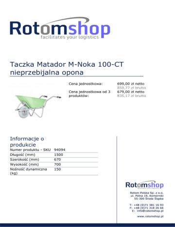 Taczka Matador M-Noka 100-CT nieprzebijalna opona Cena jednostkowa: Cena jednostkowa od 3 produktów: Informacje o produkcie Numer produktu - SKU Długość (mm) Szerokość (mm) Wysokość (mm) Nośność dynamiczna (kg) Powered by TCPDF (www.tcpdf.org) 94094 1500 670 700 150 699,00 859,77 679,00 835,17 zł zł zł zł netto brutto netto brutto