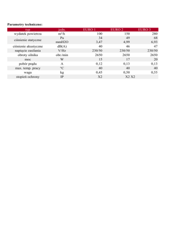 Parametry techniczne: typ wydatek powietrza ciśnienie statyczne ciśnienie akustyczne napięcie zasilania obroty silnika moc pobór prądu max. temp. pracy waga stopień ochrony jedn. m³/h Pa mmH2O dB(A) V/Hz obr./min W A °C kg IP EURO 1 100 34 3,47 40 230/50 2650 15 0,12 40 0,45 X2 EURO 2 150 49 4,99 46 230/50 2650 17 0,13 40 0,50 X2 X2 EURO 3 280 68 6,93 47 230/50 2650 20 0,13 40 0,55