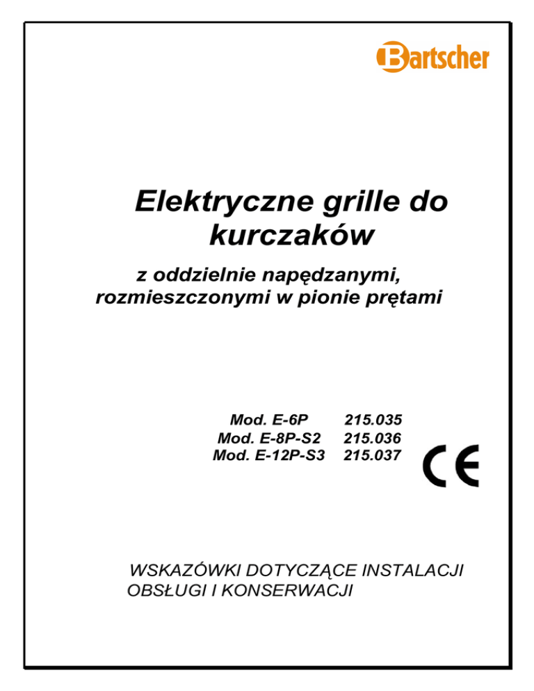 Elektryczne grille do kurczaków z oddzielnie napędzanymi, rozmieszczonymi w pionie prętami Mod. E-6P Mod. E-8P-S2 Mod. E-12P-S3 215.035 215.036 215.037 WSKAZÓWKI DOTYCZĄCE INSTALACJI OBSŁUGI I KONSERWACJI rev. 2 – 09/06/2009 2/6 ILUSTRACJA URZĄDZENIA il. 1 CECHY Model E-6P E-8P-S2 Pręty 2 2 Kurczaki 6 8 Szerokość 700 mm 880 mm Głębokość 360 mm 470 mm Wysokość 530 mm 530 mm E-12P-S3 3 12 880 mm 470 mm 710 mm Napięcie 230V~ 230V~ 230V 3~ 400V 3N~ Moc 2800 W 3500 W 5000 W INSTALACJA Ustawienie, instalacja i ewentualne czynności związane z usuwaniem usterek mogą być przeprowadzane wyłącznie przez wykwalifikowany personel specjalistyczny: Wyjąć urządzenie z opakowania i usunąć materiał opakowania. Zdjąć folię ochronną z urządzenia; jeśli na urządzeniu znajdują się pozostałości kleju, naleŜy je usunąć za pomocą odpowiednich środków. Tabliczka znamionowa znajduje się z tyłu urządzenia. Dane dotyczące napięcia zamieszczone na tabliczce muszą być zgodne z wartością napięcia w miejscu podłączenia. Podczas uruchamiania urządzenia naleŜy mieć na uwadze, Ŝe wartość napięcia nie moŜe odbiegać od wartości znamionowej o więcej niŜ 10% plus/minus. Na odcinku przyłączeniowym urządzenia naleŜy zastosować zgodny z przepisami wyłącznik, w którym rozwarcie styków wynosi co najmniej 3 mm dla kaŜdego bieguna. Wyłącznik musi być łatwo dostępny. Urządzenie musi być ustawione stabilnie i poziomo. Pokręcając nóŜkami moŜna zniwelować ewentualne nierówności, które mogą mieć negatywny wpływ na optymalną wydajność i poprawność działania urządzenia. Jeśli w pobliŜu znajdują się łatwozapalne przegrody lub meble, naleŜy je zabezpieczyć odpowiednimi osłonami. NaleŜy ściśle przestrzegać przepisów ppoŜ. Pomiędzy ściankami bocznymi oraz tylną ścianką urządzenia, a sąsiadującymi łatwopalnymi przegrodami naleŜy zachować odstęp 15 cm. Urządzenie naleŜy zainstalować zgodnie z obowiązującymi przepisami lokalnymi oraz normami europejskimi. rev. 2 – 09/06/2009 3/6 INSTRUKCJA OBSŁUGI A il. 2 Instalację oraz pierwsze uruchomienie grilla do kurczaków naleŜy zlecić wykwalifikowanemu personelowi specjalistycznemu. Aby zapewnić prawidłowe działanie urządzenia naleŜy wiedzieć Ŝe: - B - C D B C D - Za pomocą włącznika oświetlenia (A) włącza się wewnętrzne oświetlenie grilla do kurczaków. UŜywając włącznika silnika przekładniowego (B) włącza się napędy powodujące obrót prętów. Regulatory (D) słuŜą do wyzwolenia ruchu grzałek. Regulatory grzałek (Infinit control) są przeznaczone do zmieniania czasu załączenia elementów grzejnych, których zadaniem jest rozgrzewanie grilla do kurczaków. Wartość całkowita dla kaŜdej jednostki regulacyjnej jest podzielona na 9 wartości pośrednich. Po osiągnięciu pracy ciągłej (MAX) następuje powrót do 0 (grzałki wyłączone). KaŜda jednostka słuŜy do ustawienia czasu (w sekundach) włączenia odpowiednich grzałek; grzałki odpowiadające jednostkom ustawionym na 0 pozostają wyłączone. Wartość czasu włączenia dla poszczególnych grzałek moŜe zostać w kaŜdej chwili zmieniona. Lampka kontrolna C wskazuje stan pracy grzałek. Po osiągnięciu pracy ciągłej (MAX) następuje powrót do 0 (grzałki wyłączone). KaŜda jednostka słuŜy do ustawienia czasu (w sekundach) włączenia odpowiednich grzałek; grzałki odpowiadające jednostkom ustawionym na 0 pozostają wyłączone. il. 3 Wskazówka: Gdy napędy są wyłączone, specjalny mechanizm uniemoŜliwia działanie grzałek, aby nie doszło do przypalenia kurczaków. ZAŁADUNEK GRILLA DO KURCZAKÓW W celu umieszczenia kurczaków w grillu naleŜy postępować następująco: Ręcznie wyjąć zimne pręty Nadziać kurczaki na pręty zgodnie z ilustracją 4 Umieścić pręty w grillu Po upływie czasu grillowania wyjąć pręty uŜywając rękawic kuchennych il. 4 Nie umieszczać dłoni bądź innych elementów we wnętrzu urządzenia do grillowania kurczaków podczas jego pracy. rev. 2 – 09/06/2009 4/6 PROPONOWANE CZASY GRILLOWANIA Czas grillowania dla kurczaków o wadze ok. 2 kg wynosi od 75 do 90 minut. PoniŜsze elementy mogą mieć istotny wpływ na czas grillowania: wcześniejsze rozgrzanie grilla chude lub tłuste mięso cięŜar i kształt grillowanej potrawy temperatura surowego produktu i poŜądany stan końcowy (większe lub mniejsze brązowienie). CZYSZCZENIE I KONSERWACJA UWAGA: urządzenia nie naleŜy poddawać bezpośredniemu oddziaływaniu strumienia wody; nie stosować myjki ciśnieniowej Czyszczenie urządzenia jest bardzo waŜne, poniewaŜ zapewnia ono poprawną pracę oraz długą Ŝywotność. Ponadto zadbane urządzenie robi dobre wraŜenie na klientach. W razie potrzeby czyszczenie naleŜy przeprowadzać zgodnie z poniŜszymi zaleceniami: Przed kaŜdym czyszczeniem lub pracami konserwacyjnymi naleŜy odłączyć zasilanie wyciągając wtyczkę z gniazdka. Wyłączyć urządzenie za pomocą wielobiegunowego wyłącznika umieszczonego przed urządzeniem lub wyciągnąć wtyczkę z gniazdka (wtyczka musi być sucha). Czyszczenie rozpocząć dopiero po osygnięciu urządzenia. Wszystkie części ze stali nierdzewnej mogą być czyszczone tylko za pomocą wody z odpowiednim środkiem myjącym. W Ŝadnym przypadku nie stosować pieniących się lub Ŝrących środków, te mogą zniszczyć powierzchnię. Deskę rozdzielczą, uchwyt i szyby naleŜy oczyszczać za pomocą miękkiej, wilgotnej ściereczki. Podczas pracy ciągłej szyby powinny być częściej przecierane wilgotną, ciepłą ściereczką. Rozgrzanie materiału ma istotne znaczenie, poniewaŜ duŜa róŜnica temperatur moŜe być przyczyną pęknięcia szkła. Dlatego rozgrzanej ściereczki naleŜy uŜywać takŜe w przypadku czyszczenia szyb, które jeszcze nie ostygły; równieŜ stosowana woda nie moŜe być zimna. Szyby moŜna usunąć, aby uzyskać lepszy dostęp do wnętr