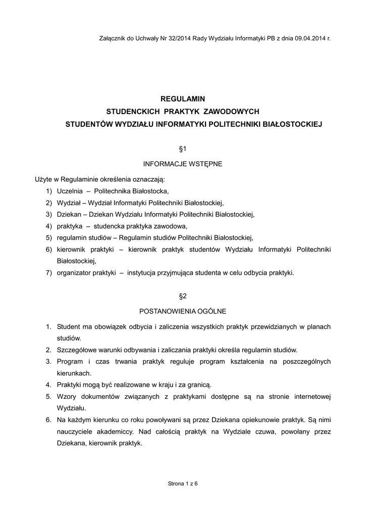 Załącznik do Uchwały Nr 32/2014 Rady Wydziału Informatyki PB z dnia 09.04.2014 r. REGULAMIN STUDENCKICH PRAKTYK ZAWODOWYCH STUDENTÓW WYDZIAŁU INFORMATYKI POLITECHNIKI BIAŁOSTOCKIEJ §1 INFORMACJE WSTĘPNE Użyte w Regulaminie określenia oznaczają: 1) Uczelnia – Politechnika Białostocka, 2) Wydział – Wydział Informatyki Politechniki Białostockiej, 3) Dziekan – Dziekan Wydziału Informatyki Politechniki Białostockiej, 4) praktyka – studencka praktyka zawodowa, 5) regulamin studiów – Regulamin studiów Politechniki Białostockiej, 6) kierownik praktyki – kierownik praktyk studentów Wydziału Informatyki Politechniki Białostockiej, 7) organizator praktyki – instytucja przyjmująca studenta w celu odbycia praktyki. §2 POSTANOWIENIA OGÓLNE 1. Student ma obowiązek odbycia i zaliczenia wszystkich praktyk przewidzianych w planach studiów. 2. Szczegółowe warunki odbywania i zaliczania praktyki określa regulamin studiów. 3. Program i czas trwania praktyk reguluje program kształcenia na poszczególnych kierunkach. 4. Praktyki mogą być realizowane w kraju i za granicą. 5. Wzory dokumentów związanych z praktykami dostępne są na stronie internetowej Wydziału. 6. Na każdym kierunku co roku powoływani są przez Dziekana opiekunowie praktyk. Są nimi nauczyciele akademiccy. Nad całością praktyk na Wydziale czuwa, powołany przez Dziekana, kierownik praktyk. Strona 1 z 6 §3 CELE PRAKTYKI Praktyki mają na celu: poszerzanie wiedzy zdobytej na studiach i rozwijanie umiejętności jej wykorzystania, poznanie specyfiki pracy na różnych stanowiskach, kształtowanie umiejętności niezbędnych w przyszłej pracy zawodowej, w tym m. in. umiejętności: analitycznych, organizacyjnych, pracy w zespole, nawiązywania kontaktów, a także przygotowanie studenta do samodzielności i odpowiedzialności za powierzone mu zadania. nawiązanie kontaktów zawodowych, stworzenie warunków do aktywizacji zawodowej studentów na rynku pracy. §4 ORGANIZACJA ORAZ PRZEBIEG PRAKTYK 1. Student samodzielnie wskazuje organizatora praktyki. Może w tym celu może skorzystać z oferty zamieszczonej na stronie internetowej Wydziału. 2. Przed odbyciem praktyki student wypełnia formularz zgłoszenia zawierający dane organizatora niezbędne do sporządzenia umowy o odbywanie praktyk zawodowych oraz szczegółowy program praktyk przygotowany w porozumieniu z organizatorem praktyk (formularz dostępny na stronie internetowej Wydziału) i przekazuje kierownikowi praktyk. Program praktyk zatwierdza Dziekan. 3. Praktyka realizowana jest w okresie wakacji (lipiec, sierpień, wrzesień). W uzasadnionych przypadkach termin może być przesunięty przez Dziekana na pisemny wniosek studenta. 4. Kierownik praktyk sporządza umowę (formularz dostępny na stronie internetowej Wydziału) o organizację praktyki i przekazuje do podpisania Dziekanowi. Jeden egzemplarz podpisanej umowy, wraz z programem praktyki, student przekazuje organizatorowi praktyk. Drugi egzemplarz student przekazuje kierownikowi praktyk. 5. Formalności związane z podpisaniem umowy należy załatwić w terminie określonym przez kierownika praktyk. 6. Koszty ubezpieczenia od nieszczęśliwych wypadków uczestników praktyki pokrywa Uczelnia. 7. Koszty wyżywienia, noclegów oraz dojazdów związanych z odbywaniem praktyki poza miejscem zamieszkania ponosi student. Uczelnia nie zwraca poniesionych w tym zakresie wydatków. Strona 2 z 6 §5 PROGRAM PRAKTYK 1. Program praktyk powinien być zgodny z realizowanym programem kształcenia. W szczególności, dla programów realizowanych zgodnie z KRK, powinien uwzględniać realizację wszystkich efektów kształcenia określonych w karcie przedmiotu. 2. Program praktyk powinien obejmować w szczególności: przestrzeganie zasad BHP i p.poż., przestrzeganie zasad zachowania tajemnicy służbowej i państwowej oraz ochrony poufności danych w zakresie określonym przez organizatora praktyk. 3. Ramowe programy praktyk na poszczególnych kierunkach stanowią załącznik do niniejszego Regulaminu. §6 WARUNKI ZALICZENIA PRAKTYK 1. Program i sposób zaliczania praktyk ustala Dziekan. 2. Zaliczenie praktyki dokonywane jest na podstawie programu praktyk, umowy o organizację obowiązkowej praktyki zawodowej oraz sprawozdania z odbytych praktyk. 3. Zaliczenia praktyki dokonuje opiekun praktyk. 4. Jako praktykę Dziekan może zaliczyć: zatrudnienie studenta w kraju lub za granicą, jeżeli charakter pracy spełnia wymogi programu praktyki, udział studenta w obozie naukowym organizowanym przez Uczelnię o czasie i profilu zgodnym z programem praktyki, inne formy aktywności zawodowej spełniające wymogi programu praktyki, m. in. odbywanie staży zawodowych, prowadzenie własnej działalności gospodarczej, świadczenie pracy na innych podstawach prawnych (np. wolontariat). Zaliczenie pracy studenta jako praktyki następuje na wniosek studenta. Do wniosku powinny być dołączone dokumenty uzasadniające prośbę studenta. §7 POSTANOWIENIA KOŃCOWE 1. W sprawach nieuregulowanych niniejszym Regulaminem mają zastosowanie wewnętrzne przepisy Uczelni oraz przepisy prawa powszechnie obowiązującego. 2. Niniejszy Regulamin obowiązuje od roku akademickiego 2014/2015. Strona 3 z 6 PROGRAM PRAKTYK NA KIERUNKU INFORMATYKA 1. Podczas trwania praktyki student powinien zapoznać się: profilem działalności i organizacją pracy w przedsiębiorstwie, obiegiem dokumentów i przepływem informacji, strukturą sieci komputerowej i sposobie podłączenia jej do Internetu, sposobem wykorzystania technik internetowych w działalności przedsiębiorstwa, z programami komputerowymi wykorzystywanymi w przedsiębiorstwie, zasadami BHP i p.poż., zasadami zachowania tajemnicy służbowej i państwowej oraz ochrony poufności danych w zakresie określonym przez organizatora praktyk. 2. Praktyka musi obejmować również aktywne uczestnictwo w rozwiązywaniu problemów polegające (w zależności od specyf