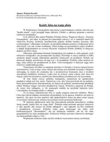 Janusz Wojciechowski Wiceprzewodniczący Komisji Rolnictwa i Rozwoju Wsi Poseł do Parlamentu Europejskiego KaŜdy kłos na wagę złota W Parlamencie Europejskim najczęściej wypowiadanym ostatnio słowem jest "health check", czyli przegląd stanu zdrowia. Chodzi o zdrowie pacjenta o nazwie rolnictwo europejskie. O to zdrowie dba unijna Wspólna Polityka Rolna. Diagnoza lekarza - Komisji Europejskiej - jest taka, Ŝe pacjent jest generalnie zdrowy i Ŝe w ostatnich latach był właściwie leczony. Komisja zaordynowała jedynie drobne korekty leczenia, leki wzmacniające i obniŜające ciśnienie, na przykład jednoprocentowe zwiększenie kwot mlecznych, czy tak zwana modulację, która polega na przesunięciu części środków z dopłat bezpośrednich na rozwój obszarów wiejskich (Polski miałoby to dotyczyć dopiero od 2012 roku). Głównym zaleceniem Komisji Europejskiej jest jednak to, Ŝeby pacjent, czyli rolnictwo europejskie, nie przemęczało się pracą. Pozostaje w mocy ustalona w kilku ostatnich latach zasada oddzielenia płatności rolniczych od produkcji. Rolnik ma dostawać dopłaty niezaleŜnie od tego czy i ile produkuje. Polityka rolna zmierza do tego, Ŝeby rolnicy nie produkowali za duŜo. Unia Europejska w dalszym ciągu chce walczyć z nadprodukcją rolną. Tymczasem od kilku co najmniej miesięcy w Europie i świecie narasta kryzys Ŝywnościowy. Ceny rosną i coraz silniej odczuwany jest niedobór Ŝywności. Eksperci ostrzegają, ze mamy do czynienia nie z przejściowym kryzysem, lecz z trwałym zjawiskiem niedoboru Ŝywności. Ludzi jest na świecie coraz więcej, jeść chcą teŜ więcej, ziemi nie przybywa, moŜliwości intensyfikacji produkcji teŜ się wyczerpują. W tym stanie rzeczy polityka europejska, nastawiona na ograniczanie produkcji rolnej, jest bez sensu. NajwyŜszy czas, aby Unia powróciła do tej polityki, która prowadziła przez dziesięciolecia, to znaczy do polityki stymulowania produkcji rolnej. Rolnicy mogą i powinni produkować więcej. Wystarczy spojrzeć na Polskę, ile ziemi leŜy odłogiem, w ilu miejscach zanikła na przykład hodowla krów i mieszkańcy wsi kupują mleko w sklepie. To co piszę, niekoniecznie leŜy w wąsko pojętym interesie rolników. Skoro Unia chce dawać dopłaty niezaleŜnie od produkcji, to jej sprawa, rolników nie musi to martwić. Ale musi się tym martwić całe społeczeństwo, które juz płaci coraz więcej za Ŝywność i któremu juz wkrótce tej Ŝywności moŜe po prostu brakować. W interesie społecznym musi być prowadzona polityka prorolnicza, według starej zasady :kaŜdy kłos na wagę złota". Polityka rolna powinna sprzyjać rolnictwu w taki sposób, aby ziemia nie leŜała odłogiem i, aby opłacało się być rolnikiem i produkować Ŝywność. Polityka rolna musi dostrzegać nie tylko tych konkurencyjnych "obszarników", ale teŜ drobnych rolników, tak by ich małe gospodarstwa tez były produkcyjne. Zwłaszcza Polska powinna stanowczo domagać się takiej polityki rolnej w Unii. Wspieranie rolnictwa staje się dziś wielkim wyzwaniem naszej cywilizacji.