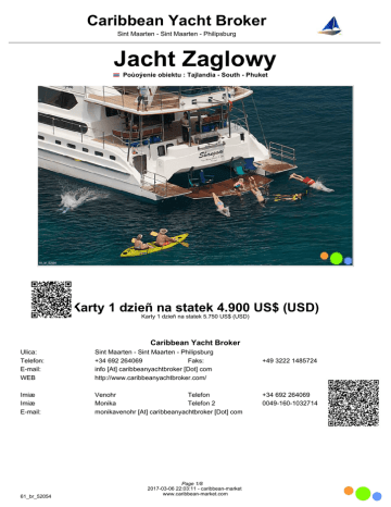 Caribbean Yacht Broker Sint Maarten - Sint Maarten - Philipsburg Jacht Zaglowy Poùoýenie obiektu : Tajlandia - South - Phuket Karty 1 dzieñ na statek 4.900 US$ (USD) Karty 1 dzieñ na statek 5.750 US$ (USD) Caribbean Yacht Broker Ulica: Telefon: E-mail: WEB Sint Maarten - Sint Maarten - Philipsburg +34 692 264069 Faks: info [At] caribbeanyachtbroker [Dot] com http://www.caribbeanyachtbroker.com/ Imiæ Imiæ E-mail: Venohr Telefon Monika Telefon 2 monikavenohr [At] caribbeanyachtbroker [Dot] com 61_br_52054 Page 1/8 2017-03-06 22:03:11 - caribbean-market www.caribbean-market.com +49 3222 1485724 +34 692 264069 0049-160-1032714 Caribbean Yacht Broker Sint Maarten - Sint Maarten - Philipsburg Obszaru Karty / Obszar handlowy Specjaùy Basen & Snorkeling Kraj i ludzie Aktywne wakacje Nurkowanie Typ ùodzi Numer kodu Typ ùodzi Model Designer Stan Materiaù Olinowanie Rok Dùugoúã LOA Szkic 61_br_52054 Numer kodu Zgùoú CSF Slup 2008 70,00 5,00 Ksztaùt kadùuba Kokpit Kolor Szerokoúã Producent: Katamaran Centrum kokpicie Kontrola 0,00 Dane na temat silnika Producent Prowadziã Liczba Model Paliwo: Wydajnoúã Sprzæt >9 Kabiny >9 Koje >5 Toalety Wùaúciciele kabiny Spiýarnia Lodówka Kamizelki ratunkowe Liferaft 61_br_52054 Compass GPS Anemometr Sonar Radar VHF El Autopilot Fishfinder Page 2/8 2017-03-06 22:03:11 - caribbean-market www.caribbean-market.com Winda kotwiczna Kàpieliska Ùódki Ùódki m. AB Odtwarzacz CD Radio Telewizja Systemu 12 V DC Caribbean Yacht Broker Sint Maarten - Sint Maarten - Philipsburg 61_br_52054 Page 3/8 2017-03-06 22:03:11 - caribbean-market www.caribbean-market.com Caribbean Yacht Broker Sint Maarten - Sint Maarten - Philipsburg 61_br_52054 Page 4/8 2017-03-06 22:03:11 - caribbean-market www.caribbean-market.com Caribbean Yacht Broker Sint Maarten - Sint Maarten - Philipsburg 61_br_52054 Page 5/8 2017-03-06 22:03:11 - caribbean-market www.caribbean-market.com Caribbean Yacht Broker Sint Maarten - Sint Maarten - Philipsburg 61_br_52054 Page 6/8 2017-03-06 22:03:11 - caribbean-market www.caribbean-market.com Caribbean Yacht Broker Sint Maarten - Sint Maarten - Philipsburg 61_br_52054 Page 7/8 2017-03-06 22:03:11 - caribbean-market www.caribbean-market.com Caribbean Yacht Broker Sint Maarten - Sint Maarten - Philipsburg 61_br_52054 Page 8/8 2017-03-06 22:03:11 - caribbean-market www.caribbean-market.com