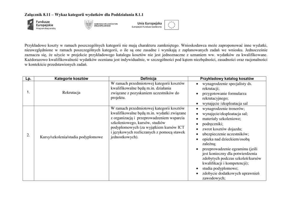 Załącznik 8.11 – Wykaz kategorii wydatków dla Poddziałania 8.1.1 Przykładowe koszty w ramach poszczególnych kategorii nie mają charakteru zamkniętego. Wnioskodawca może zaproponować inne wydatki, nieuwzględnione w ramach poszczególnych kategorii, o ile są one zasadne i wynikają z zaplanowanych zadań we wniosku. Jednocześnie zaznacza się, że użycie w projekcie przykładowego katalogu kosztów nie jest jednoznaczne z uznaniem ww. wydatków za kwalifikowane. Każdorazowo kwalifikowalność wydatków oceniana jest indywidualnie, w szczególności pod kątem niezbędności, zasadności oraz racjonalności w kontekście przedstawionych zadań. Lp. 1. 2. Kategorie kosztów Rekrutacja Kursy/szkolenia/studia podyplomowe Definicja W ramach przedmiotowej kategorii kosztów kwalifikowalne będą m.in. działania związane z pozyskaniem uczestników do projektu. W ramach przedmiotowej kategorii kosztów kwalifikowalne będą m.in. wydatki związane z organizacją i przeprowadzeniem wsparcia szkoleniowego, kursów, studiów podyplomowych (za wyjątkiem kursów ICT i językowych rozliczanych z pomocą stawek jednostkowych). Przykładowy katalog kosztów wynagrodzenie specjalisty ds. rekrutacji; przygotowanie formularza rekrutacyjnego; wynajęcie /eksploatacja sal wynagrodzenie trenerów; wynajęcie/eksploatacja sal; materiały szkoleniowe; podręczniki; zwrot kosztów dojazdu; ubezpieczenie uczestników; opieka nad dzieckiem/osobą zależną; przeprowadzenie egzaminu (jeśli jest konieczny dla potwierdzenia zdobytych podczas szkoleń/kursów kwalifikacji i kompetencji); studia podyplomowe; zdobycie dodatkowych uprawnień zawodowych; W ramach przedmiotowej kategorii kosztów kwalifikowalne będą m.in. wydatki związane z dostosowaniem/ modernizacją budynków i pomieszczeń do wymogów sanitarnych i BHP, organizacja kuchni, stołówek, sanitariatów, szatni, itp. Ponadto w ramach przedmiotowej kategorii należy wykazywać wydatki związane z dostosowaniem/ modernizacją budynków i pomieszczeń do potrzeb osób niepełnosprawnych. 3. Dostosowanie / modernizacja budynków i pomieszczeń W ramach przedmiotowej kategorii kosztów kwalifikowalne będą m.in. wydatki związane z wyposażeniem pomieszczeń w sprzęt umożliwiający właściwe prowadzenie edukacji przedszkolnej. wydanie świadectwa/certyfikatu potwierdzającego kwalifikacje prace adaptacyjne/modernizacyjne, tj. m.in. malowanie, tapetowanie, kładzenie podłogi, montaż sanitariatów, przebudowa i modernizacja istniejącej instalacji (wod.-kan., elektrycznej, c.o., gazowej), stawianie ścianek działowych, zakup wyposażenia kuchni, stołówek, sanitariatów, szatni, wyposażenie zapewniające bezpieczne warunki opieki nad dziećmi, tj. m.in. zabezpieczenia gniazdek elektrycznych, zabezpieczenia kątowe mebli, zabezpieczenia grzejników, oznaczenia ewakuacyjne; prace adaptacyjne/modernizacyjne związane z potrzebami osób niepełnosprawnych, tj. m.in. montaż szyn najazdowych, podjazdów, platform, wind, schodołazów, udogodnień sanitarnych, poszerzanie wejść/futryn koszty zakupu wyposażenia ośrodków wychowania przedszkolnego m.in. regałów, szaf, łóżek, leżaków, stołów, krzeseł, puf, pościeli, poduszek, kołder, koców 4. Meble i wyposażenie 5. W ramach przedmiotowej kategorii kosztów kwalifikowane będą wydatki związane z zakupem oraz montażem sprzętu TIK kwalifikowane jako środki trwałe. W ramach przedmiotowej kategorii kosztów kwalifikowane będą wydatki związane z zakupem oraz montażem sprzętu TIK. Sprzęt TIK (środki trwałe) itp.; koszt wyposażenia miejsc pracy (biurko, fotel, szafa, nadstawka na szafę); montaż mebli i wyposażenia; inne wyposażenie niezbędne do realizacji projektu sprzęt informatyczny i telekomunikacyjny w tym: komputer wraz z oprogramowaniem; monitor; tablica interaktywna wraz z oprogramowaniem; drukarka; kserokopiarka; skaner; rzutnik multimedialny; ekran; oprogramowanie niezbędne do realizacji założeń merytorycznych projektu; koszty związane z montażem oraz doprowadzeniem do prawidłowego funkcjonowania ww. sprzętu sprzęt informatyczny i telekomunikacyjny w tym: monitor; drukarka; 6. 7. Sprzęt TIK Sprzęt audiowizualny W ramach przedmiotowej kategorii kosztów kwalifikowane będą m.in. wydatki związane z zakupem sprzętu audiowizualnego na potrzeby prowadzenia działań projektu. W ramach przedmiotowej kategorii kosztów kwalifikowane będą m.in. wydatki związane z zatrudnieniem personelu, wyżywienia, kosztami eksploatacyjnymi, czynszem, opłatami za media, środkami czystości itd. 8. Bieżące funkcjonowanie skaner; rzutnik multimedialny; ekran; oprogramowanie niezbędne do realizacji założeń merytorycznych projektu; koszty związane z montażem oraz doprowadzeniem do prawidłowego funkcjonowania ww. sprzętu telewizor; odtwarzacz DVD; radio z odtwarzaczem CD; dyktafon; kamera; aparat fotograficzny wynagrodzenie opiekunów/nauczycieli i personelu zatrudnionego w ośrodkach sprawujących opiekę nad dziećmi, w szczególności: wynagrodzenie opiekuna/ nauczyciela; wynagrodzenie pomocy opiekuna/nauczyciela; wynagrodzenie innych osób, jeśli ich zatrudnienie jest niezbędne dla prawidłowego funkcjonowania miejsca wychowania dzieci (w tym psychologów, logopedów, personelu pedagogicznego, personelu W ramach przedmiotowej kategorii kosztów kwalifikowane będą m.in. wydatki związane z prowadzeniem dodatkowych zajęć zwiększających szanse edukacyjne dzieci w zakresie stwierdzonych deficytów oraz w celu podnoszenia jakości edukacji przedszkolnej. 9. Zajęcia dodatkowe dla dzieci i młodzieży medycznego); dojazd dzieci; żywienie dzieci: catering; artykuły żywnościowe; wynagrodzenie osoby przygotowującej posiłki dla dzieci; inne wydatki poniesione na cele działalności placówki, przyczyniające się do realizacji celów projektu wynagrodzenie prowadzących zajęcia; wynajęcie / eksploatacji sali; materiały pomocnicze; podręczni