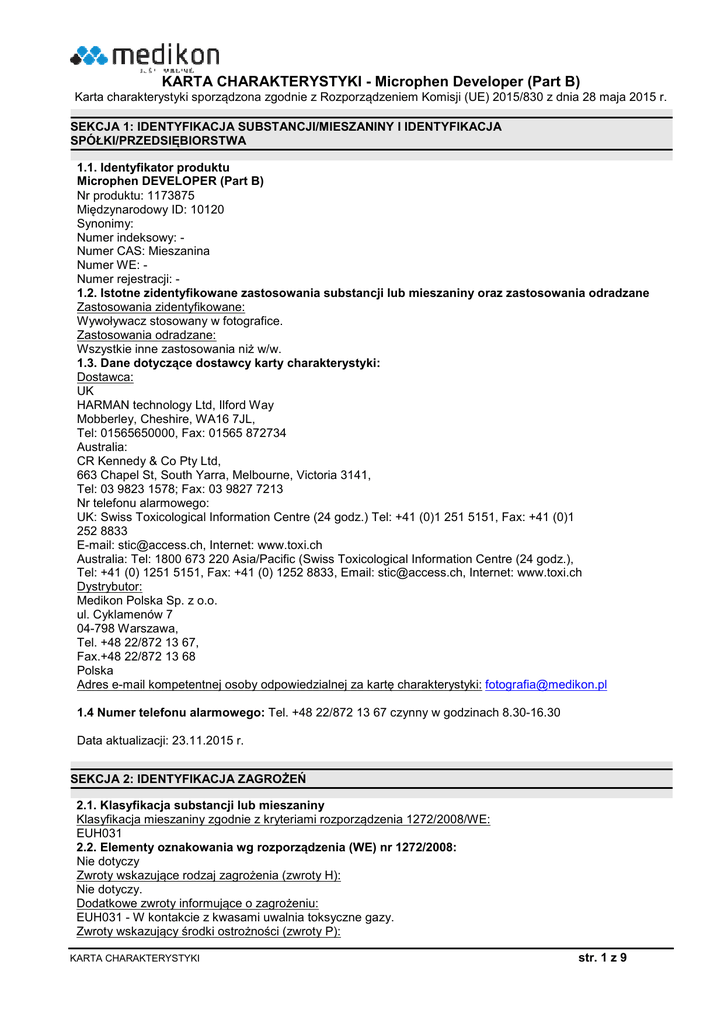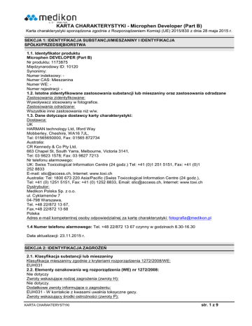 KARTA CHARAKTERYSTYKI - Microphen Developer (Part B) Karta charakterystyki sporządzona zgodnie z Rozporządzeniem Komisji (UE) 2015/830 z dnia 28 maja 2015 r. SEKCJA 1: IDENTYFIKACJA SUBSTANCJI/MIESZANINY I IDENTYFIKACJA SPÓŁKI/PRZEDSIĘBIORSTWA 1.1. Identyfikator produktu Microphen DEVELOPER (Part B) Nr produktu: 1173875 Międzynarodowy ID: 10120 Synonimy: Numer indeksowy: Numer CAS: Mieszanina Numer WE: Numer rejestracji: 1.2. Istotne zidentyfikowane zastosowania substancji lub mieszaniny oraz zastosowania odradzane Zastosowania zidentyfikowane: Wywoływacz stosowany w fotografice. Zastosowania odradzane: Wszystkie inne zastosowania niż w/w. 1.3. Dane dotyczące dostawcy karty charakterystyki: Dostawca: UK HARMAN technology Ltd, Ilford Way Mobberley, Cheshire, WA16 7JL, Tel: 01565650000, Fax: 01565 872734 Australia: CR Kennedy & Co Pty Ltd, 663 Chapel St, South Yarra, Melbourne, Victoria 3141, Tel: 03 9823 1578; Fax: 03 9827 7213 Nr telefonu alarmowego: UK: Swiss Toxicological Information Centre (24 godz.) Tel: +41 (0)1 251 5151, Fax: +41 (0)1 252 8833 E-mail: [email protected], Internet: www.toxi.ch Australia: Tel: 1800 673 220 Asia/Pacific (Swiss Toxicological Information Centre (24 godz.), Tel: +41 (0) 1251 5151, Fax: +41 (0) 1252 8833, Email: [email protected], Internet: www.toxi.ch Dystrybutor: Medikon Polska Sp. z o.o. ul. Cyklamenów 7 04-798 Warszawa, Tel. +48 22/872 13 67, Fax.+48 22/872 13 68 Polska Adres e-mail kompetentnej osoby odpowiedzialnej za kartę charakterystyki: [email protected] 1.4 Numer telefonu alarmowego: Tel. +48 22/872 13 67 czynny w godzinach 8.30-16.30 Data aktualizacji: 23.11.2015 r. SEKCJA 2: IDENTYFIKACJA ZAGROŻEŃ 2.1. Klasyfikacja substancji lub mieszaniny Klasyfikacja mieszaniny zgodnie z kryteriami rozporządzenia 1272/2008/WE: EUH031 2.2. Elementy oznakowania wg rozporządzenia (WE) nr 1272/2008: Nie dotyczy Zwroty wskazujące rodzaj zagrożenia (zwroty H): Nie dotyczy. Dodatkowe zwroty informujące o zagrożeniu: EUH031 - W kontakcie z kwasami uwalnia toksyczne gazy. Zwroty wskazujący środki ostrożności (zwroty P): KARTA CHARAKTERYSTYKI str. 1 z 9 KARTA CHARAKTERYSTYKI - Microphen Developer (Part B) Karta charakterystyki sporządzona zgodnie z Rozporządzeniem Komisji (UE) 2015/830 z dnia 28 maja 2015 r. SEKCJA 2: IDENTYFIKACJA ZAGROŻEŃ P102 - Chronić przed dziećmi. P260 - Nie wdychać pyłu. 2.3. Inne zagrożenia: Rezultaty oceny PBT i vPvB. - Nie ma danych. SEKCJA 3: SKŁAD/INFORMACJA O SKŁADNIKACH 3.1. Substancje Nie dotyczy 3.2. Mieszaniny Mieszanina niżej wymienionych składników. Dekahydrat tetraboranu disodu (10-Hydrat heptaoksotetraboranu sodu) Zawartość: <8,5% wag. Numer indeksowy: 005-011-01-1 Numer CAS: 1303-96-4 Numer WE: 215-540-4 Numer rejestracji: Klasyfikacja zgodna z kryteriami rozporządzenia (WE) nr 1272/2008: Repr. 1B; H360FD Niebezpieczeństwo W sekcji 16 podano znaczenie zwrotów H oraz kategorii i klas zagrożenia. SEKCJA 4: PIERWSZA POMOC 4.1. Opis środków pierwszej pomocy Wdychanie Natychmiast wyprowadzić lub wynieść poszkodowanego na świeże powietrze. Zapewnić poszkodowanemu warunki do odpoczynku oraz ciepło i spokój. Jeśli objawy zatrucia nie ustępują skonsultować się z lekarzem. Połknięcie Niezwłocznie odsunąć poszkodowanego od źródła narażenia. Dokładnie wypłukać usta. Osobie nieprzytomnej NIGDY nie podawać niczego do picia, ani nie wywoływać wymiotów. Zapewnić poszkodowanemu warunki do odpoczynku oraz ciepło i spokój. Nie wywoływać wymiotów bez uprzedniego zalecenia przez lekarza. Niezwłocznie zasięgnąć porady lekarza. Kontakt ze skórą Zdjąć zanieczyszczoną odzież. Niezwłocznie dokładnie umyć skórę wodą z mydłem i spłukać. W przypadku utrzymującego się podrażnienia skontaktować się z lekarzem. Kontakt z oczami Odsunąć poszkodowanego od źródła narażenia. Usunąć soczewki kontaktowe, jeśli są i można je łatwo usunąć. Przy podwiniętych powiekach niezwłocznie przemyć oczy dużą ilością czystej bieżącej wody (przemywać, przez co najmniej 15 minut). Zasięgnąć porady lekarza w przypadku utrzymywania się cech podrażnienia oczu. 4.2. Najważniejsze ostre i opóźnione objawy oraz skutki narażenia Główne drogi narażenia: Narażenie inhalacyjne, połknięcie, kontakt ze skórą, z oczami. Skutki narażenia ostrego: Może spowodować przejściowe podrażnienie oczu. Pył może działać drażniąco na skórę. Pył może działać drażniąco na drogi oddechowe i płuca. Może spowodować zaburzenia pokarmowe po połknięciu. Patrz także sekcja 11. Skutki narażenia przewlekłego: Może powodować przewlekłe podrażnienie oczu w następstwie powtarzanego kontaktu. Patrz także sekcja 11. 4.3. Wskazania dotyczące wszelkiej natychmiastowej pomocy lekarskiej i szczególnego postępowania KARTA CHARAKTERYSTYKI str. 2 z 9 KARTA CHARAKTERYSTYKI - Microphen Developer (Part B) Karta charakterystyki sporządzona zgodnie z Rozporządzeniem Komisji (UE) 2015/830 z dnia 28 maja 2015 r. SEKCJA 4: PIERWSZA POMOC z poszkodowanym Wskazówki dla lekarza SEKCJA 5: POSTĘPOWANIE W PRZYPADKU POŻARU 5.1. Środki gaśnicze Odpowiednie środki gaśnicze: Produkt nie jest palny. Pożar gasić za pomocą powszechnie stosowanych środków gaśniczych. Niewłaściwe środki gaśnicze: W zależności od otoczenia i palących się materiałów. 5.2. Szczególne zagrożenia związane z substancją lub mieszaniną Podczas pożaru, po podgrzaniu wytwarzają się dymy zawierające toksyczne gazy, w tlenki siarki. Nie wdychać dymów i gazów wytwarzających się podczas pożaru. Patrz także sekcja 9. 5.3. Informacje dla straży pożarnej W zależności od wielkości pożaru nosić odpowiednie środki ochrony dróg oddechowych z niezależnym dopływem powietrza, rękawice ochronne, okulary ochronne, maski, buty itp. Pożar gasić z wiatrem. Zużyte środki gaśnicze i zanieczyszczoną glebę zebrać i usunąć zgodnie z obowiązującymi przepisami SE