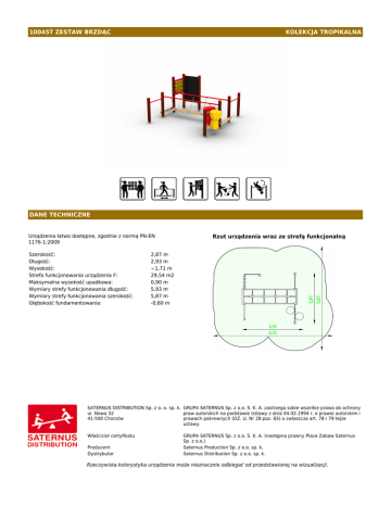 10045T ZESTAW BRZDĄC KOLEKCJA TROPIKALNA DANE TECHNICZNE Urządzenia łatwo dostępne, zgodnie z normą PN-EN 1176-1:2009 Szerokość: Długość: Wysokość: Strefa funkcjonowania urządzenia F: Maksymalna wysokość upadkowa: Wymiary strefy funkcjonowania długość: Wymiary strefy funkcjonowania szerokość: Głębokość fundamentowania: Rzut urządzenia wraz ze strefą funkcjonalną 2,87 m 2,93 m ~1,71 m 29,54 m2 0,90 m 5,93 m 5,87 m -0,60 m SATERNUS DISTRIBUTION Sp. z o. o. sp. k. GRUPA SATERNUS Sp. z o.o. S. K. A. zastrzega sobie wszelkie prawa do ochrony ul. Nowa 32 praw autorskich na podstawie Ustawy z dnia 04.02.1994 r. o prawie autorskim i 41-500 Chorzów prawach pokrewnych (DZ. U. Nr 28 poz. 83) a zwłaszcza art. 78 i 79 tejże ustawy. Właściciel certyfikatu Producent Dystrybutor GRUPA SATERNUS Sp. z o.o. S. K. A. (następna prawny Place Zabaw Saternus Sp. z o.o.) Saternus Production Sp. z o.o. sp. k. Saternus Distribution Sp. z o.o. sp. k. Rzeczywista kolorystyka urządzenia może nieznacznie odbiegać od przedstawionej na wizualizacji. Widok urządzenia Urządzenie wykonane zgodnie z PN-EN 1176:1-2009 Wyposażenie placów zabaw. Ogólne wymagania bezpieczeństwa i metody badań. Nawierzchnie amoryzujące: trawa, piasek, żwir, kora, nawierzchnia synetyczna (grubość minimalna dla wszystkich nawierzchni sypkich 200mm) SATERNUS DISTRIBUTION Sp. z o. o. sp. k. GRUPA SATERNUS Sp. z o.o. S. K. A. zastrzega sobie wszelkie prawa do ochrony ul. Nowa 32 praw autorskich na podstawie Ustawy z dnia 04.02.1994 r. o prawie autorskim i 41-500 Chorzów prawach pokrewnych (DZ. U. Nr 28 poz. 83) a zwłaszcza art. 78 i 79 tejże ustawy. Właściciel certyfikatu Producent Dystrybutor GRUPA SATERNUS Sp. z o.o. S. K. A. (następna prawny Place Zabaw Saternus Sp. z o.o.) Saternus Production Sp. z o.o. sp. k. Saternus Distribution Sp. z o.o. sp. k. Rzeczywista kolorystyka urządzenia może nieznacznie odbiegać od przedstawionej na wizualizacji. SKŁAD URZĄDZENIA Gra integracyjna "Kółko i Krzyżyk": Mały zestaw do przewrotów: Pomost ruchomy, dł. 228cm: Tablica rysunkowa: Tam-Tam mały: MATERIAŁY 1 2 1 1 1 Bębenki: Elementy stalowe: Fundamenty: Kotwy: Kółko i krzyżyk: Nogi konstrukcyjne: Tablica rysunkowa: Zaślepki: Łańcuch: wykonane z polipropylenu stal cynkowana cynkoprimem, malowana proszkowo beton klasy min. C12/15 stal ocynkowana kąpielowo walce polipropylenowe, malowane w technice sitodruku wykonane z drewna klejonego trójwarstwowo, malowanego lakierobejcą na kolor ciemny orzech, zaokrąglonego na krawędziach, o przekroju 90 x 90 mm sklejka wodoodporna szalunkowa gr. 15mm, malowana farbą tablicową tworzywo sztuczne stal ocynkowana kąpielowo SATERNUS DISTRIBUTION Sp. z o. o. sp. k. GRUPA SATERNUS Sp. z o.o. S. K. A. zastrzega sobie wszelkie prawa do ochrony ul. Nowa 32 praw autorskich na podstawie Ustawy z dnia 04.02.1994 r. o prawie autorskim i 41-500 Chorzów prawach pokrewnych (DZ. U. Nr 28 poz. 83) a zwłaszcza art. 78 i 79 tejże ustawy. Właściciel certyfikatu Producent Dystrybutor GRUPA SATERNUS Sp. z o.o. S. K. A. (następna prawny Place Zabaw Saternus Sp. z o.o.) Saternus Production Sp. z o.o. sp. k. Saternus Distribution Sp. z o.o. sp. k. Rzeczywista kolorystyka urządzenia może nieznacznie odbiegać od przedstawionej na wizualizacji.