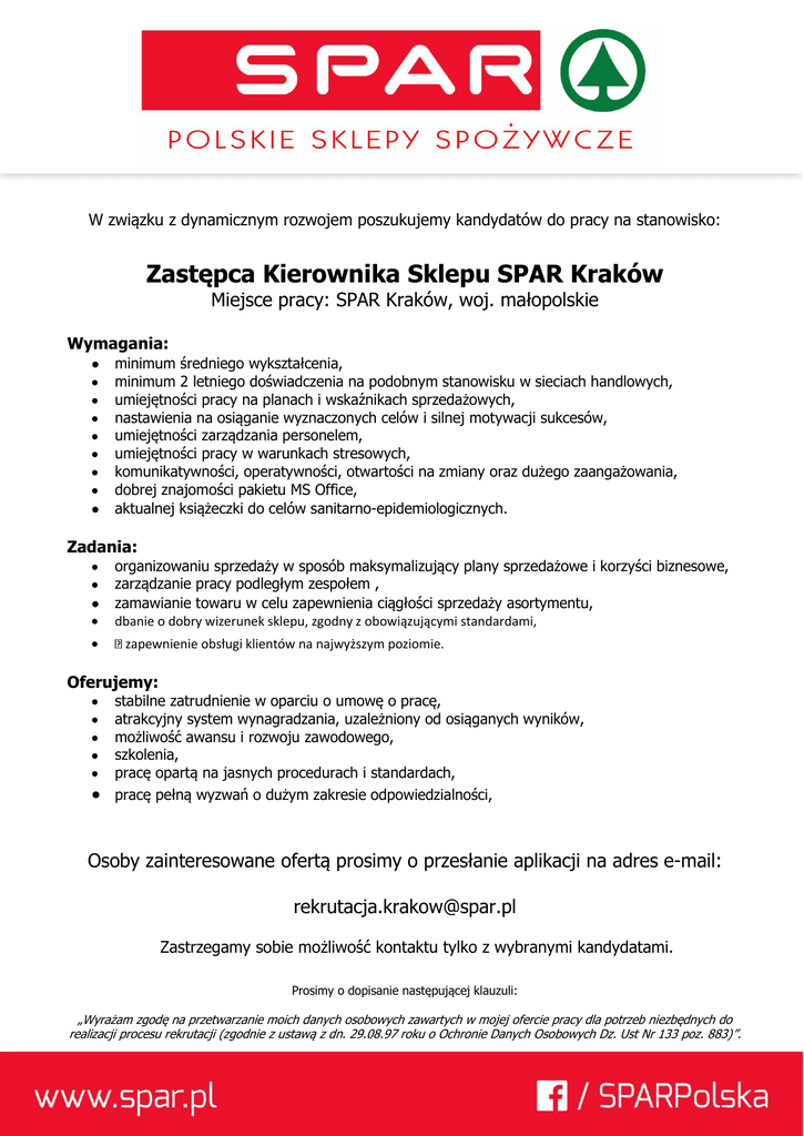W związku z dynamicznym rozwojem poszukujemy kandydatów do pracy na stanowisko: Zastępca Kierownika Sklepu SPAR Kraków Miejsce pracy: SPAR Kraków, woj. małopolskie Wymagania: minimum średniego wykształcenia, minimum 2 letniego doświadczenia na podobnym stanowisku w sieciach handlowych, umiejętności pracy na planach i wskaźnikach sprzedażowych, nastawienia na osiąganie wyznaczonych celów i silnej motywacji sukcesów, umiejętności zarządzania personelem, umiejętności pracy w warunkach stresowych, komunikatywności, operatywności, otwartości na zmiany oraz dużego zaangażowania, dobrej znajomości pakietu MS Office, aktualnej książeczki do celów sanitarno-epidemiologicznych. Zadania: organizowaniu sprzedaży w sposób maksymalizujący plany sprzedażowe i korzyści biznesowe, zarządzanie pracy podległym zespołem , zamawianie towaru w celu zapewnienia ciągłości sprzedaży asortymentu, dbanie o dobry wizerunek sklepu, zgodny z obowiązującymi standardami, zapewnienie obsługi klientów na najwyższym poziomie. Oferujemy: stabilne zatrudnienie w oparciu o umowę o pracę, atrakcyjny system wynagradzania, uzależniony od osiąganych wyników, możliwość awansu i rozwoju zawodowego, szkolenia, pracę opartą na jasnych procedurach i standardach, pracę pełną wyzwań o dużym zakresie odpowiedzialności, Osoby zainteresowane ofertą prosimy o przesłanie aplikacji na adres e-mail: [email protected] Zastrzegamy sobie możliwość kontaktu tylko z wybranymi kandydatami. Prosimy o dopisanie następującej klauzuli: „Wyrażam zgodę na przetwarzanie moich danych osobowych zawartych w mojej ofercie pracy dla potrzeb niezbędnych do realizacji procesu rekrutacji (zgodnie z ustawą z dn. 29.08.97 roku o Ochronie Danych Osobowych Dz. Ust Nr 133 poz. 883)”.