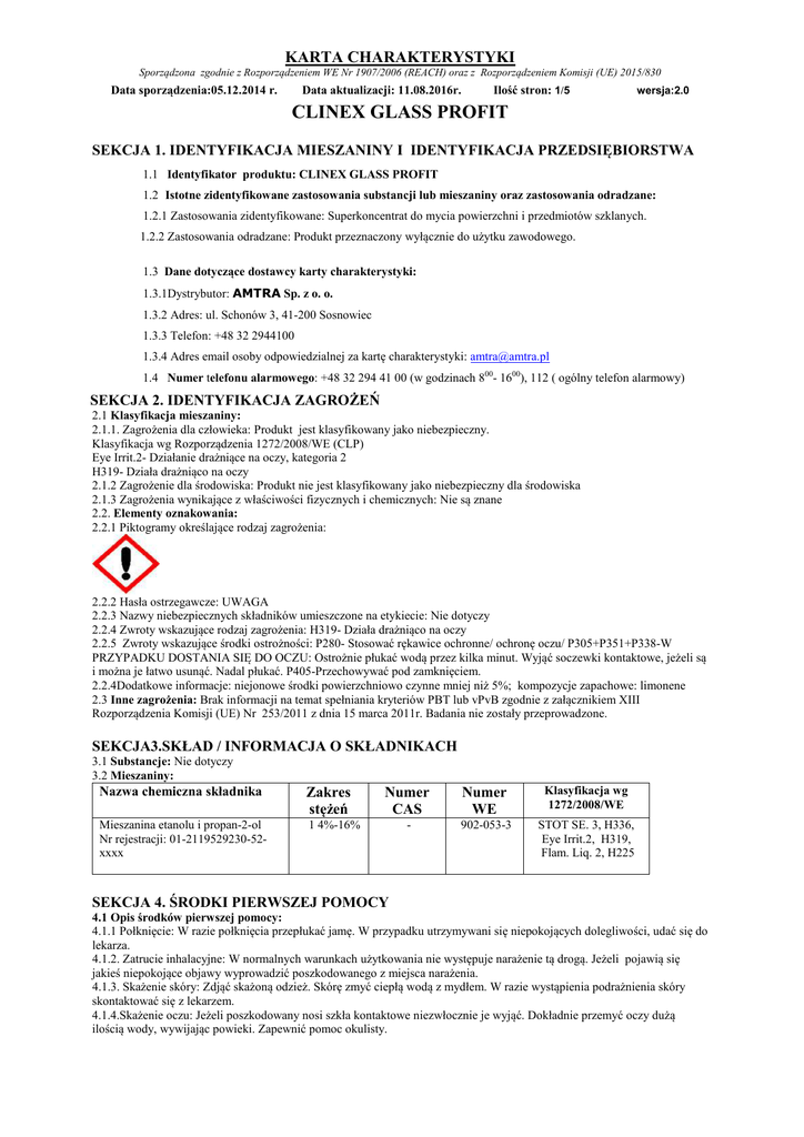 KARTA CHARAKTERYSTYKI Sporządzona zgodnie z Rozporządzeniem WE Nr 1907/2006 (REACH) oraz z Rozporządzeniem Komisji (UE) 2015/830 Data sporządzenia:05.12.2014 r. Data aktualizacji: 11.08.2016r. Ilość stron: 1/5 wersja:2.0 CLINEX GLASS PROFIT SEKCJA 1. IDENTYFIKACJA MIESZANINY I IDENTYFIKACJA PRZEDSIĘBIORSTWA 1.1 Identyfikator produktu: CLINEX GLASS PROFIT 1.2 Istotne zidentyfikowane zastosowania substancji lub mieszaniny oraz zastosowania odradzane: 1.2.1 Zastosowania zidentyfikowane: Superkoncentrat do mycia powierzchni i przedmiotów szklanych. 1.2.2 Zastosowania odradzane: Produkt przeznaczony wyłącznie do użytku zawodowego. 1.3 Dane dotyczące dostawcy karty charakterystyki: 1.3.1Dystrybutor: AMTRA Sp. z o. o. 1.3.2 Adres: ul. Schonów 3, 41-200 Sosnowiec 1.3.3 Telefon: +48 32 2944100 1.3.4 Adres email osoby odpowiedzialnej za kartę charakterystyki: [email protected] 1.4 Numer telefonu alarmowego: +48 32 294 41 00 (w godzinach 800- 1600), 112 ( ogólny telefon alarmowy) SEKCJA 2. IDENTYFIKACJA ZAGROŻEŃ 2.1 Klasyfikacja mieszaniny: 2.1.1. Zagrożenia dla człowieka: Produkt jest klasyfikowany jako niebezpieczny. Klasyfikacja wg Rozporządzenia 1272/2008/WE (CLP) Eye Irrit.2- Działanie drażniące na oczy, kategoria 2 H319- Działa drażniąco na oczy 2.1.2 Zagrożenie dla środowiska: Produkt nie jest klasyfikowany jako niebezpieczny dla środowiska 2.1.3 Zagrożenia wynikające z właściwości fizycznych i chemicznych: Nie są znane 2.2. Elementy oznakowania: 2.2.1 Piktogramy określające rodzaj zagrożenia: 2.2.2 Hasła ostrzegawcze: UWAGA 2.2.3 Nazwy niebezpiecznych składników umieszczone na etykiecie: Nie dotyczy 2.2.4 Zwroty wskazujące rodzaj zagrożenia: H319- Działa drażniąco na oczy 2.2.5 Zwroty wskazujące środki ostrożności: P280- Stosować rękawice ochronne/ ochronę oczu/ P305+P351+P338-W PRZYPADKU DOSTANIA SIĘ DO OCZU: Ostrożnie płukać wodą przez kilka minut. Wyjąć soczewki kontaktowe, jeżeli są i można je łatwo usunąć. Nadal płukać. P405-Przechowywać pod zamknięciem. 2.2.4Dodatkowe informacje: niejonowe środki powierzchniowo czynne mniej niż 5%; kompozycje zapachowe: limonene 2.3 Inne zagrożenia: Brak informacji na temat spełniania kryteriów PBT lub vPvB zgodnie z załącznikiem XIII Rozporządzenia Komisji (UE) Nr 253/2011 z dnia 15 marca 2011r. Badania nie zostały przeprowadzone. SEKCJA3.SKŁAD / INFORMACJA O SKŁADNIKACH 3.1 Substancje: Nie dotyczy 3.2 Mieszaniny: Nazwa chemiczna składnika Zakres stężeń Mieszanina etanolu i propan-2-ol Nr rejestracji: 01-2119529230-52xxxx 1 4%-16% Numer CAS Numer WE Klasyfikacja wg 1272/2008/WE - 902-053-3 STOT SE. 3, H336, Eye Irrit.2, H319, Flam. Liq. 2, H225 SEKCJA 4. ŚRODKI PIERWSZEJ POMOCY 4.1 Opis środków pierwszej pomocy: 4.1.1 Połknięcie: W razie połknięcia przepłukać jamę. W przypadku utrzymywani się niepokojących dolegliwości, udać się do lekarza. 4.1.2. Zatrucie inhalacyjne: W normalnych warunkach użytkowania nie występuje narażenie tą drogą. Jeżeli pojawią się jakieś niepokojące objawy wyprowadzić poszkodowanego z miejsca narażenia. 4.1.3. Skażenie skóry: Zdjąć skażoną odzież. Skórę zmyć ciepłą wodą z mydłem. W razie wystąpienia podrażnienia skóry skontaktować się z lekarzem. 4.1.4.Skażenie oczu: Jeżeli poszkodowany nosi szkła kontaktowe niezwłocznie je wyjąć. Dokładnie przemyć oczy dużą ilością wody, wywijając powieki. Zapewnić pomoc okulisty. KARTA CHARAKTERYSTYKI Sporządzona zgodnie z Rozporządzeniem WE Nr 1907/2006 (REACH) oraz z Rozporządzeniem Komisji (UE) 2015/830 Data sporządzenia:05.12.2014 r. Data aktualizacji: 11.08.2016r. Ilość stron: 2/5 wersja:2.0 CLINEX GLASS PROFIT Uwaga: osoby narażone na skażenie oczu powinny być pouczone o konieczności i sposobie natychmiastowego płukania oczu 4.2 Najważniejsze ostre i opóźnione objawy oraz skutki narażenia: 4.2.1 Skażenie oczu: Może wystąpić podrażnienie, zaczerwienienie oraz łzawienie 4.2.2 Połknięcie: Mogą pojawić się mdłości, wymioty oraz ból brzucha 4.3 Wskazania dotyczące wszelkiej natychmiastowej pomocy lekarskiej i szczególnego postępowania z poszkodowanym: Podjąć leczenie objawowe. SEKCJA 5. POSTĘPOWANIE W PRZYPADKU POŻARU 5.1 Środki gaśnicze: 5.1.1 Odpowiednie środki gaśnicze: Stosować powszechne środki gaśnicze; w zależności od otoczenia. 5.1.2 Niewłaściwe środki gaśnicze: Nie są znane. 5.2 Szczególne zagrożenia związane z mieszaniną: Nie są znane. Należy unikać wdychania produktów spalania. 5.3 Informacje dla straży pożarnej: Środki ochrony ogólnej typowe w przypadku pożaru. Nie należy przebywać w zagrożonej ogniem strefie bez odpowiedniego ubrania odpornego na chemikalia i aparatu do oddychania z niezależnym obiegiem powietrza. Zagrożone pożarem zbiorniki usunąć jeśli to możliwe i nie wiąże się z nadmiernym ryzykiem lub chłodzić rozpyloną wodą z odpowiedniej odległości. SEKCJA 6. POSTĘPOWANIE W PRZYPADKU NIEZAMIERZONEGO UWOLNIENIA DO ŚRODOWISKA 6.1 Indywidualne środki ostrożności, wyposażenie ochronne i procedury w sytuacjach awaryjnych: 6.1.1 Dla osób niezależących do personelu likwidującego skutki awarii: Ograniczyć dostęp osób postronnych do obszaru awarii do czasu usunięcia awarii. W przypadku dużych wycieków odizolować zagrożony obszar. Stosować środki ochrony indywidualnej. Unikać długotrwałego kontaktu ze skórą. Unikać kontaktu z oczami. Przestrzegać zasad i przepisów BHP obowiązujących przy pracy z preparatami chemicznymi. 6.1.2 Dla osób likwidujących skutki awarii: Usuwanie awarii i jej skutków może przeprowadzać wyłącznie przeszkolony personel. Stosować odzież ochronną na chemikalia. 6.2 Środki ostrożności w zakresie ochrony środowiska: Nie dopuścić do przedostania się do źródeł wody pitnej, gleby, kanalizacji. O ile to możliwe zlikwidować wyciek ( zamknąć dopływ cieczy, uszczelnić, uszkodzone opakowani