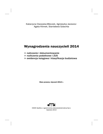 Katarzyna Cisowska-Mleczek, Agnieszka Jacewicz Agata Klimek, Stanisława Szlachta Wynagrodzenia nauczycieli 2014 4 naliczanie i dokumentowanie 4 rozliczenia podatkowe i ZUS 4 ewidencja ksiêgowa i klasyfikacja bud¿etowa Stan prawny: styczeń 2014 r. ODDK Spółka z ograniczoną odpowiedzialnością Sp.k. Gdańsk 2014 Spis treści Wykaz skrótów i pojęć stosowanych w publikacji . . . . . . . . . . . . . . . . . 9 Wstęp . . . . . . . . . . . . . . . . . . . . . . . . . . . . . . . . . . . . . . . . . 11 Rozdział 1. Zagadnienia wprowadzające . . . . . . . . . . . . . . . . . 1. Zatrudnianie nauczycieli . . . . . . . . . . . . . . . . . . . . . . . . 1.1. Stosunek pracy z nauczycielem – istota, zasady nawiązywania . 1.2. Stopnie awansu zawodowego . . . . . . . . . . . . . . . . . . . 1.3. Czas pracy nauczyciela – pensum . . . . . . . . . . . . . . . . 1.4. Ogólne zasady wynagradzania nauczycieli . . . . . . . . . . . . 1.4.1. Zmiana wysokości wynagrodzenia . . . . . . . . . . . . 1.4.2. Ograniczenie lub brak prawa do wynagrodzenia . . . . . 1.4.3. Zrzeczenie się wynagrodzenia . . . . . . . . . . . . . . . 2. Uregulowania prawne normujące kwestie wynagrodzeń osobowych nauczycieli oraz dodatkowych świadczeń wypłacanych na ich rzecz 2.1. Przepisy powszechnie obowiązujące . . . . . . . . . . . . . . . 2.2. Przepisy szczebla samorządowego . . . . . . . . . . . . . . . . . . . . . . . . . . . . . . . . . . . . . . . . . . . . . . . . . . . . . . . . . . . . . 13 13 13 20 21 25 28 30 32 . . . . . 33 . . . . . 33 . . . . . 35 Rozdział 2. Składniki wynagrodzenia osobowego nauczycieli za świadczoną pracę . . . . . . . . . . . . . . . . . . . . . . . . . . . . . 1. Wynagrodzenie zasadnicze . . . . . . . . . . . . . . . . . . . . . . . . 1.1. Ogólne zasady ustalania wynagrodzenia zasadniczego . . . . . . 1.2. Szczegółowe zasady ustalania i obliczania wynagrodzeń zasadniczych . . . . . . . . . . . . . . . . . . . . . . . . . . . . 1.2.1. Wynagrodzenie zasadnicze przy róŜnym pensum . . . . . 1.2.2. Wynagrodzenie za jedną godzinę przeliczeniową . . . . . 1.3. Zmiana wysokości wynagrodzenia zasadniczego . . . . . . . . . 1.4. Rozliczanie wysokości wynagrodzenia zasadniczego za czas niezdolności do pracy . . . . . . . . . . . . . . . . . . . . 2. Dodatek za wysługę lat, tzw. dodatek staŜowy . . . . . . . . . . . . . 2.1. Wysokość dodatku za wysługę lat dla nauczyciela zatrudnionego w dodatkowym miejscu pracy . . . . . . . . . . . . . . . . . . . 2.1.1. Zatrudnienie łączne powyŜej jednego etatu . . . . . . . . . 2.1.2. Zatrudnienie łącznie nieprzekraczające etatu . . . . . . . 2.2. Rozliczanie wysokości dodatku za wysługę lat za czas niezdolności do pracy . . . . . . . . . . . . . . . . . . . . 3. Dodatek funkcyjny . . . . . . . . . . . . . . . . . . . . . . . . . . . . 3.1. Zasady ustalania i obliczania dodatku funkcyjnego . . . . . . . . 3.2. Zasady wypłacania dodatku funkcyjnego . . . . . . . . . . . . . 3.3. Rozliczanie wysokości dodatku funkcyjnego za czas niezdolności do pracy . . . . . . . . . . . . . . . . . . . . 4. Dodatek motywacyjny . . . . . . . . . . . . . . . . . . . . . . . . . . 4.1. Zasady ustalania i obliczania dodatku motywacyjnego . . . . . . 4.2. Zasady wypłacania dodatku motywacyjnego . . . . . . . . . . . . 4.3. Rozliczanie wysokości dodatku motywacyjnego za czas niezdolności do pracy . . . . . . . . . . . . . . . . . . . . . . . . 41 . . . . 41 . . . . 41 . . . . . . . . . . . . . . . . 43 44 46 47 . . . . 50 . . . . 50 . . . . 51 . . . . 51 . . . . 52 . . . . . . . . . . . . . . . . 53 54 56 62 . . . . . . . . . . . . . . . . 63 64 67 68 . . . . 69 3 Spis treści 5. Dodatek specjalistyczny . . . . . . . . . . . . . . . . . . . . . . . . . . . . . 69 5.1. Zasady ustalania, obliczania oraz wypłacania dodatku specjalistycznego . . . . . . . . . . . . . . . . . . . . . . . . . . . . . . 70 5.2. Rozliczanie wysokości dodatku specjalistycznego za czas niezdolności do pracy . . . . . . . . . . . . . . . . . . . . . . . . 72 6. Dodatki za warunki pracy (trudne i uciąŜliwe) . . . . . . . . . . . . . . . . . 72 6.1. Zasady przyznawania dodatku za trudne warunki pracy . . . . . . . . . 73 6.2. Zasady przyznawania dodatku za uciąŜliwe warunki pracy . . . . . . . . 75 6.3. Zasady ustalania i obliczania dodatku za warunki pracy . . . . . . . . . 76 6.4. Zasady wypłacania dodatku za warunki pracy . . . . . . . . . . . . . . . 79 6.5. Rozliczanie wysokości dodatku za warunki pracy za czas niezdolności do pracy . . . . . . . . . . . . . . . . . . . . . . . . 81 7. Wynagrodzenie za godziny ponadwymiarowe i godziny doraźnych zastępstw . . . . . . . . . . . . . . . . . . . . . . . . . . . . . . . . . . . . . 83 7.1. Ogólne zasady obliczania wynagrodzenia za godziny ponadwymiarowe i doraźnych zastępstw . . . . . . . . . . . . . . . . . 85 7.2. Szczególne przypadki obliczania wynagrodzenia za godziny ponadwymiarowe i doraźnych zastępstw . . . . . . . . . . . . . . . . . 89 7.2.1. RóŜne pensa . . . . . . . . . . . . . . . . . . . . . . . . . . . . . 89 7.2.2. ZróŜnicowana liczba godzin w ciągu roku szkolnego . . . . . . . 91 7.2.3. PodwyŜszone pensum . . . . . . . . . . . . . . . . . . . . . . . . 92 7.2.4. Pomniejszanie liczby godzin ponadwymiarowych . . . . . . . . . 93 7.3. Zasady wypłacania wynagrodzenia za godziny ponadwymiarowe i doraźnych zastępstw . . . . . . . . . . . . . . . . . . . . . . . . . . . . 94 8. Dodatkowe wynagrodzenie za godziny nocne . . . . . . . . . . . . . . . . . . 94 9. Wynagrodzenie w dniu wolnym od pracy . . . . . . . . . . . . . . . . . . . . 97 10. Wynagrodzenie za pracę w święta . . . . . . . . . . . . . . . . . . . . . . . . 98 11. Wynagrodzenie dla egzaminatorów za udział w przeprowadzaniu sprawdzianu i egzaminów . . . . . . . . . . . . . . . . . . . . . . . . . . . . 99 11.1. Podstawa ustalania wynagrodzenia egzaminatora . . . . . . . . . . . . 99 11.2. Wynagrodzenie egzaminat