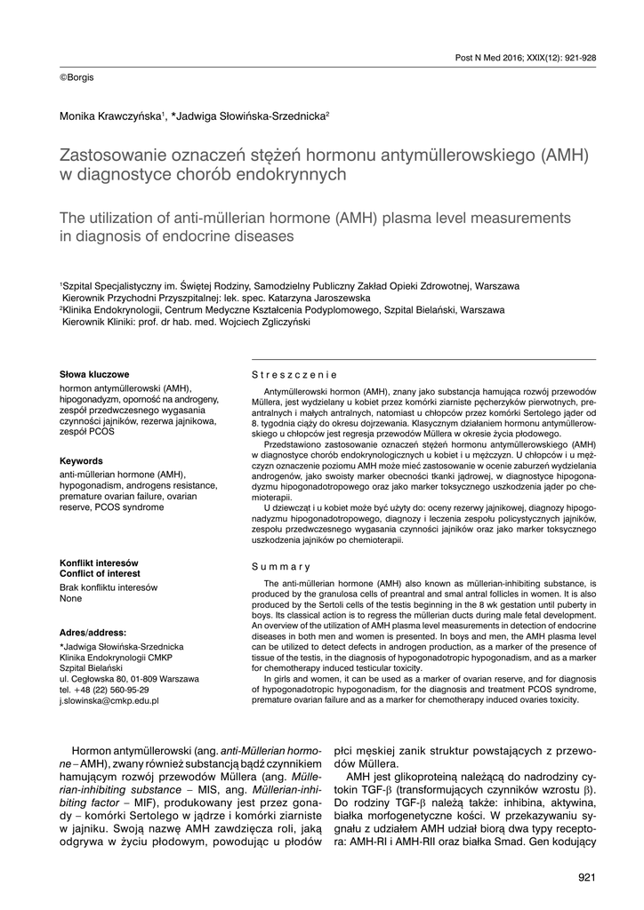 Post N Med 2016; XXIX(12): 921-928 ©Borgis Monika Krawczyńska1, *Jadwiga Słowińska-Srzednicka2 Zastosowanie oznaczeń stężeń hormonu antymüllerowskiego (AMH) w diagnostyce chorób endokrynnych The utilization of anti-müllerian hormone (AMH) plasma level measurements in diagnosis of endocrine diseases 1 Szpital Specjalistyczny im. Świętej Rodziny, Samodzielny Publiczny Zakład Opieki Zdrowotnej, Warszawa Kierownik Przychodni Przyszpitalnej: lek. spec. Katarzyna Jaroszewska 2 Klinika Endokrynologii, Centrum Medyczne Kształcenia Podyplomowego, Szpital Bielański, Warszawa Kierownik Kliniki: prof. dr hab. med. Wojciech Zgliczyński Słowa kluczowe Streszczenie hormon antymüllerowski (AMH), hipogonadyzm, oporność na androgeny, zespół przedwczesnego wygasania czynności jajników, rezerwa jajnikowa, zespół PCOS Antymüllerowski hormon (AMH), znany jako substancja hamująca rozwój przewodów Müllera, jest wydzielany u kobiet przez komórki ziarniste pęcherzyków pierwotnych, preantralnych i małych antralnych, natomiast u chłopców przez komórki Sertolego jąder od 8. tygodnia ciąży do okresu dojrzewania. Klasycznym działaniem hormonu antymüllerowskiego u chłopców jest regresja przewodów Müllera w okresie życia płodowego. Przedstawiono zastosowanie oznaczeń stężeń hormonu antymüllerowskiego (AMH) w diagnostyce chorób endokrynologicznych u kobiet i u mężczyzn. U chłopców i u mężczyzn oznaczenie poziomu AMH może mieć zastosowanie w ocenie zaburzeń wydzielania androgenów, jako swoisty marker obecności tkanki jądrowej, w diagnostyce hipogonadyzmu hipogonadotropowego oraz jako marker toksycznego uszkodzenia jąder po chemioterapii. U dziewcząt i u kobiet może być użyty do: oceny rezerwy jajnikowej, diagnozy hipogonadyzmu hipogonadotropowego, diagnozy i leczenia zespołu policystycznych jajników, zespołu przedwczesnego wygasania czynności jajników oraz jako marker toksycznego uszkodzenia jajników po chemioterapii. Keywords anti-müllerian hormone (AMH), hypogonadism, androgens resistance, premature ovarian failure, ovarian reserve, PCOS syndrome Konflikt interesów Conflict of interest Summary Brak konfliktu interesów None The anti-müllerian hormone (AMH) also known as müllerian-inhibiting substance, is produced by the granulosa cells of preantral and smal antral follicles in women. It is also produced by the Sertoli cells of the testis beginning in the 8 wk gestation until puberty in boys. Its classical action is to regress the müllerian ducts during male fetal development. An overview of the utilization of AMH plasma level measurements in detection of endocrine diseases in both men and women is presented. In boys and men, the AMH plasma level can be utilized to detect defects in androgen production, as a marker of the presence of tissue of the testis, in the diagnosis of hypogonadotropic hypogonadism, and as a marker for chemotherapy induced testicular toxicity. In girls and women, it can be used as a marker of ovarian reserve, and for diagnosis of hypogonadotropic hypogonadism, for the diagnosis and treatment PCOS syndrome, premature ovarian failure and as a marker for chemotherapy induced ovaries toxicity. Adres/address: *Jadwiga Słowińska-Srzednicka Klinika Endokrynologii CMKP Szpital Bielański ul. Cegłowska 80, 01-809 Warszawa tel. +48 (22) 560-95-29 [email protected] Hormon antymüllerowski (ang. anti-Müllerian hormone – AMH), zwany również substancją bądź czynnikiem hamującym rozwój przewodów Müllera (ang. Müllerian-inhibiting substance – MIS, ang. Müllerian-inhibiting factor – MIF), produkowany jest przez gonady – komórki Sertolego w jądrze i komórki ziarniste w jajniku. Swoją nazwę AMH zawdzięcza roli, jaką odgrywa w życiu płodowym, powodując u płodów płci męskiej zanik struktur powstających z przewodów Müllera. AMH jest glikoproteiną należącą do nadrodziny cytokin TGF-β (transformujących czynników wzrostu β). Do rodziny TGF-β należą także: inhibina, aktywina, białka morfogenetyczne kości. W przekazywaniu sygnału z udziałem AMH udział biorą dwa typy receptora: AMH-RI i AMH-RII oraz białka Smad. Gen kodujący 921 Monika Krawczyńska, Jadwiga Słowińska-Srzednicka AMH u ludzi zlokalizowany jest na chromosomie 19, a gen receptora typu 2 dla AMH na chromosomie 12. Mutacja w genie kodującym AMH lub receptor dla AMH może powodować obecność przetrwałych struktur z przewodów Müllera u osobników płci męskiej (1). Ekspresja i wydzielanie AMH jest hamowane przez androgeny i estrogeny. AMH W ŻYCIU PŁODOWYM U płodów obu płci znajdują się zawiązki struktur zarówno męskich, jak i żeńskich narządów płciowych – przewody okołośródnerczowe Müllera, z których u płodów żeńskich powstają jajowody, macica i 1/3 górna część pochwy, oraz przewody śródnerczowe Wolffa. Z przewodów Wolffa u płodów płci męskiej powstają: najądrza, nasieniowody, pęcherzyki nasienne, przewody wytryskowe oraz brzuszna część prostaty. Dopiero czynność gonad i działanie hormonów powodują różnicowanie struktur w odmiennym kierunku. U płodów płci męskiej w obecności prawidłowo funkcjonujących jąder już około 8. tygodnia życia płodowego zwiększa się wydzielania AMH w komórkach Sertolego. Jest to okres wrażliwości przewodów Müllera na działanie AMH. Maksymalną produkcję tego hormonu obserwuje się między 12. a 16. tygodniem życia płodowego. Obecność AMH warunkuje regresję (apoptozę) przewodów okołośródnerczowych (Müllera). Również od 8. tygodnia życia płodowego komórki Leydiga w jądrach stymulowane przez HCG wydzielają testosteron. Wysokie stężenia testosteronu są konieczne do przekształcenia przewodów Wolffa w męskie wewnętrzne narządy płciowe, a powstający z testosteronu (pod wpływem enzymu 5-α-reduktazy) dihydrotestosteron (DHT) jest niezbędny do ukształtowania męskich zewnętrznych narządów płciowy