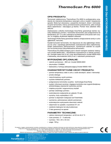 OPIS PRODUKTU: Termometr elektroniczny ThermoScan Pro 6000 to profesjonalne urządzenie do mierzenia temperatury wewnątrz ucha w szybki i bezpieczny sposób. Może być stosowany u pacjentów dorosłych, dzieci i niemowląt. Czujnik termometru mierzy promieniowanie podczerwone, jakie emituje błona bębenkowa i otaczająca ją tkanka. Pomiar trwa zaledwie kilka sekund. Zastosowana unikalna technologia ExacTemp gwarantuje bardzo wysoką dokładność pomiaru. Końcówka termometru jest podgrzewana do temperatury 35 °C w celu uniknięcia wychłodzenia ucha przez sam czujnik, co mogłoby skutkować błędami wskazań. Technologia PerfecTemp gwarantuje idealne umiejscowienie sondy w uchu (głębokość, kierunek). Kształt końcówki termometru nie dopuszcza do zbyt głębokiego włoże nia do ucha i zapobiega jakimkolwiek uszkodzeniom błony bębenkowej. Dzięki zastosowaniu jednorazowych, wymiennych osłonek na czujnik nie ma konieczności dezynfekowania termometru. ThermoScan Pro 6000 dostępny jest w dwóch wersjach zasilania: bateryjnym (model 06000-200) – standardowo wyposażonym w osłonki pomiarowe i komplet baterii AA (2 szt.) oraz akumulatorowym (model 06000-425) z ładowarką, akumulatorem AAA (2 szt.) i osłonkami pomiarowymi. WYPOSAZNIE OPCJONALNE: • osłonki pomiarowe – 800 szt. (model 06000-800) • akumulator (104894) • ładowarka z funkcją zabezpieczającą (model 06000-100) CHARAKTERYSTYCZNE CECHY PRODUKTU: • pomiar temperatury ciała w uchu u osób dorosłych, dzieci i niemowląt • prosta obsługa • natychmiastowy wynik pomiaru • wysoka dokładność pomiaru • podgrzewana końcówka czujnika - technologia ExacTemp • system informacji zwrotnej: migająca kontrolka oraz sygnał dźwiękowy potwierdzający poprawnie wykonany pomiar • miękkie przyciski i ergonomiczny kształt • pamięć ostatniego pomiaru • automatyczne wyłączanie po upływie 10 sek. • wyraźny, duży wyświetlacz LCD • pomiar w stopniach Celsjusza lub Farenheita • wymienne, jednorazowe osłonki pomiarowe • automatyczne wykrywanie obecności osłonki • odporność na upadek z wysokości 91 cm THERMOSCAN PRO 6000: 0316WER.02 • zasilanie bateryjne lub akumulatorowe • 3 lata gwarancji na aparat PARAMETRY TECHNICZNE: • zakres mierzonych temperatur: od 20 do 42,2 °C • czas pomiaru: 2 – 3 sekundy • wymiary: 152 x 44 x 33 mm • waga: 100 g W związku z ciągłym udoskonalaniem wyrobów, przedstawione w niniejszym materiale informacje oraz dane techniczne mają wyłącznie charakter orientacyjny i mogą ulec zmianie bez uprzedzenia. W celu zweryfikowania aktualności niniejszego materiału należy skontaktować się z przedstawicielem firmy Paramedica Polska Sp. z o.o. Sp.k. 02-815 Warszawa; ul. Żołny 11; tel: +48 22 313 09 39; www.paramedica.pl Powyższe zdjęcia, znaki firmowe oraz teksty należą do ich właścicieli. Zabrania się kopiowania i publikowania zdjęć i tekstów w całości i/lub części w internecie, prasie, mediach bez zgody na piśmie właścicieli. PARAMEDICA POLSKA Sp. z o.o. Sp.k. 02-815 Warszawa, ul. Żołny 11 tel. 22 313 09 39, fax 22 313 09 59 e-mail: [email protected] www.paramedica.pl TERMOMETR THERMOSCAN PRO 6000 ThermoScan Pro 6000