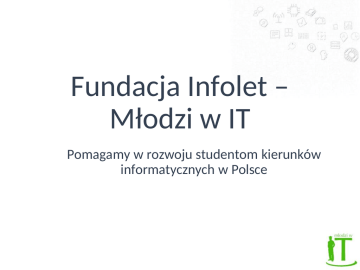 Fundacja Infolet – Młodzi w IT Pomagamy w rozwoju studentom kierunków informatycznych w Polsce Kim jesteśmy Od 2013 roku wspieramy studentów kierunków informatycznych w Polsce w zdobywaniu wiedzy w zakresie IT, poprzez: • przyznawanie i wypłacanie stypendiów naukowych • organizację, wspieranie i finansowanie kursów i szkoleń z IT dla studentów • pomoc w organizacji praktyk i staży w firmach IT Możliwości współpracy Stypendia 1 stypendium roczne wynosi 3800 PLN* Wypłacane przez 9 miesięcy roku akademickiego (od października do czerwca). Do 10-go każdego miesiąca, stypendium jest wypłacane na konto studenta w kwocie o wysokości 420 zł. * Względy podatkowe Możliwości współpracy Szkolenia Organizujemy szkolenia z IT dla studentów ponieważ uważamy, że w sektorze nowoczesnych technologii, najwięcej można nauczyć się od specjalistów z wieloletnim doświadczeniem. Masz pracowników, którzy lubią dzielić się wiedzą? To świetnie! Zróbmy razem wartościowe wydarzenie! Zorganizujemy miejsce, przeprowadzimy zapisy, wypromujemy wydarzenie w naszych kanałach mediów społecznościowych i na stronie. Jesteśmy otwarci na propozycje tematów i współpracy Możliwości współpracy praktyki Chcesz zorganizować praktyki? • Pomożemy dotrzeć do studentów • Stworzymy ogłoszenia, które wypromujemy wśród studentów • Możemy wstępnie przeselekcjonować zgłoszenia • Wesprzemy w kwestiach formalnych (szablony umów, porozumień w kwestii praktyk) Dlaczego warto nawiązać z nami współpracę? • Wpływasz na rozwój branży IT • Budujesz i umacniasz wizerunek firmy odpowiedzialnej społecznie • Budujesz wizerunek pracodawcy wśród potencjalnych pracowników • Masz możliwość dzielenia się wiedzą i doświadczeniem ze studentami • Masz możliwość prezentacji technologii i projektów, które rozwijacie Ile to kosztuje? Jesteśmy organizacją działającą non-profit, dlatego nie mamy ustalonego „cennika”. Utrzymujemy się z dowolnych i dobrowolnych darowizn od naszych Partnerów. Zarząd Fundacji jak i nasi wolontariusze nie pobierają żadnego wynagrodzenia za działania na rzecz Fundacji. Wydarzenia, które organizujemy dla studentów są dla nich bezpłatne. Nasze koszty stałe wynoszą około 300 zł miesięcznie. Kilka faktów • Działamy od 2013 roku • Do tej pory zorganizowaliśmy 20 wydarzeń, w tym szkolenia, konkursy, prelekcje, patronaty • Przyznaliśmy i wypłaciliśmy 5 rocznych stypendiów dla studentów i absolwentów kierunków informatycznych, o łącznej wysokości 19000 PLN • Naszą stronę odwiedza średnio 8000 użytkowników miesięcznie (liczba ta stale rośnie) • Facebook: 834 obserwujących, nasze posty mają zasięg do nawet 2300 osób miesięcznie (jest to zasięg organiczny, do tej pory nie korzystaliśmy z płatnych reklam na Facebooku). Kontakt Fundacja Infolet – Młodzi w IT Ul. Miłkowskiego 3/302 30 - 349 Kraków + 48 12 385 40 00 [email protected] www.mlodziwit.org