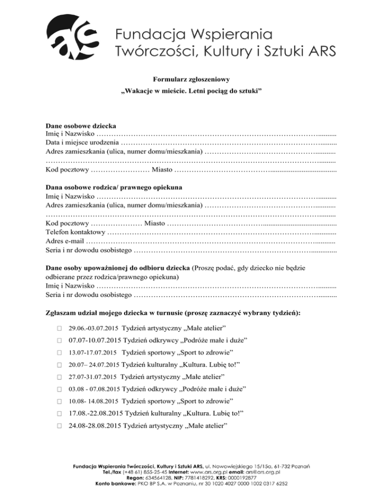 Formularz zgłoszeniowy „Wakacje w mieście. Letni pociąg do sztuki” Dane osobowe dziecka Imię i Nazwisko ……………………………………………………………………………….......... Data i miejsce urodzenia ………………………………………………………………………......... Adres zamieszkania (ulica, numer domu/mieszkania) ………………………………………........... …………………………………………………………………………………………………......... Kod pocztowy …………………… Miasto ………………………………….................................... Dana osobowe rodzica/ prawnego opiekuna Imię i Nazwisko ……………………………………………………………………………….......... Adres zamieszkania (ulica, numer domu/mieszkania) ………………………………………........... …………………………………………………………………………………………………......... Kod pocztowy ………………… Miasto …………………………………........................................ Telefon kontaktowy …………………………………………………………………………............ Adres e-mail …………………………………………………………………………………........... Seria i nr dowodu osobistego ……………………………………………………………….............. Dane osoby upoważnionej do odbioru dziecka (Proszę podać, gdy dziecko nie będzie odbierane przez rodzica/prawnego opiekuna) Imię i Nazwisko ……………………………………………………………………………….......... Seria i nr dowodu osobistego ………………………………………………………………….......... Zgłaszam udział mojego dziecka w turnusie (proszę zaznaczyć wybrany tydzień): 29.06.-03.07.2015 Tydzień artystyczny „Małe atelier” 07.07-10.07.2015 Tydzień odkrywcy „Podróże małe i duże” 13.07-17.07.2015 Tydzień sportowy „Sport to zdrowie” 20.07– 24.07.2015 Tydzień kulturalny „Kultura. Lubię to!” 27.07-31.07.2015 Tydzień artystyczny „Małe atelier” 03.08 - 07.08.2015 Tydzień odkrywcy „Podróże małe i duże” 10.08- 14.08.2015 Tydzień sportowy „Sport to zdrowie” 17.08.-22.08.2015 Tydzień kulturalny „Kultura. Lubię to!” 24.08-28.08.2015 Tydzień artystyczny „Małe atelier” Informacje dotyczące stanu zdrowia dziecka: 1. Czy dziecko może uczestniczyć we wszystkich zajęciach sportowych? Jeśli nie, proszę napisać w jakich. ……………………………………………………………………………………………… ……………………………………………………………………………………………… 2. Czy dziecko jest astmatykiem? ……………………………………………………………………………………………… 3. Czy dziecko jest alergikiem? Jeśli tak, na co jest uczulone? ……………………………………………………………………………………………… ……………………………………………………………………………………………… 4. Czy dziecko regularnie przyjmuje leki? Jeśli tak, jakie? ……………………………………………………………………………………………… ……………………………………………………………………………………………… 5. Inne uwagi rodzica/opiekuna prawnego dotyczące dziecka ……………………………………………………………………………………………… ……………………………………………………………………………………………… ……………………………………………………………………………………………… ……………………………………………………………………………………………… Oświadczam, że podane przeze mnie informacje w formularzu są prawdziwe oraz mogą pomóc w zapewnieniu dziecku odpowiedniej opieki. Akceptuje regulamin półkolonii „Wakacje w mieście” organizowanych przez Fundację Wspierania Twórczości, Kultury i Sztuki ARS dostępny na stronie internetowej www.ars.org.pl. Wyrażam zgodę na przetwarzanie danych osobowych , zawartych w niniejszym formularzu dla potrzeb rekrutacji i organizacji półkolonii przez Fundację Wspierania Twórczości, Kultury i Sztuki ARS zgodnie z Ustawą z dnia 29 sierpnia 1977r. o ochronie danych osobowych (Dz. U. z 2002 r., Nr 101, poz. 926 z późn. zm.). Data ……………………… Podpis ……………………………