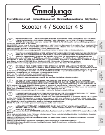 Instruktionsmanual • Instruction manual • Gebrauchsanweisung · Käyttöohje NO LES DISSE INSTRUKSJONER NØYE FØR BRUK OG TA VARE PÅ DE FOR FRAMTIDIG BRUK. DITT BARNS SIKKERHET KAN PÅVIRKES OM DU IKKE FØLGER DISSE INSTRUKSJONER! Dette produkt oppfyller standard EN 1888:2012. Salg eller markedsføring av produktet utenfor EU, EFTA land er ikke tillatt. MERK! Dette produkt er beregnet for transport av et(1) barn fra 6mnd. – 3 år med en vekt på maks. 15kg. ADVARSEL! Sportsvognsdelen er ikke beregnet for barn under 6 mnd. Bruk Sportsvogndelen først når barnet kan sitte selv. ADVARSEL! Dette produkt er ikke beregnet for jogging, skating/inlines. MERK! Før bruk av produktet sjekk www.emmaljunga.no for siste versjon. LUE NÄMÄ KÄYTTÖOHJEET HUOLELLISESTI ENNEN KUIN KÄYTÄT VAUNUA JA SÄILYTÄ NE FI MAHDOLLISTA TULEVAA KÄYTTÖÄ VARTEN. LAPSESI TURVALLISUUS SAATTA KÄRSIÄ MIKÄLI NÄITÄ OHJEITA EI NOUDATETA Tämä tuote vastaa standardin EN1888:2012 vaatimuksia. Tuotteen myynti ja markkinointi EU, EFTA alueen ulkopuolella kielletty. Tämä tuote on tarkoitettu yhden (1) lapsen kuljettamiseen. Vaunu on tarkoitettu käytettäväksi 6 kk iästä aina 3 vuoden ikään asti. Lapsen enimmäispaino: 15 kg. VAROITUS! Ratasosaa ei ole tarkoitettu käytettäväksi alle 6 kk ikäiselle lapselle. Käytä ratasistuinta vasta kun lapsi osaa itse istua tukevasti. VAROITUS! Ratasta ei ole suunniteltu käytettäväksi juoksukärrynä tai rullaluistimien kanssa. HUOMAA! Viimeisimmän päivitetyn version käyttöohjeesta löydät Emmaljungan kotisivuilta osoitteesta www.emmaljunga.se Deutsch Seite 20 - 34 English Page 35 - 50 DK VIGTIGT! LÆS DISSE INSTRUKTIONER OMHYGGELIGT FØR BRUG OG GEM DEM FOR FREMTIDIG REFERENCE. DIT BARNS SIKKERHED KAN PÅVIRKES HVIS DU IKKE FØLGER DISSE INSTRUKTIONER! Dette produkt er i overensstemmelse med EN 1888:2012. Salg eller markedsføring af produktet udenfor EU, EFTA lande er ikke tilladt. BEMÆRK! Dette produkt er beregnet til transport af et (1) barn fra 6 mdr. - 3 år med en vægt på max. 15 kg. ADVARSEL! Klapvognen er ikke egnet til børn under 6 måneder. Brug først klapvognen når barnet kan sidde selv. ADVARSEL! Dette produkt er ikke egnet til løb eller rulleskøjte løb. BEMÆRK! Besøg www.emmaljunga.dk for seneste version, før du tager produktet i brug. Dansk 51 - 66 IMPORTANT! READ THESE INSTRUCTIONS CAREFULLY BEFORE USE AND KEEP THEM FOR FUTURE UK REFERENCE. YOUR CHILD'S SAFETY MAY BE AFFECTED IF YOU DO NOT FOLLOW THESE INSTRUCTIONS This product complies with EN 1888:2012. Sales or marketing of the product outside the EU, EFTA countries is not allowed. This product is suitable for one (1) child from 6 months - 3 years with a maximum weight of 15 kg. WARNING! The seat-unit is not suitable for children under 6 months. Don’t use the seat-unit untill your child can sit unaided. WARNING! The product is not suitable for running or skating. WARNING! Please visit www.emmaljunga.co.uk for the latest version before using the product. Norsk 67 - 82 WICHTIG! LESEN SIE DIESE HINWEISE SORGFÄLTIG VOR DER BENUTZUNG UND BEWAHREN SIE SIE AUF. DE WENN SIE DIESE HINWEISE NICHT BEACHTEN, KANN DIE SICHERHEIT IHRES KINDES BEEINTRÄCHTIGT WERDEN! Dieses Produkt entspricht der Norm EN 1888: 2012. Der Vertrieb oder die Vermarktung des Produkts außerhalb der EU oder in EFTA-Ländern ist nicht erlaubt.Dieses Produkt ist für ein (1) Kind im Alter von 6 Monaten bis 3 Jahren mit einem Gewicht von max. 15 kg vorgesehen. WARNUNG! Dieses Produkt ist nicht zum Joggen oder Skaten geeignet.WARNUNG! Diese Sitzeinheit ist für Kinder unter 6 Monaten nicht geeignet. Besuchen Sie www.emmaljunga.de für neueste Informationen, bevor Sie dieses Produkt benutzen. Suomi 83 - 97 VIKTIG INFORMATION - LÄS DESSA INSTRUKTIONER NOGGRANNT FÖRE ANVÄNDNING OCH SPARA DE SE FÖR FRAMTIDA BRUK. DITT BARNS SÄKERHET KAN PÅVERKAS OM DU INTE FÖLJER DESSA INSTRU -TIONER. Denna produkt motsvarar standard EN 1888:2012. Försäljning eller marknadsföring av produkten utanför EU, EFTA länder är inte tillåtet. OBSERVERA ! Denna vagn är avsedd för transporten av ett (1) barn från 6 månader - 3 år med en vikt av maximalt 15 kg. VARNING! Sittdelen är inte avsedd för barn under 6 månader. Använd sittdelen först när barnet kan sitta självständigt. VARNING! Denna produkt är inte avsedd för jogging, skatting/inlines. OBSERVERA! Besök www.emmaljunga.se för senaste versionen, innan du börjar använda produkten. Svenska Sida 4 - 19 Scooter 4 / Scooter 4 S Kasutusjuhend • Lietošanas instrukcija • Instrukcijų vadovas Instrukcja obsługi • Руководство пользователя WAŻNA INFORMACJA! PRZED PRZYSTĄPIENIEM DO KORZYSTANIA Z PRODUKTU PROSIMY UWAŻNIE PL PRZECZYTAĆ NINIEJSZĄ INSTRUKCJĘ I ZACHOWAĆ JĄ DO PRZYSZŁEGO WYKORZYSTANIA. NIEPRZESTRZEGANIE NINIEJSZYCH INSTRUKCJI MOŻE MIEĆ NIEKORZYSTNY WPŁYW NA BEZPIECZEŃSTWO PAŃSTWA DZIECKA. Produkt ten jest zgodny z normą EN 1888:2012. Obrót lub marketing tym produktem poza krajami UE i EFTA jest niedozwolony. Produkt ten jest przeznaczony dla jednego (1) dziecka w wieku od 6 miesięcy do 3 lat, o maksymalnej dopuszczalnej wadze wynoszącej do 15 kg. OSTRZEŻENIE! Ten wózek spacerowy nie jest odpowiedni dla dzieci w wieku poniżej 6 miesięcy. Nie należy korzystać z tego wózka zanim dziecko nie będzie w stanie siadać samodzielnie. OSTRZEŻENIE! Ten produkt nie nadaje się do stosowania podczas jazdy na łyżworolkach ani w czasie uprawiania joggingu. OSTRZEŻENIE! Przed przystąpieniem do korzystania z produktu prosimy zapoznać się z najnowszą wersją informacji technicznej, zamieszczoną na stronie internetowej www.emmaljunga.co.uk. CZ DŮLEŽITÉ! PŘED POUŽITÍM SI PEČLIVĚ PŘEČTĚTE TYTO POKYNY A USCHOVEJTE SI JE PRO BUDOUCÍ POTŘEBU. POKUD SE NEBUDETE DRŽET TĚCHTO POKYNŮ, MŮŽETE OHROZIT BEZPEČNOST VAŠEHO DÍTĚTE. Tento výrobek je v souladu s EN 1888: 2012. Prodej nebo marketing výro