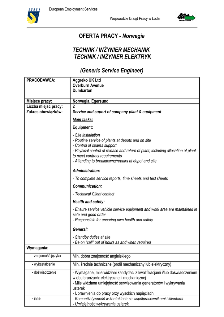 European Employment Services Wojewódzki Urząd Pracy w Łodzi OFERTA PRACY - Norwegia TECHNIK / INŻYNIER MECHANIK TECHNIK / INŻYNIER ELEKTRYK (Generic Service Engineer) PRACODAWCA: Aggreko UK Ltd Overburn Avenue Dumbarton Miejsce pracy: Liczba miejsc pracy: Zakres obowiązków: Norwegia, Egersund 2 Service and suport of company plant & equipment Main tasks: Equipment: - Site installation - Routine service of plants at depots and on site - Control of spares support - Physical control of release and return of plant, including allocation of plant to meet contract requirements - Attending to breakdowns/repairs at depot and site Administration: - To complete service reports, time sheets and test sheets Communication: - Technical Client contact Health and safety: - Ensure service vehicle service equipment and work area are maintained in safe and good order - Responsible for ensuring own health and safety General: - Standby duties at site - Be on “call” out of hours as and when required Wymagania: - znajomość języka Min. dobra znajomość angielskiego - wykształcenie Min. średnie techniczne (profil mechaniczny lub elektryczny) - doświadczenie - Wymagane, mile widziani kandydaci z kwalifikacjami i/lub doświadczeniem w obu branżach: elektrycznej i mechanicznej - Mile widziana umiejętność serwisowania generatorów i wykrywania usterek - Uprawnienia do pracy przy wysokich napięciach - Komunikatywność w kontaktach ze współpracownikami i klientami - Umiejętność wykrywania usterek - inne - Umiejętność pracy przy niewielkim stopniu nadzoru - Umiejętność samodzielnej pracy - Schludny wygląd - Zaangażowanie - Motywacja do pracy - Prawo jazdy - Gotowość do pracy w nadgodzinach (jeśli będzie to konieczne) Warunki pracy: - data rozpoczęcia - okres zatrudnienia - czas pracy - wynagrodzenie - zakwaterowanie - podróż Rekrutacja: Jak najszybciej Praca stała 40 godzin tygodniowo (możliwe nadgodziny) Do negocjacji Na koszt pracownika Na koszt pracodawcy Osoby zainteresowane powyższą ofertą proszone są o przesłanie cv w jęz. angielskim do doradcy EURES na adres email: [email protected] (z dopiskiem: Agrreko – Generic Service engineer) OFERTA WAŻNA DO ODWOŁANIA Więcej ofert pracy za granicą: www.eures.europa.eu www.wup.lodz.pl