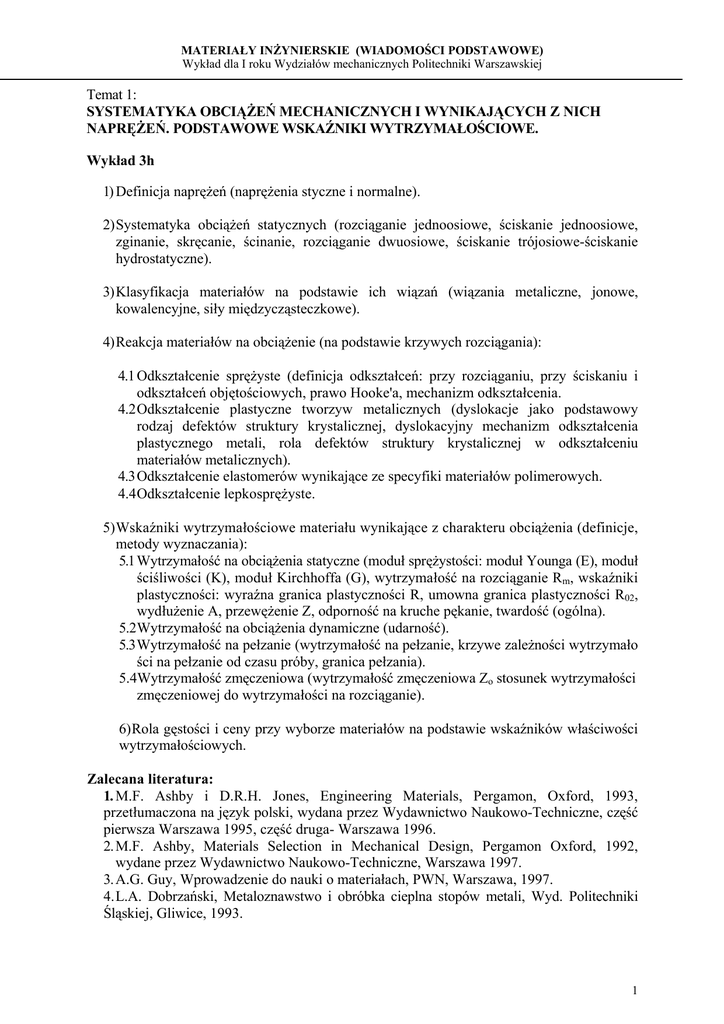 MATERIAŁY INŻYNIERSKIE (WIADOMOŚCI PODSTAWOWE) Wykład dla I roku Wydziałów mechanicznych Politechniki Warszawskiej Temat 1: SYSTEMATYKA OBCIĄŻEŃ MECHANICZNYCH I WYNIKAJĄCYCH Z NICH NAPRĘŻEŃ. PODSTAWOWE WSKAŹNIKI WYTRZYMAŁOŚCIOWE. Wykład 3h 1) Definicja naprężeń (naprężenia styczne i normalne). 2) Systematyka obciążeń statycznych (rozciąganie jednoosiowe, ściskanie jednoosiowe, zginanie, skręcanie, ścinanie, rozciąganie dwuosiowe, ściskanie trójosiowe-ściskanie hydrostatyczne). 3) Klasyfikacja materiałów na podstawie ich wiązań (wiązania metaliczne, jonowe, kowalencyjne, siły międzycząsteczkowe). 4) Reakcja materiałów na obciążenie (na podstawie krzywych rozciągania): 4.1 Odkształcenie sprężyste (definicja odkształceń: przy rozciąganiu, przy ściskaniu i odkształceń objętościowych, prawo Hooke'a, mechanizm odkształcenia. 4.2 Odkształcenie plastyczne tworzyw metalicznych (dyslokacje jako podstawowy rodzaj defektów struktury krystalicznej, dyslokacyjny mechanizm odkształcenia plastycznego metali, rola defektów struktury krystalicznej w odkształceniu materiałów metalicznych). 4.3 Odkształcenie elastomerów wynikające ze specyfiki materiałów polimerowych. 4.4 Odkształcenie lepkosprężyste. 5) Wskaźniki wytrzymałościowe materiału wynikające z charakteru obciążenia (definicje, metody wyznaczania): 5.1 Wytrzymałość na obciążenia statyczne (moduł sprężystości: moduł Younga (E), moduł ściśliwości (K), moduł Kirchhoffa (G), wytrzymałość na rozciąganie Rm, wskaźniki plastyczności: wyraźna granica plastyczności R, umowna granica plastyczności R02, wydłużenie A, przewężenie Z, odporność na kruche pękanie, twardość (ogólna). 5.2Wytrzymałość na obciążenia dynamiczne (udarność). 5.3 Wytrzymałość na pełzanie (wytrzymałość na pełzanie, krzywe zależności wytrzymało ści na pełzanie od czasu próby, granica pełzania). 5.4Wytrzymałość zmęczeniowa (wytrzymałość zmęczeniowa Zo stosunek wytrzymałości zmęczeniowej do wytrzymałości na rozciąganie). 6) Rola gęstości i ceny przy wyborze materiałów na podstawie wskaźników właściwości wytrzymałościowych. Zalecana literatura: 1. M.F. Ashby i D.R.H. Jones, Engineering Materials, Pergamon, Oxford, 1993, przetłumaczona na język polski, wydana przez Wydawnictwo Naukowo-Techniczne, część pierwsza Warszawa 1995, część druga- Warszawa 1996. 2. M.F. Ashby, Materials Selection in Mechanical Design, Pergamon Oxford, 1992, wydane przez Wydawnictwo Naukowo-Techniczne, Warszawa 1997. 3. A.G. Guy, Wprowadzenie do nauki o materiałach, PWN, Warszawa, 1997. 4. L.A. Dobrzański, Metaloznawstwo i obróbka cieplna stopów metali, Wyd. Politechniki Śląskiej, Gliwice, 1993. 1 MATERIAŁY INŻYNIERSKIE (WIADOMOŚCI PODSTAWOWE) Wykład dla I roku Wydziałów mechanicznych Politechniki Warszawskiej Rys. 1.1 Systematyka obciążeń statycznych. 2 MATERIAŁY INŻYNIERSKIE (WIADOMOŚCI PODSTAWOWE) Wykład dla I roku Wydziałów mechanicznych Politechniki Warszawskiej Rys. 1.2 Odkształcenia: a)przy rozciąganiu b)przy ściskaniu c)odkształcenie objętościowe. 3 MATERIAŁY INŻYNIERSKIE (WIADOMOŚCI PODSTAWOWE) Wykład dla I roku Wydziałów mechanicznych Politechniki Warszawskiej Rys. 1.3 Energia i siły międzyatomowe. Rys. 1.4 Wykres rozciągania metali. 4 MATERIAŁY INŻYNIERSKIE (WIADOMOŚCI PODSTAWOWE) Wykład dla I roku Wydziałów mechanicznych Politechniki Warszawskiej Schematy rodzajów sieci przestrzennych (według A. Bravais'go) Rys. 1.5 Schematy rodzajów sieci przestrzennych. 5 MATERIAŁY INŻYNIERSKIE (WIADOMOŚCI PODSTAWOWE) Wykład dla I roku Wydziałów mechanicznych Politechniki Warszawskiej Rys. 1.6 Defekty punktowe: a), b) atomy obce c) wakans d) atom międzywęzłowy. 6 MATERIAŁY INŻYNIERSKIE (WIADOMOŚCI PODSTAWOWE) Wykład dla I roku Wydziałów mechanicznych Politechniki Warszawskiej Rys. 1.7 Dyslokacja: a) krawędziowa b) śrubowa. 7 MATERIAŁY INŻYNIERSKIE (WIADOMOŚCI PODSTAWOWE) Wykład dla I roku Wydziałów mechanicznych Politechniki Warszawskiej Rys. 1.8 Schemat wspinania się dyslokacji krawędziowej: a) dodatniego w wyniku dyfuzji wakansów do dyslokacji b)ujemnego w wyniku dyfuzji atomów do dyslokacji. Rys. 1.9 Schemat wąskokątowej granicy daszkowej o kącie dezorientacji Q. Rys. 1.10 Schemat struktury polikrystalicznej metali. 8 MATERIAŁY INŻYNIERSKIE (WIADOMOŚCI PODSTAWOWE) Wykład dla I roku Wydziałów mechanicznych Politechniki Warszawskiej Rys. 1.11 Defekty struktury krystalicznej. Rys. 1.12 Rzeczywisty wykres rozciągania stali niskowęglowej. 9 MATERIAŁY INŻYNIERSKIE (WIADOMOŚCI PODSTAWOWE) Wykład dla I roku Wydziałów mechanicznych Politechniki Warszawskiej Systematyka obciążeń mechanicznych i wynikających z nich naprężeń. Podstawowe wskaźniki wytrzymałościowe Rys. 1.13 Twardość i jej pomiary. 10 MATERIAŁY INŻYNIERSKIE (WIADOMOŚCI PODSTAWOWE) Wykład dla I roku Wydziałów mechanicznych Politechniki Warszawskiej Rys. 1.14 Odporność na kruche pękanie w zależności od grubości próbki dla stopu na osnowie aluminium. Rys. 1.15 Próba udarności: a)schemat młota wahadłowego b)kształt i położenie próbki. 11 MATERIAŁY INŻYNIERSKIE (WIADOMOŚCI PODSTAWOWE) Wykład dla I roku Wydziałów mechanicznych Politechniki Warszawskiej Rys. 1/16 Wykres zmęczeniowy Wolhera: ZK - wytrzymałość zmęczeniowa przy małej liczbie cykli ZO - ograniczona wytrzymałość zmęczeniowa ZZ - nieograniczona wytrzymałość zmęczeniowa. Tabela Oszczędności wynikające ze zmniejszenia masy wyrobu Przemysł Oszczędności (umowna jednostka masy) Samochodowy 1 Lotnictwo cywilne 100 Lotnictwo wojskowe 1000 Kosmiczny 10000 12