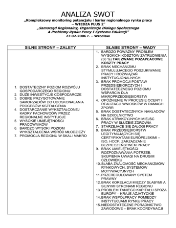 ANALIZA SWOT ,,Kompleksowy monitoring potencjału i barier regionalnego rynku pracy – WIEDZA PLUS 2’’ „Samorząd Regionalny, Organizacje Dialogu Społecznego A Problemy Rynku Pracy I Systemu Edukacji” 27.02.2006 r. – Wrocław SILNE STRONY – ZALETY 1. DOSTATECZNY POZIOM ROZWÓJU GOSPODARCZEGO REGIONU 2. DUŻE INWESTYCJE COSPODARCZE 3. DOBRE PRZYGOTOWANIE SAMORZĄDÓW DO UDOSKONALANIA PROCESÓW KSZTAŁCENIA 4. DOSTARCZANIE WYKSZTAŁCONEJ KADRY FACHOWCÓW PRZEZ REGIONALNE INSTYTUCJE 5. WYSOKIE UMIEJĘTNOŚCI PRACOWNIKÓW 6. BARDZO WYSOKI POZIOM WYKSZTAŁCENIA WŚRÓD MŁODZIEŻY 7. PROMOCJA REGIONU W SKALI MAKRO SŁABE STRONY – WADY 1. BARDZO POWAŻNY PROBLEM WYSOKICH KOSZTÓW ZATRUDNIENIA (50 %) TAK ZWANE POZAPŁACOWE KOSZTY PRACY 2. BRAK MECHANIZMU STYMULUJĄCEGO POSZUKIWANIE PRACY I ROZWIĄZAŃ INSTYTUCJONALNYCH 3. BRAK PROMOCJI POSTAW PRZEDSIĘBIORCZYCH I DOSTATECZNEGO POZIOMU WSPARCIA DLA MIKROPRZEDSIĘBIORSTW 4. OPÓŹNIENIE W PROCESIE OCENY I REALIZACJI WNIOSKÓW W RAMACH ZPORR 5. BRAK DOSTATECZNYCH NAKŁADÓW NA SZKOLNICTWO 6. BRAK ATRAKCYJNYCH MIEJSC PRACY W SŁUŻBIE ZDROWIA 7. STARZEJĄCE SIĘ ZAŁOGI PRACY 8. BRAK PRZEDSIĘBIORSTW LEGITYMUJĄCYCH SIĘ CERTYFIKATAMI EUROPEJSKIMI – ISO, HCCP, ZARZĄDZANIE BEZPIECZEŃSTWEM PRACY 9. BRAK UMIEJĘTNOŚCI ROZPOZNAWANIA POTRZEB, SKUPIENIA UWAGI NA DRUGIM CZŁOWIEKU 10. SŁABA ZNAJOMOŚĆ MECHANIZMÓW RYNKOWYCH, SYSTEMÓW MOTYWACYJNYCH 11. PRZEREGULOWANY SYSTEM PRAWNY 12. BRAK KORELACJI MIĘDZY SŁABYMI A SILNYMI STRONAMI REGIONU 13. PROBLEM TANIEGO KAPITAŁU SPOZA EUROPY – KRAJE AZJATYCKIE 14. BRAK WSPÓŁPRACY POMIEDZY INSTYTUCJAMI RYNKU PRACY 15. NIEDOSTATECZNE PORADNICTWO ZAWODOWE – BRAK KOORDYNACJI SZANSE 1. DALSZY ROZWÓJ GOSPODARCZY REGIONU 2. „NACISK” ORGANIZACJI SPOŁECZNYCH – WSPÓLNY SILNY GŁOS W SPRAWIE ZMIAN USTAWODAWSTWA 3. UELASTYCZNIENIE PRAWA PRACY, TWORZENIE LEPSZEGO PRAWA PRACY 4. PATRIOTYZM LOKALNY – CHĘĆ PRACY I ŻYCIA NA DOLNYM ŚLĄSKU 5. WZROST NAKŁADÓW NA SŁUŻBĘ ZDROWIA 6. WZMOCNIENIE POTENCJAŁU SŁUŻB BEZPIECZEŃSTWA PRACY 7. PRZYGOTOWANIE MŁODZIEŻY WCHODZĄCEJ NA RYNEK PRACY – ZAGDNIENIA BHP, KURSY PODSTAWOWE 8. WZROST WIEDZY I UMIEJĘTNOŚCI SPEŁNIANIA POTRZEB 9. KSZTAŁTOWANIE SIĘ POSTAW OBYWATELSKICH, TWORZENIE „SPOŁECZEŃSTWA OBYWATESKIEGO” 10. STWORZENIE SYSTEMU MONITOROWANIA „DALSZYCH LOSÓW” ABSOLWENTÓW 11. KONCEPCJA DOLNOŚLĄSKIEGO CENTRUM EKSPORTU 12. WYKORZYSTANIE POTENCJALU INTELEKTUALNEGO MŁODYCH LUDZI 13. POWOŁANIE REGIONALNEGO FORUM PORADNICTWA ZAWODOWEGO 14. PRACA NAD REGIONALNYMI UKŁADAMI INSTYTUCJONALNYMI ZAGROŻENIA 1. EMIGRACJA NAJLEPSZYCH FACHOWCÓW W WYNIKU CZEGO BRAK DOBRZE WYKSZTAŁCONEJ KADRY MEDYCZNEJ 2. NISKI POZIOM BEZPIECZEŃSTWA PRACY 3. „WĄTPLIWE EFEKTY” PODOBNYCH SPOTKAŃ – BRAK „ODGŁOSU W OTOCZENIU” 4. BRAK WYRAŻNIE DEFINIOWALNEGO SYSTEMU WARTOŚCI WŚRÓD LUDZI 5. BRAK MECHANIZMÓW WSPARCIA DLA ABSOLWENTÓW, CZĘSTO WYSOKO WYKSZTAŁCONYCH 6. BRAK STRATEGII POZYSKIWANIA KAPITAŁU 7. BRAK PROMOCJI WEWNĘTRZNEJ REGIONU 8. BRAK SPECJALISTÓW – SZKOŁY UCZĄCE TEORII A NIE PRAKTYKI 9. BRAK PRAKTYCZNEGO PRZYGOTOWANIA DO PRACY, ZATRUSNIENIA 10. BRAK MONITORINGU POTRZEB RYNKU WŚRÓD INSTYTUCJI OŚWIATY 11. BRAK W PEŁNI WPROWADZONEJ ZASADY SUBSYDIARNOŚCI 12. NIEDOSTATECZNE PRZYPISANIE ZADAŃ I KOMPETENCJI WŚRÓD INSTYTUCJI RYNKU PRACY