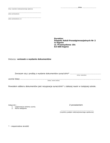 ...................................................... ..........................., dnia ....................... Imię i nazwisko rodzica/prawnego opiekuna ...................................................... adres zamieszkania ...................................................... adres zamieszkania c.d. Dyrektor Zespołu Szkół Ponadgimnazjalnych Nr 2 w Kępnie ul. Przemysłowa 10c 63-600 Kępno Dotyczy: wniosek o wydanie dokumentów Zwracam się z prośbą o wydanie dokumentów syna/córki* .............................................. (imię i nazwisko) ucznia klasy ........................................................................................................................ (klasa, nazwa szkoły) Powodem odbioru dokumentów jest rezygnacja syna/córki* z dalszej nauki w tutejszej szkole. Załączniki : 1. Legitymacja szkolna ucznia. 2. Karta obiegowa. Z poważaniem ................................................. (czytelny podpis rodzica/prawnego opiekuna) * - niepotrzebne skreślić