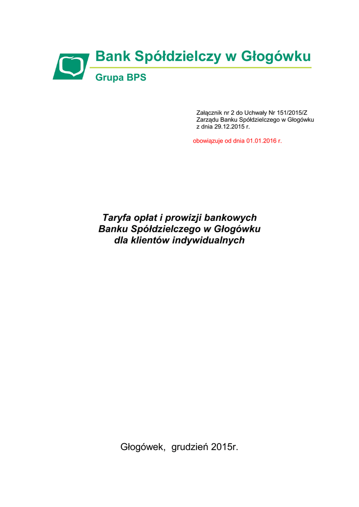 Bank Spółdzielczy w Głogówku Grupa BPS Załącznik nr 2 do Uchwały Nr 151/2015/Z Zarządu Banku Spółdzielczego w Głogówku z dnia 29.12.2015 r. obowiązuje od dnia 01.01.2016 r. Taryfa opłat i prowizji bankowych Banku Spółdzielczego w Głogówku dla klientów indywidualnych Głogówek, grudzień 2015r. Spis treści: KONTA OSOBISTE .................................................................................................................................................................. 4 TAB. 1 RACHUNKI OSZCZĘDNOŚCIOWO-ROZLICZENIOWE............................................................................................................................... 4 TAB. 2 RACHUNEK DLA PKZP ORAZ DLA OSÓB FIZYCZNYCH BĘDĄCYCH CZŁONKAMI RAD RODZICÓW W ZŁOTYCH .......................................................... 5 TAB. 3 RACHUNEK OSZCZĘDNOŚCIOWY PŁATNY NA KAŻDE ŻĄDANIE W WALUTACH WYMIENIALNYCH .......................................................................... 5 TAB. 4 RACHUNEK OSZCZĘDNOŚCIOWY PŁATNY NA KAŻDE ŻĄDANIE W ZŁOTYCH POTWIERDZONY KSIĄŻECZKĄ OSZCZĘDNOŚCIOWĄ ................................... 6 TAB. 5 WSPÓLNE CZYNNOŚCI ZWIĄZANE Z OBSŁUGĄ KONT OSOBISTYCH ........................................................................................................... 6 OSZCZĘDNOŚCI..................................................................................................................................................................... 7 TAB. 6 RACHUNEK TERMINOWEJ LOKATY OSZCZĘDNOŚCIOWEJ W ZŁOTYCH ........................................................................................................ 7 TAB. 7 RACHUNEK TERMINOWEJ LOKATY OSZCZĘDNOŚCIOWEJ W WALUTACH WYMIENIALNYCH ................................................................................ 7 TAB. 8 WSPÓLNE CZYNNOŚCI ZWIĄZANE Z OBSŁUGĄ RACHUNKÓW OSZCZĘDNOŚCIOWYCH...................................................................................... 8 KARTY BANKOWE .................................................................................................................................................................. 8 TAB. 9 KARTY DEBETOWE: VISA CLASSIC DEBETOWA, MASTERCARD PAYPASS .................................................................................................. 8 TAB. 10 KARTY KREDYTOWE ................................................................................................................................................................. 9 KREDYTY ............................................................................................................................................................................ 10 TAB. 11 KREDYTY, WEKSLE I GWARANCJE BANKOWE .................................................................................................................................. 10 OPERACJE DEWIZOWE......................................................................................................................................................... 10 TAB. 12 PRZEKAZY W OBROCIE DEWIZOWYM ........................................................................................................................................... 10 INNE USŁUGI ...................................................................................................................................................................... 11 TAB. 13 CZYNNOŚCI KASOWE W ZŁOTYCH............................................................................................................................................... 11 2 Zasady pobierania opłat i prowizji bankowych 1. Taryfa opłat i prowizji bankowych Banku Spółdzielczego w Głogówku dla klientów instytucjonalnych zwana dalej Taryfą ma zastosowanie do usług bankowych świadczonych w placówkach Banku Spółdzielczego w Głogówku, zwanego dalej Bankiem. 2. Opłaty i prowizje pobierane są: 1) po wykonaniu usługi lub na koniec dnia, w którym Klient złożył dyspozycję wykonania usługi; 2) miesięcznie lub w innych okresach rozliczeniowych; 3) zbiorczo - za wykonane usługi w trakcie okresu rozliczeniowego; 4) zgodnie z zawartą umową. 3. Bank nie realizuje wpłat i wypłat w walutach obcych w bilonie. W przypadku konieczności wypłat bilonu, Bank przelicza kwotę na złote polskie i wydaje Klientowi równowartość tej kwoty. 4. Wszelkie opłaty i prowizje bankowe pokrywa zleceniodawca transakcji chyba, że zawarte umowy stanowią inaczej. 5. Kwoty pobieranych prowizji i opłat podlegają zaokrągleniu do jednego grosza na zasadach ogólnych. Dotyczy to również kwot prowizji i opłat pobieranych w złotych od transakcji dokonywanych w obrocie dewizowym. Kwoty pobierane w walucie obcej są zaokrąglane wg analogicznych zasad. 6. Za operacje dewizowe zlecone przez rezydentów i nierezydentów pobiera się dodatkowo opłaty i prowizje lub koszty podane przez banki pośredniczące i inne podmioty finansowe przy wykonaniu zlecenia oraz poniesione przez Bank koszty kurierskie i telekomunikacyjne. 7. W przypadku transakcji realizowanych w walucie obcej, lub gdy podstawę naliczania prowizji stanowi kwota w walucie obcej, opłata/prowizja w złotych jest ustalana według kursu średniego NBP obowiązującego w dniu pobrania należności. 8. Zgodnie z uregulowaniami Międzynarodowej Izby Handlowej w Paryżu, dotyczącymi akredytyw (Publikacja UCP nr 600) i inkas (Publikacja URC nr 522) Bank Spółdzielczy w Głogówku niezwłocznie obciąży prowizjami i opłatami zleceniodawcę transakcji, jeśli jego kontrahent odmówi zapłaty tych prowizji. Bank może ustalić i pobierać zryczałtowane opłaty na pokrycie kosztów naliczanych przez pośredniczące banki zagraniczne. 9. Klient decyduje o rodzaju systemu rozliczeniowego, którym realizuje przelew. 10. Za usługi nietypowe i nieprzewidziane w Taryfie Bank może ustalić opłatę wg rzeczywistych kosztów lub według umowy z Kl
