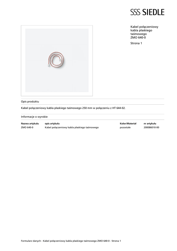 Kabel połączeniowy kabla płaskiego taśmowego ZMO 640-0 Strona 1 Opis produktu Kabel połączeniowy kabla płaskiego taśmowego 250 mm w połączeniu z HT 644-02. Informacje o wyrobie Nazwa�artykułu opis�artykułu Kolor/Materiał nr�artykułu ZMO 640-0 Kabel połączeniowy kabla płaskiego taśmowego pozostałe 200086010-00 Formularz danych - Kabel połączeniowy kabla płaskiego taśmowego ZMO 640-0 - Strona 1 Kabel połączeniowy kabla płaskiego taśmowego ZMO 640-0 Strona 2 Formularz danych - Kabel połączeniowy kabla płaskiego taśmowego ZMO 640-0 - Strona 2 Kabel połączeniowy kabla płaskiego taśmowego ZMO 640-0 Strona 3 Informacja o produktach Formularz danych - Kabel połączeniowy kabla płaskiego taśmowego ZMO 640-0 - Strona 3 71,3 kB Pobieranie