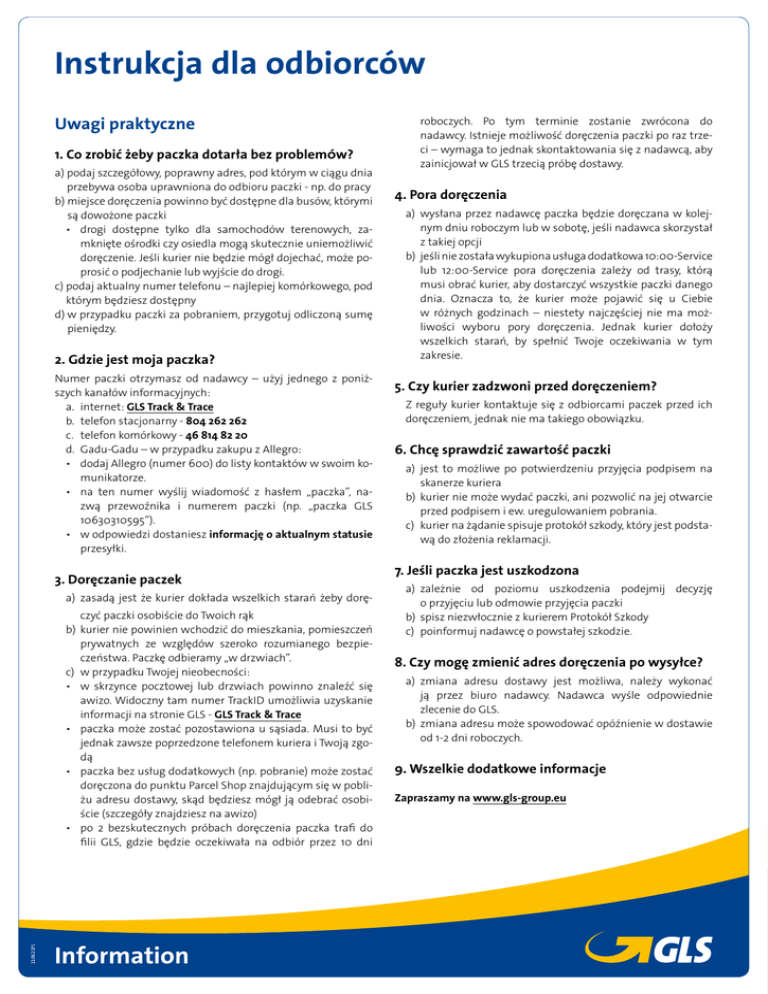 Instrukcja dla odbiorców Uwagi praktyczne 1. Co zrobić żeby paczka dotarła bez problemÓw? a) p odaj szczegółowy, poprawny adres, pod którym w ciągu dnia przebywa osoba uprawniona do odbioru paczki - np. do pracy b) m iejsce doręczenia powinno być dostępne dla busów, którymi są dowożone paczki •drogi dostępne tylko dla samochodów terenowych, zamknięte ośrodki czy osiedla mogą skutecznie uniemożliwić doręczenie. Jeśli kurier nie będzie mógł dojechać, może poprosić o podjechanie lub wyjście do drogi. c) p odaj aktualny numer telefonu – najlepiej komórkowego, pod którym będziesz dostępny d) w przypadku paczki za pobraniem, przygotuj odliczoną sumę pieniędzy. 2. Gdzie jest moja paczka? Numer paczki otrzymasz od nadawcy – użyj jednego z poniższych kanałów informacyjnych: a. internet: GLS Track & Trace b. telefon stacjonarny - 804 262 262 c. telefon komórkowy - 46 814 82 20 d. Gadu-Gadu – w przypadku zakupu z Allegro: •dodaj Allegro (numer 600) do listy kontaktów w swoim komunikatorze. •na ten numer wyślij wiadomość z hasłem „paczka”, nazwą przewoźnika i numerem paczki (np. „paczka GLS 10630310595”). •w odpowiedzi dostaniesz informację o aktualnym statusie przesyłki. 3. Doręczanie paczek a)zasadą jest że kurier dokłada wszelkich starań żeby dorę- 110621PL czyć paczki osobiście do Twoich rąk b)kurier nie powinien wchodzić do mieszkania, pomieszczeń prywatnych ze względów szeroko rozumianego bezpieczeństwa. Paczkę odbieramy „w drzwiach”. c)w przypadku Twojej nieobecności: •w skrzynce pocztowej lub drzwiach powinno znaleźć się awizo. Widoczny tam numer TrackID umożliwia uzyskanie informacji na stronie GLS - GLS Track & Trace •paczka może zostać pozostawiona u sąsiada. Musi to być jednak zawsze poprzedzone telefonem kuriera i Twoją zgodą •paczka bez usług dodatkowych (np. pobranie) może zostać doręczona do punktu Parcel Shop znajdującym się w pobliżu adresu dostawy, skąd będziesz mógł ją odebrać osobiście (szczegóły znajdziesz na awizo) •po 2 bezskutecznych próbach doręczenia paczka trafi do filii GLS, gdzie będzie oczekiwała na odbiór przez 10 dni Information roboczych. Po tym terminie zostanie zwrócona do nadawcy. Istnieje możliwość doręczenia paczki po raz trzeci – wymaga to jednak skontaktowania się z nadawcą, aby zainicjował w GLS trzecią próbę dostawy. 4. Pora doręczenia a)wysłana przez nadawcę paczka będzie doręczana w kolejnym dniu roboczym lub w sobotę, jeśli nadawca skorzystał z takiej opcji b)jeśli nie została wykupiona usługa dodatkowa 10:00-Service lub 12:00-Service pora doręczenia zależy od trasy, którą musi obrać kurier, aby dostarczyć wszystkie paczki danego dnia. Oznacza to, że kurier może pojawić się u Ciebie w różnych godzinach – niestety najczęściej nie ma możliwości wyboru pory doręczenia. Jednak kurier dołoży wszelkich starań, by spełnić Twoje oczekiwania w tym zakresie. 5. Czy kurier zadzwoni przed doręczeniem? Z reguły kurier kontaktuje się z odbiorcami paczek przed ich doręczeniem, jednak nie ma takiego obowiązku. 6. Chcę sprawdzić zawartość paczki a)jest to możliwe po potwierdzeniu przyjęcia podpisem na skanerze kuriera b)kurier nie może wydać paczki, ani pozwolić na jej otwarcie przed podpisem i ew. uregulowaniem pobrania. c)kurier na żądanie spisuje protokół szkody, który jest podstawą do złożenia reklamacji. 7. Jeśli paczka jest uszkodzona a)zależnie od poziomu uszkodzenia podejmij decyzję o przyjęciu lub odmowie przyjęcia paczki b)spisz niezwłocznie z kurierem Protokół Szkody c)poinformuj nadawcę o powstałej szkodzie. 8. Czy mogę zmienić adres doręczenia po wysyłce? a)zmiana adresu dostawy jest możliwa, należy wykonać ją przez biuro nadawcy. Nadawca wyśle odpowiednie zlecenie do GLS. b)zmiana adresu może spowodować opóźnienie w dostawie od 1-2 dni roboczych. 9. Wszelkie dodatkowe informacje Zapraszamy na www.gls-group.eu