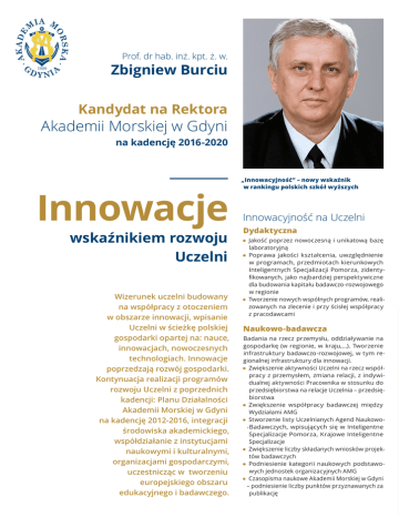 Prof. dr hab. inż. kpt. ż. w. Zbigniew Burciu Kandydat na Rektora Akademii Morskiej w Gdyni na kadencję 2016-2020 Innowacje wskaźnikiem rozwoju Uczelni Wizerunek uczelni budowany na współpracy z otoczeniem w obszarze innowacji, wpisanie Uczelni w ścieżkę polskiej gospodarki opartej na: nauce, innowacjach, nowoczesnych technologiach. Innowacje poprzedzają rozwój gospodarki. Kontynuacja realizacji programów rozwoju Uczelni z poprzednich kadencji: Planu Działalności Akademii Morskiej w Gdyni na kadencję 2012-2016, integracji środowiska akademickiego, współdziałanie z instytucjami naukowymi i kulturalnymi, organizacjami gospodarczymi, uczestnicząc w tworzeniu europejskiego obszaru edukacyjnego i badawczego. „Innowacyjność” – nowy wskaźnik w rankingu polskich szkół wyższych Innowacyjność na Uczelni Dydaktyczna ● Jakość poprzez nowoczesną i unikatową bazę laboratoryjną ● Poprawa jakości kształcenia, uwzględnienie w programach, przedmiotach kierunkowych Inteligentnych Specjalizacji Pomorza, zidentyfikowanych, jako najbardziej perspektywiczne dla budowania kapitału badawczo-rozwojowego w regionie ● Tworzenie nowych wspólnych programów, realizowanych na zlecenie i przy ścisłej współpracy z pracodawcami Naukowo-badawcza Badania na rzecz przemysłu, oddziaływanie na gospodarkę (w regionie, w kraju,…). Tworzenie infrastruktury badawczo-rozwojowej, w tym regionalnej infrastruktury dla innowacji. ● Zwiększenie aktywności Uczelni na rzecz współpracy z przemysłem, zmiana relacji, z indywidualnej aktywności Pracownika w stosunku do przedsiębiorstwa na relacje Uczelnia – przedsiębiorstwa ● Zwiększenie współpracy badawczej między Wydziałami AMG ● Stworzenie listy Uczelnianych Agend Naukowo-Badawczych, wpisujących się w Inteligentne Specjalizacje Pomorza, Krajowe Inteligentne Specjalizacje ● Zwiększenie liczby składanych wniosków projektów badawczych ● Podniesienie kategorii naukowych podstawowych jednostek organizacyjnych AMG ● Czasopisma naukowe Akademii Morskiej w Gdyni – podniesienie liczby punktów przyznawanych za publikację Pracownicy ● Wsparcie Wydziałowej Komisji Stypendialnej i Biura Karier Studenckich ● Wspieranie rozwoju naukowego oraz zawodowego Pracowników Uczelni, stabilizacja zatrudnienia kadry i jej utrzymanie, przeciwdziałanie degradacji w wypadku niespełnienia ustawowych wymagań w odpowiednim czasie ● Powołanie Rady Rektorów poprzednich kadencji – program kontynuacji i rozwoju Statki szkolne Wykorzystanie statków uczelnianych jako rzeczywistych laboratoriów, (obniżenie kosztów eksploatacji, kosztów praktyk morskich). Pakiet socjalny Praktyki studenckie Rozszerzenie pakietu podstawowych badań lekarskich – pakiety medyczne dla Pracowników i ich Rodzin. HORYZONT II - wydłużenie czasu przebywania w morzu. kresie kultury fizycznej dla Studentów i Pracowników Uczelnia Nazwa Uczelni Informatyzacja ● Utworzenie jednego Uczelnianego Centrum Informatycznego (wprowadzenie elektronicznego obiegu dokumentów na Uczelni, wprowadzenie: centrum informacji finansowej, elektronicznego obiegu dokumentów księgowych, budżetowania i rozliczania projektów, wirtualnych kadr) ● Dokończenie wdrożenia i rozwój e-dziekanatu Infrastruktura ● Rozbudowa kampusu Akademii Morskiej w Gdyni ● Rozbudowa i modernizacja uczelnianej infrastruktury sportowej, oferty w za- Prof. dr hab. inż. kpt. ż. w. Zbigniew Burciu dr nauk technicznych 1997 dr hab. nauk technicznych 2004 profesor nauk technicznych 2013 Dyscyplina transport, specjalności bezpieczeństwo i niezawodność w transporcie morskim, projektowanie urządzeń i środków ratunkowych, projektowanie środków transportu ratownictwa powodziowego. Autor ponad 150 publikacji w tym 3 monografii, 2 rozdziałów w monografiach, skryptu, współautor 1 rozdziału w monografii, Cytowania 114, h-indeks 6, i10-indeks 1. Patenty: 2 patenty, 2 zgłoszenia, 1 znak towarowy. Wdrożenia 3. Udział w 17 projektach badawczych (kierownik 12 projektów B+R, główny wykonawca 2 projektów, koordynator opracowania w projekcie międzynarodowym INVAPO, wykonawca w projekcie ZEUS, wykonawca w międzynarodowym projekcie programu europejskiego ERA-NET MARTEC). ● Uniwersytet Morski w Gdyni - po uzyskaniu 6 uprawnienia do nadawania stopnia naukowego doktora Studenci - Parlament Koła Naukowe - Doktoranci ● Wspieranie kreatywnych inicjatyw studenckich ● Zwiększenie udziału studentów w realizacji programów badawczych. ● Wspieranie działalności naukowej studentów ● Przeniesienie podległości Kół Naukowych z pionu Prorektora ds. Kształcenia do Prorektora ds. Nauki Aktualnie w ocenie w NCBiR 2 projekty (B+R, aparaturowy), projekt międzynarodowy w programie BONUS - 185. Opracowania na rzecz przemysłu: analizy, ekspertyzy, zlecony projekt badawczy (5 etapów). Przewody doktorskie ● Przewody doktorskie zakończone - 3 ● Promotor 2 otwartych przewodów doktorskich ● Opiekun naukowy 2 Członkostwo ● Sekcji Komitetu Transportu PAN ● Ławnik, biegły sądowy Izby Morskiej ● Rady Naukowo-Technicznej przy Komendancie Głównym PSP ● Komitetów naukowych konferencji, rad programowych ● Przewodniczący Stowarzyszenia Kapitanów żeglugi Wielkiej 19932001 oraz ławnik Promocja Uczelni 2020 – 100 lecie szkolnictwa morskiego Dnia 17 czerwca 1920 minister spraw wojskowych gen. Józef Leśniewski podpisał akt utworzenia Szkoły Morskiej w Tczewie. Działania zewnętrzne ● Wystąpienie, poprzez Konferencję Rektorów Polskich Uczelni Technicznych wycofanie punktacji czasopism z oceną wstecz ● Ocena projektów badawczych w ramach konkursów ogłaszanych przez NCBiR 2 etapowa ● Współpraca z MGMiŻŚ w zakresie zwiększenia finansowania uczelni morskich Szczegóły programu zostaną zaprezentowane w dniu 31 marca 2016 r. ● Prodziekan ds. naukow ych Wydział Nawigacyjny ● Kierownik Katedry Eksploatacji Statku od 2006 roku Działa