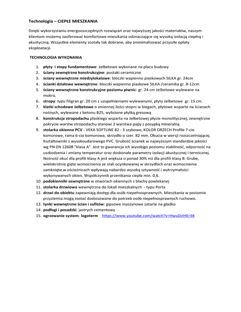 Technologia – CIEPŁE MIESZKANIA Dzięki wykorzystaniu energooszczędnych rozwiązań oraz najwyższej jakości materiałów, naszym klientom możemy zaoferować komfortowe mieszkania odznaczające się wysoką izolacją cieplną i akustyczną. Wszystkie elementy zostały tak dobrane, aby zminimalizować przyszłe opłaty eksploatacji. TECHNOLOGIA WYKONANIA 1. 2. 3. 4. 5. 6. 7. 8. 9. 10. 11. 12. 13. 14. 15. płyty i stopy fundamentowe: żelbetowe wykonane na placu budowy ściany zewnętrzne konstrukcyjne: pustaki ceramiczne ściany wewnętrzne miedzylokalowe: bloczki wapienno piaskowych SILKA gr. 24cm ścianki działowe wewnętrzne: bloczki wapienno piaskowe SILKA /ceramika gr. 8-12cm ściany wewnętrzne konstrukcyjne poziomu piwnic: gr. 24 cm żelbetowe wylewane na mokro. stropy: typu filigran gr. 20 cm z uzupełnieniami wylewanymi, płyty żelbetowe gr. 15 cm. klatki schodowe żelbetowe o zmiennej ilości stopni w biegach, płytowe wsparte na ścianach nośnych, wylewane z betonu B25, wyłożone płytką gresową konstrukcja stropodachu płaskiego wsparta na żelbetowej płycie monolitycznej, zewnętrzne pokrycie warstw stropodachu stanowi 2 warstwa papy z posypką mineralną stolarka okienna PCV - VEKA SOFTLINE 82 - 3 szybowe, KOLOR ORZECH Profile 7-cio komorowe, rama 6-cio komorowa, skrzydło o szer. 82 mm. Okucia w wersji rozszczelniającej. Kształtowniki z wysokoudarowego PVC. Grubość ścianek w najwyższym standardzie jakości wg PN-EN 12608 "klasa A". Jest to gwarancja ich wysokigo poziomu stabilność, odporność na uszkodzenia i zmiany temperatur oraz doskonałe parametry izolacji akustycznej i termicznej. Nośność okuć dla profili klasy A jest większa o ponad 30% niż dla profili klasy B. Grube, wielokrotnie gięte wzmocnienia ze stali ocynkowanej w skrzydłach oraz wzmocnienia zamknięte w ościeżnicach wpływają nabardzo wysoką sztywność i wytrzymałości wykonywanych okien. Współczynnik przenikania ciepła min. 0,6. podokienniki zewnętrzne w otworach okiennych z blachy powlekanej stolarka drzwiowa wewnętrzna do lokali mieszkalnych - typu Porta drzwi do obiektu zapewniają dostęp dla osób niepełnosprawnych. Mieszkania w poziomie przyziemia mogą zostać dostosowane do potrzeb osób niepełnosprawnych ruchowo. tynki wewnętrzne ścian i sufitów: gipsowe maszynowe zatarte na gładko podłogi i posadzki: jastrych cementowy ogrzewanie system- logoterm https://www.youtube.com/watch?v=HwuDzlHEr38