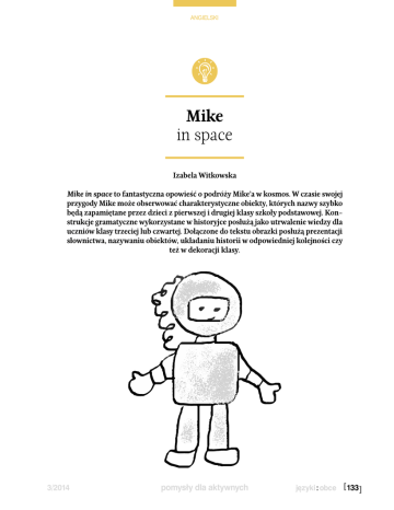 ANGIELSKI Mike in space Izabela Witkowska Mike in space to fantastyczna opowieść o podróży Mike’a w kosmos. W czasie swojej przygody Mike może obserwować charakterystyczne obiekty, których nazwy szybko będą zapamiętane przez dzieci z pierwszej i drugiej klasy szkoły podstawowej. Konstrukcje gramatyczne wykorzystane w historyjce posłużą jako utrwalenie wiedzy dla uczniów klasy trzeciej lub czwartej. Dołączone do tekstu obrazki posłużą prezentacji słownictwa, nazywaniu obiektów, układaniu historii w odpowiedniej kolejności czy też w dekoracji klasy. 3/2014 pomysły dla aktywnych [ 133 ] ANGIELSKI [ 134 ] Look at the smile on Mike’s face, he is going into space! His silver spaceship is great! Time for the countdown: nine, eight… seven… let’s start the mission… six… to visit the station… five… it’s next to Mars… four… and between the stars… three, two, one, lift off, fly high! See you Mike, take care, goodbye! Now, it’s quiet, very still, there’s no weight that Mike can feel. pomysły dla aktywnych 3/2014 ANGIELSKI That’s the Sun, a big light ball, from the Earth it looks so small. That grey object is the Moon. Lucky Mike will land there soon. -What’s that planet? – I don’t know. -Are there aliens? – I hope so. They are green and have three eyes but they’re nice and friendly guys. Look! Here’s the comet with its tail, behind is a shining trail. Mike enjoys the life in space but he finally leaves this place. 3/2014 pomysły dla aktywnych [ 135 ] ANGIELSKI What can you see in space? Po zapoznaniu dzieci z historyjką możemy popracować nad utrwaleniem kluczowych słów kojarzących się z kosmosem. Ćwiczenie dla uczniów klasy drugiej będzie polegało na rozszyfrowaniu nazw obiektów w kosmosie. Przedstawiamy dzieciom słowa o zmienionej kolejności liter, a następnie prosimy, by pracowały w parach i poprawnie napisały (rozszyfrowały) wyrazy. MSAR MARS SNU SUN STRA STAR SAPCESHPI SPACESHIP AILESN ALIENS CMETO COMET PALNTE PLANET ERTHA EARTH MNOO MOON The final countdown Każde dziecko już w pierwszej klasie potrafi liczyć do dziesięciu, ale może propozycja liczenia w odwrotną stronę okaże się pewnym wyzwaniem? W historyjce Mike przed startem słyszy odliczanie: nine,… one, lift off, fly high. Ten fragment będzie wielokrotnie powtarzany przez uczniów w czasie wykonywania następującego zadania. Przed planowaną lekcją prosimy dzieci o przygotowanie papierowych samolocików. Dzieci siadają w kółku, na środku siada osoba, która będzie odliczała nine, eight, seven, …….., one, nauczyciel dopowie lift off, fly high. W tym czasie uczniowie siedzący w kole ze swoimi samolotami zapisują na nich wybrane słowo z historyjki. Na hasło fly high uczniowie wyrzucają w górę swoje samoloty. Kiedy samoloty [ 136 ] wylądują na podłodze, każdy uczeń podnosi jeden dowolny i odczytuje zapisane na nim słowo oraz je tłumaczy. Czynność powtarzamy z tymi samymi samolotami lub tworzymy nowe. Moonwalk Każdy uczeń wciela się w rolę pewnego obiektu kosmicznego. Wśród nich są: SUN (jedna osoba), EARTH (jedna osoba), MOON (jedna osoba), COMET (jedna osoba), MARS (jedna osoba); kilka osób prezentować będzie: STARS, SPACESHIPS, STATIONS; pozostałe osoby nazwiemy kolorowymi planetami, tak by każdy uczeń miał swoją rolę: BLUE PLANET, GREEN PLANET, YELLOW PLANET itd. Po przydzieleniu ról (dla pewności możemy przygotować wizerunki obiektów i przypiąć dzieciom do ubrań) prosimy, by dzieci stanęły w dogodnej pozycji w klasie i udawały spowolniony spacer w kosmosie. Następnie nauczyciel wydaje konkretne polecenia: Sun, stand still! – Słońce staje nieruchomo na środku klasy, pozostali spacerują. Earth, turn around the Sun! – Ziemia zaczyna obracać się wokół Słońca. Moon, turn around the Earth! – Księżyc krąży wokół Ziemi. Stars, shine bright! – gwiazdy migocą, dzieci machają rękami. Spaceships, lift off! – statki startują, uczniowie mogą też dodać dźwięki silników. Mars, turn around the Sun! – Mars obraca się wokół Słońca. Stations, move to Mars! – stacje kosmiczne przemieszczają się w stronę Marsa. Blue planet, spin right! – niebieska (lub innego wybranego koloru) planeta obraca się w prawo, inne planety obracają się w lewo. Comet, fly fast! – kometa szybko leci. Nauczyciel może zmienić kolejność wydawanych poleceń, zwłaszcza że „obiektom kosmicznym” może zakręcić się w głowie. Taka zabawa nie tylko służy utrwaleniu słownictwa, ale również przedstawia pewne zasady funkcjonowania kosmosu. Karta pracy Materiał w formacie A4 do pobrania ze strony www.jows.pl Izabela Witkowska Nauczycielka języka angielskiego w szkole podstawowej. Jej wielkim zainteresowaniem, z którego czerpie wiele satysfakcji, jest pisanie rymowanych bajek i wierszyków. Dziecięcy entuzjazm, zachwyt oraz słowa Proszę Pani, jeszcze raz są dla niej największą motywacją do pracy. Jest także autorką wielu podobnych materiałów edukacyjnych. pomysły dla aktywnych 3/2014