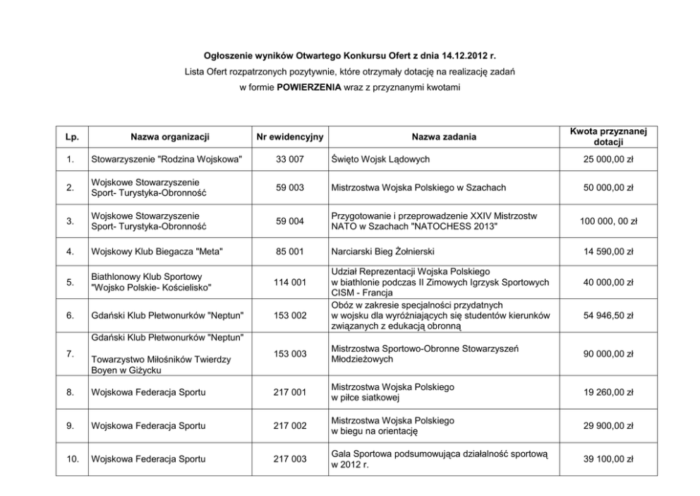 Ogłoszenie wyników Otwartego Konkursu Ofert z dnia 14.12.2012 r. Lista Ofert rozpatrzonych pozytywnie, które otrzymały dotację na realizację zadań w formie POWIERZENIA wraz z przyznanymi kwotami Lp. Nazwa organizacji Nr ewidencyjny Nazwa zadania Kwota przyznanej dotacji 1. Stowarzyszenie "Rodzina Wojskowa" 33 007 Święto Wojsk Lądowych 25 000,00 zł 2. Wojskowe Stowarzyszenie Sport- Turystyka-Obronność 59 003 Mistrzostwa Wojska Polskiego w Szachach 50 000,00 zł 3. Wojskowe Stowarzyszenie Sport- Turystyka-Obronność 59 004 Przygotowanie i przeprowadzenie XXIV Mistrzostw NATO w Szachach "NATOCHESS 2013" 4. Wojskowy Klub Biegacza "Meta" 85 001 Narciarski Bieg Żołnierski 5. Biathlonowy Klub Sportowy "Wojsko Polskie- Kościelisko" 114 001 6. Gdański Klub Płetwonurków "Neptun" 153 002 Udział Reprezentacji Wojska Polskiego w biathlonie podczas II Zimowych Igrzysk Sportowych CISM - Francja Obóz w zakresie specjalności przydatnych w wojsku dla wyróżniających się studentów kierunków związanych z edukacją obronną 100 000, 00 zł 14 590,00 zł 40 000,00 zł 54 946,50 zł Gdański Klub Płetwonurków "Neptun" 7. Towarzystwo Miłośników Twierdzy Boyen w Giżycku 153 003 Mistrzostwa Sportowo-Obronne Stowarzyszeń Młodzieżowych 90 000,00 zł 8. Wojskowa Federacja Sportu 217 001 Mistrzostwa Wojska Polskiego w piłce siatkowej 19 260,00 zł 9. Wojskowa Federacja Sportu 217 002 Mistrzostwa Wojska Polskiego w biegu na orientację 29 900,00 zł 10. Wojskowa Federacja Sportu 217 003 Gala Sportowa podsumowująca działalność sportową w 2012 r. 39 100,00 zł 11. Stowarzyszenie b. Żołnierzy 62. Kompanii Specjalnej COMMANDO 338 007 Mistrzostwa Sportowo-Obronne klas wojskowych 89 138,00 zł 12. Stowarzyszenie b. Żołnierzy 62. Kompanii Specjalnej COMMANDO 338 008 Mistrzostwa Sportowo-Obronne Żołnierzy Narodowych Sił Rezerwowych 36 308,00 zł 106 800,00 zł 40 625,00 zł 13. Aeroklub Kielecki - Lotnisko Masłów 372 001 Kurs w zakresie specjalności przydatnych w wojsku dla najlepszych uczestników mistrzostw, zawodów sportowo-obronnych rozgrywanych w 2012 r. 14. Stowarzyszenie Thesaurus Silesiae Skarb Śląski 475 001 Publikacja "Jednostki Kawaleryjskie II Rzeczypospolitej Polskiej” 15. Stowarzyszenie Thesaurus Silesiae Skarb Śląski 475 002 16. Stowarzyszenie Inicjatyw Edukacyjnych "Delta" 529 001 17. Stowarzyszenie Pododdziałów Reprezentacyjnych 598 001 Święto Kawalerii Polskiej 60 000,00 zł 18. Stowarzyszenie Pododdziałów Reprezentacyjnych 598 002 Konkurs Kawaleryjski "Mistrzostwa Polski Militari" 32 700,00 zł Wydanie materiałów popularnonaukowych z konferencji o miejscu i roli organów administracji rządowej w systemie kierowania bezpieczeństwem narodowym Organizacja XVIII edycji Ogólnopolskiego Konkursu Historycznego "Losy Żołnierza i Dzieje Oręża Polskiego" 6 350,00 zł 130 000,00 zł DYREKTOR DEPARTAMENTU WYCHOWANIA I PROMOCJI OBRONNOŚCI płk Jerzy GUTOWSKI UWAGA Podmioty, które otrzymały dotację prosi się o pilny kontakt z Departamentem Wychowania i Promocji Obronności w celu zawarcia stosownej umowy, tel.: 22 68 40 175, 22 68 40 142, 22 68 40 193.