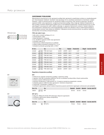 Katalog TD 2013 | 2014 56 | 57 Maty grzewcze OGRZEWANIE PODŁOGOWE Maty grzewcze przeznaczone są do ogrzewania podłogi jako ogrzewanie uzupełniające zarówno w nowobudowanych jak i remontowanych obiektach. Szerokość maty wynosząca 50 cm umożliwia zastosowanie w łazienkach i małych toaletach, a także w pomieszczeniach do uprawiania hobby czy kuchniach. Moc grzewcza wynosząca 150 W/m2 zapewnia krótkie czasy nagrzewania i przyjemną temperaturę podłogi. Maty mogą być układane bezpośrednio w kleju terakoty, warstwie wyrównującej podłoże lub np. pod wykładziną dywanową. Przewód grzewczy jest na całej swej długości umocowany do siatki z włókna szklanego, co zapewnia równomierne ułożenie i ułatwia układanie. Przy zastosowaniu zabezpieczenia różnicowoprądowego możliwe jest układanie maty w strefie bezpieczeństwa 2. Samoprzylepna osnowa maty ułatwia jej układanie i zabezpiecza przed przemieszczeniam się podczas nakładania warstwy kleju lub warstwy samopoziomującej. FTM 300 S twin FTM 150-1050 S twin ››tylko jeden przewód zasilający, dł. 4 m ››samoprzylepna siatka ››łatwe planowanie i instalacja ››moc 150 W/m² zapewnia krótki czasy ogrzewania ››szerokość maty 0,5 m ››równomierny rozkład temperatury w podłodze ››odstęp między przewodami grzejnymi ok. 7,5 cm ››obciążenie przewodu grzejnego tylko 11 W/m² Typ Moc Napięcie Powierzchnia Długość Cena kat. netto PLN 221400 FTM 150 S twin 150 W 1/N/PE ~ 230 V 1 m² 2m 221401 FTM 225 S twin 225 W 1/N/PE ~ 230 V 1,5 m² 3m 221402 FTM 300 S twin 300 W 1/N/PE ~ 230 V 2 m² 4m 221403 FTM 375 S twin 375 W 1/N/PE ~ 230 V 2,5 m² 5m 221404 FTM 450 S twin 450 W 1/N/PE ~ 230 V 3 m² 6m 221405 FTM 600 S twin 600 W 1/N/PE ~ 230 V 4 m² 8m 221406 FTM 750 S twin 750 W 1/N/PE ~ 230 V 5 m² 10 m 221407 FTM 900 S twin 900 W 1/N/PE ~ 230 V 6 m² 12 m 221408 FTM 1050 S twin 1050 W 1/N/PE ~ 230 V 7 m² 14 m Regulatory temperatury podłogi RTF RTF ››elektroniczny regulator temperatury podłogi z wymienną ramką ››regulator może być montowany oddzielnie lub też w zestawach przełączników różnych producentów ››montaż w puszce elektrycznej ∅ 55 mm ››obniżanie temperatury o stałą wartość ok. 5 K poprzez zewnętrzny programator czasowy ››wskaźniki optyczne (LED) dla trybu ogrzewania i obniżenia temperatury ››czujnik NTC z przewodem o długości 4 m ››możliwość ograniczenia zakresu nastaw temperatury poprzez pierścienie regulacyjne umieszczone pod pokrętłem RTF Best.-Nr. Typ 185547 RTF Wysokość Szerokość Głębokość Cena kat. netto PLN 85 mm 81 mm 45 mm RTF-AP 2 ››włącznik / Wyłącznik; Dioda LED wskazująca włączone ogrzewanie ››możliwość ograniczenia zakresu temperatury ››montaż natynkowy Best.-Nr. Typ 223346 RTF-AP 2 Wysokość Szerokość Głębokość Cena kat. netto PLN Błędy oraz zmiany techniczne zastrzeżone. Obowiązują ogólne warunki sprzedaży STIEBEL ELTRON Polska Sp. z o.o. 75 mm 75 mm 26 mm www.stiebel-eltron.pl Ogrzewacze wody Nr kat. Maty grzewcze RTF-Z2 eltron® RTF-Z2 eltron® ››elektroniczny regulator temperatury podłogi z programatorem tygodniowym, z wymienną ramką ››regulator może być montowany oddzielnie lub też w zestawach przełączników różnych producentów ››duży czytelny, podświetlany wyświetlacz LCD ››programowanie odbywa się przy pomocy przycisków ››programowalne czasy par włączeniowych ››zmienne przyporządkowanie temperatur i dni tygodnia ››montaż w puszce elektrycznej ∅ 55 mm Best.-Nr. Typ 231065 RTF-Z2 eltron® Wysokość Szerokość Głębokość Cena kat. netto PLN 85 mm 81 mm 45 mm Dane techniczne Typ RTF RTF-AP 2 RTF-Z2 eltron® Napięcie znamionowe 230 V 230 V 230 V Częstotliwość 50 Hz 50 Hz 50 Hz 16 A 16 A 10A 1K 1K 1,5 K Moc włączeniowa Histereza włączania Zakres nastaw Kolor 10-40°C 10-40°C 10-42°C biały, RAL 9010 biały, RAL 9010 biały, RAL 9010 ZESTAWY MONTAŻOWE DO MAT GRZEWCZYCH zawierają materiały niezbędne do elektrycznego podłączenia mat grzewczych. Ogrzewacze pomieszczeń FT-S Set FT-C Set FT-S Set ››elektroniczny regulator temperatury podłogi RTF z wymienną ramką ››3 m elastycznej rurki z tworzywa sztucznego, do ułożenia czujnika temperatury ››czujnik temperatury ››kolanko 90° do rurki czujnika ››2 m rurki do przewodu zimnego ››kolanko 90° do przewodu zimnego ››2 puszki elektryczne ∅ 55 mm Best.-Nr. Typ 185604 FT-S Set Cena kat. netto PLN FT-C Set ››elektroniczny regulator temperatury podłogi RTF-Z z programatorem tygodniowym, z ramką wymienną ››3 m elastycznej rurki z tworzywa sztucznego, do ułożenia czujnika temperatury ››czujnik temperatury ››kolanko 90° do rurki czujnika ››2 m rurki do przewodu zimnego ››kolanko 90° do przewodu zimnego ››2 puszki elektryczne ∅ 55 mm Best.-Nr. Typ 185605 FT-C Set Błędy oraz zmiany techniczne zastrzeżone. Obowiązują ogólne warunki sprzedaży STIEBEL ELTRON Polska Sp. z o.o. Cena kat. netto PLN www.stiebel-eltron.pl