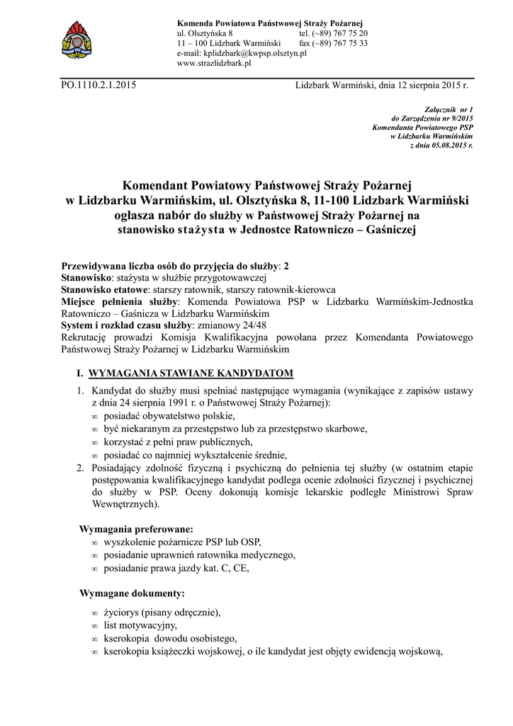 Komenda Powiatowa Państwowej Straży Pożarnej ul. Olsztyńska 8 tel. (~89) 767 75 20 11 – 100 Lidzbark Warmiński fax (~89) 767 75 33 e-mail: [email protected] www.strazlidzbark.pl PO.1110.2.1.2015 Lidzbark Warmiński, dnia 12 sierpnia 2015 r. Załącznik nr 1 do Zarządzenia nr 9/2015 Komendanta Powiatowego PSP w Lidzbarku Warmińskim z dnia 05.08.2015 r. Komendant Powiatowy Państwowej Straży Pożarnej w Lidzbarku Warmińskim, ul. Olsztyńska 8, 11-100 Lidzbark Warmiński ogłasza nabór do służby w Państwowej Straży Pożarnej na stanowisko stażysta w Jednostce Ratowniczo – Gaśniczej Przewidywana liczba osób do przyjęcia do służby: 2 Stanowisko: stażysta w służbie przygotowawczej Stanowisko etatowe: starszy ratownik, starszy ratownik-kierowca Miejsce pełnienia służby: Komenda Powiatowa PSP w Lidzbarku Warmińskim-Jednostka Ratowniczo – Gaśnicza w Lidzbarku Warmińskim System i rozkład czasu służby: zmianowy 24/48 Rekrutację prowadzi Komisja Kwalifikacyjna powołana przez Komendanta Powiatowego Państwowej Straży Pożarnej w Lidzbarku Warmińskim I. WYMAGANIA STAWIANE KANDYDATOM 1. Kandydat do służby musi spełniać następujące wymagania (wynikające z zapisów ustawy z dnia 24 sierpnia 1991 r. o Państwowej Straży Pożarnej): • posiadać obywatelstwo polskie, • być niekaranym za przestępstwo lub za przestępstwo skarbowe, • korzystać z pełni praw publicznych, • posiadać co najmniej wykształcenie średnie, 2. Posiadający zdolność fizyczną i psychiczną do pełnienia tej służby (w ostatnim etapie postępowania kwalifikacyjnego kandydat podlega ocenie zdolności fizycznej i psychicznej do służby w PSP. Oceny dokonują komisje lekarskie podległe Ministrowi Spraw Wewnętrznych). Wymagania preferowane: • wyszkolenie pożarnicze PSP lub OSP, • posiadanie uprawnień ratownika medycznego, • posiadanie prawa jazdy kat. C, CE, Wymagane dokumenty: • życiorys (pisany odręcznie), • list motywacyjny, • kserokopia dowodu osobistego, • kserokopia książeczki wojskowej, o ile kandydat jest objęty ewidencją wojskową, • • • • • • • kserokopia świadectw pracy lub służby z poprzednich miejsc pracy lub służby, o ile wcześniej kandydat pozostawał w stosunku pracy lub służby, kserokopia dokumentów potwierdzających posiadane wykształcenie i kwalifikacje zawodowe, w tym specjalistyczne, podpisane oświadczenie o wyrażeniu zgody na przetwarzanie danych osobowych niezbędnych do realizacji procesu postępowania kwalifikacyjnego, zgodnie z ustawą z dnia 29 sierpnia 1997 r. o ochronie danych osobowych (Dz.U. z 2002 r. Nr 101, poz. 926 ze zm.), podpisanie oświadczenia o zgodzie na publikację wyników poszczególnych etapów postępowania na stronie internetowej Komendy Powiatowej PSP w Lidzbarku Warmińskim i w jej siedzibie, podpisane oświadczenie o korzystaniu z pełni praw publicznych, podpisane oświadczenie o niekaralności za przestępstwo lub przestępstwo skarbowe, aktualne zaświadczenie lekarskie dopuszczające kandydata do udziału w próbie wydolnościowej, teście sprawności fizycznej, próbie wysokościowej oraz sprawdzianie z pływania wystawione nie wcześniej niż 30 dni przed dniem przystąpienia do tego testu. Wzory oświadczeń oraz zaświadczenia lekarskiego znajdują się do pobrania ze strony internetowej KP PSP w Lidzbarku Warmińskim: www.strazlidzbark.pl Termin i miejsce składania dokumentów: Wymagane dokumenty należy składać osobiście w Komendzie od poniedziałku do piątku w godzinach 8:00-15:00 lub listownie na adres: Komenda Powiatowa Państwowej Straży Pożarnej w Lidzbarku Warmińskim, ul. Olsztyńska 8, 11-100 Lidzbark Warmiński - w terminie do 25.08.2015 r. Oferty należy składać w zamkniętych kopertach z dopiskiem „NABÓR DO SŁUŻBY W PSP” Imię i Nazwisko. Szczegółowych informacji dotyczących naboru udziela Pan mł. bryg. Rafał Szymukowicz , tel. 89 767 75 35 Inne ważne informacje: • Oferty otrzymane po terminie (decyduje data wpływu, a nie data stempla pocztowego) nie będą brane pod uwagę w postępowaniu kwalifikacyjnym. • Osoby, które złożyły podania o przyjęcie do służby w KP PSP w Lidzbarku Warm przed ogłoszeniem niniejszego naboru są zobowiązane do ponownego złożenia wymaganej dokumentacji. • List motywacyjny, życiorys oraz wymagane oświadczenia załączone do dokumentów aplikacyjnych należy opatrzyć odręcznym i czytelnym podpisem wraz z datą. • Brak jakiegokolwiek dokumentu czy oświadczenia wymienionego w ogłoszeniu lub złożenie dokumentu nie spełniającego wymagań określonych w ogłoszeniu spowoduje niedopuszczenie kandydata do dalszego etapu naboru. • Dokumentacja kandydatów niezakwalifikowanych do służby, nieodebrana przez kandydatów zostanie zniszczona po 14 dniach od zakończenia postępowania kwalifikacyjnego. • Wyniki poszczególnych etapów naboru oraz informacja o terminie i miejscu ich przeprowadzenia zamieszczone na drzwiach przy wejściu do Komendy oraz na stronie internetowej Komendy: www.strazlidzbark.pl II. PRZEBIEG ETAPÓW POSTĘPOWANIA KWALIFIKACYJNEGO: Postępowanie kwalifikacyjne składa się z następujących etapów podlegających ocenie: I ETAP – Analiza dokumentów, która zostanie przeprowadzona w dniach 28-31.08.2015 r. (bez udziału kandydatów). Na tym poziomie postępowania Komisja Kwalifikacyjna rozpatruje kompletność złożonej przez kandydatów dokumentacji, spełnienia wymagań koniecznych oraz posiadanych uprawnień i wykształcenia - przydatnych w służbie w Państwowej Straży Pożarnej, za które przyznaje stosowną gratyfikację punktową. Przyznaje się następujący system punktacji gratyfikujący posiadane przez kandydatów kwalifikacje i uprawnienia: 1. wyszkolenie pożarnicze w PSP, tj. kurs podstawowy - 15 punktów, 2. wyszkolenie pożarnicze w PSP, tj. kurs uzupełniający (podoficerski) - 20 punktów, 3. wyszkolenie pożarnicze w PSP, tj. technik poża