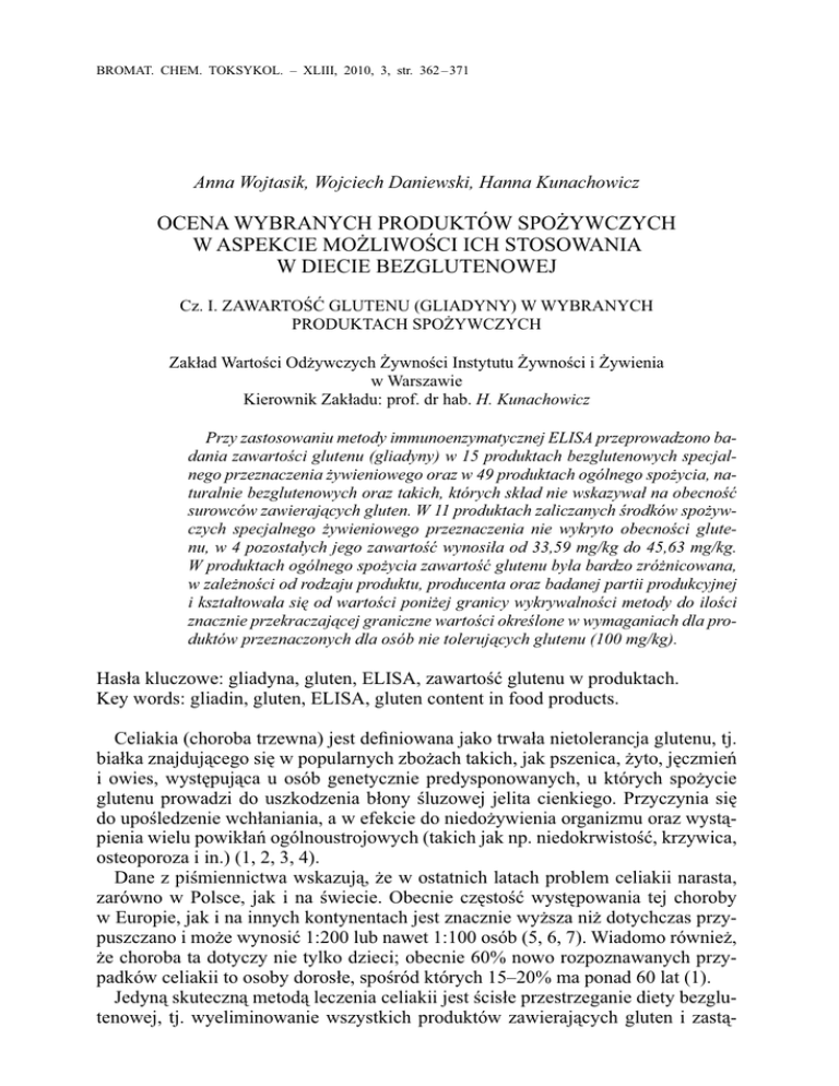 BROMAT. CHEM. TOKSYKOL. – XLIII, 2010, 3, str. 362 – 371 Anna Wojtasik, Wojciech Daniewski, Hanna Kunachowicz OCENA WYBRANYCH PRODUKTÓW SPOŻYWCZYCH W ASPEKCIE MOŻLIWOŚCI ICH STOSOWANIA W DIECIE BEZGLUTENOWEJ Cz. I. ZAWARTOŚĆ GLUTENU (GLIADYNY) W WYBRANYCH PRODUKTACH SPOŻYWCZYCH Zakład Wartości Odżywczych Żywności Instytutu Żywności i Żywienia w Warszawie Kierownik Zakładu: prof. dr hab. H. Kunachowicz Przy zastosowaniu metody immunoenzymatycznej ELISA przeprowadzono badania zawartości glutenu (gliadyny) w 15 produktach bezglutenowych specjalnego przeznaczenia żywieniowego oraz w 49 produktach ogólnego spożycia, naturalnie bezglutenowych oraz takich, których skład nie wskazywał na obecność surowców zawierających gluten. W 11 produktach zaliczanych środków spożywczych specjalnego żywieniowego przeznaczenia nie wykryto obecności glutenu, w 4 pozostałych jego zawartość wynosiła od 33,59 mg/kg do 45,63 mg/kg. W produktach ogólnego spożycia zawartość glutenu była bardzo zróżnicowana, w zależności od rodzaju produktu, producenta oraz badanej partii produkcyjnej i kształtowała się od wartości poniżej granicy wykrywalności metody do ilości znacznie przekraczającej graniczne wartości określone w wymaganiach dla produktów przeznaczonych dla osób nie tolerujących glutenu (100 mg/kg). Hasła kluczowe: gliadyna, gluten, ELISA, zawartość glutenu w produktach. Key words: gliadin, gluten, ELISA, gluten content in food products. Celiakia (choroba trzewna) jest definiowana jako trwała nietolerancja glutenu, tj. białka znajdującego się w popularnych zbożach takich, jak pszenica, żyto, jęczmień i owies, występująca u osób genetycznie predysponowanych, u których spożycie glutenu prowadzi do uszkodzenia błony śluzowej jelita cienkiego. Przyczynia się do upośledzenie wchłaniania, a w efekcie do niedożywienia organizmu oraz wystąpienia wielu powikłań ogólnoustrojowych (takich jak np. niedokrwistość, krzywica, osteoporoza i in.) (1, 2, 3, 4). Dane z piśmiennictwa wskazują, że w ostatnich latach problem celiakii narasta, zarówno w Polsce, jak i na świecie. Obecnie częstość występowania tej choroby w Europie, jak i na innych kontynentach jest znacznie wyższa niż dotychczas przypuszczano i może wynosić 1:200 lub nawet 1:100 osób (5, 6, 7). Wiadomo również, że choroba ta dotyczy nie tylko dzieci; obecnie 60% nowo rozpoznawanych przypadków celiakii to osoby dorosłe, spośród których 15–20% ma ponad 60 lat (1). Jedyną skuteczną metodą leczenia celiakii jest ścisłe przestrzeganie diety bezglutenowej, tj. wyeliminowanie wszystkich produktów zawierających gluten i zastą- Nr 3 Produkty spożywcze a dieta bezglutaminowa. Cz. I 363 pienie ich bezglutenowymi odpowiednikami, wyprodukowanymi z surowców naturalnie nie zawierających glutenu, lub też takich, z których gluten został usunięty na drodze technologicznej. Obecnie na rynku dostępnych jest wiele produktów przeznaczonych dla osób z celiakią (pieczywo, makarony, ciastka, mąki, słodycze itp.). Zaliczane są one do środków spożywczych specjalnego przeznaczenia żywieniowego (tzw. dietetycznych). Jednak z uwagi na to, że w celiakii dieta bezglutenowa musi być stosowana przez całe życie, właściwe jej stosowanie nie może ograniczać się tylko do wykluczenia produktów zabronionych i zastąpienia ich bezglutenowymi odpowiednikami. W celu zapewnienia odpowiedniego spożycia składników odżywczych, ważne jest urozmaicenie diety; w jej składzie należy więc uwzględniać także inne produkty, pochodzące z różnych grup żywności. (2, 4, 8, 9). Poza produktami specjalnego żywieniowego przeznaczenia, również wiele produktów spośród ogólnie dostępnej żywności, naturalnie bezglutenowych i nie zawierających w swoim składzie dodatków pochodzących ze zbóż glutenowych, mogłoby być stosowanych w żywieniu ludzi z celiakią. W tym przypadku jednak problemem jest ewentualne zanieczyszczenie glutenem surowców albo gotowego produktu, np. w trakcie procesu technologicznego. Stąd istotna jest możliwość oceny produktów pod względem zawartości w nich glutenu i zgodności z obowiązującymi wymaganiami, dotyczącymi żywności przeznaczonej dla osób dla osób z celiakią i alergią na gluten. W roku 2009 opublikowane zostało Rozporządzenie Komisji Unii Europejskiej (10), w którym podane zostały nowe wymagania dla produktów przeznaczonych dla osób nie tolerujących glutenu. Zgodnie z nimi: Jako żywność bezglutenową określa się produkty: – składające się lub wytworzone wyłącznie z surowców nie zawierających pszenicy (i jej odmian takich, jak pszenica durum, orkisz lub kamut), żyta, jęczmienia i owsa lub ich odmian, w których całkowity poziom glutenu nie przekracza 20 mg/kg produktu; – zawierające jeden lub więcej składników z pszenicy (i jej odmian takich, jak pszenica durum, orkisz lub kamut), żyta, jęczmienia i owsa lub ich odmian, które zostały specjalnie przetworzone w celu usunięcia z nich glutenu, a całkowity poziom w nich glutenu nie przekracza 20 mg/kg produktu. Jako żywność o bardzo niskiej zawartości glutenu definiuje się produkty: – przeznaczone dla osób z nietolerancją glutenu, zawierające jeden lub więcej składników z pszenicy (i jej odmian takich, jak pszenica durum, orkisz lub kamut), żyta, jęczmienia i owsa lub ich odmian, które zostały specjalnie przetworzone w celu obniżenia w nich zawartości glutenu, a całkowity poziom glutenu w tych produktach nie przekracza 100 mg/kg produktu. Poza dwiema wyżej wymienionymi, została dodatkowo wyróżniona kategoria produktów ogólnego spożycia, które mogą być spożywane przez ludzi z celiakią, o ile zawartość w nich glutenu spełnia warunki określone dla żywności bezglutenowej (20 mg/kg produktu). Wszystkie powyższe wymagania odnoszą się do produktów w postaci, w jakiej są wprowadzane do obrotu i sp
