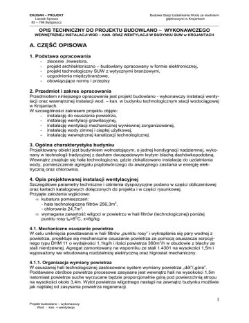 EKOSAN – PROJEKT Budowa Stacji Uzdatniania Wody ze studniami Leszek Sprawa głębinowymi w Krojantach 85 – 796 Bydgoszcz -------------------------------------------------------------------------------------------------------------------------------------------------------------------------- OPIS TECHNICZNY DO PROJEKTU BUDOWLANO – WYKONAWCZEGO WEWNĘTRZNEJ INSTALACJI WOD – KAN. ORAZ WENTYLACJI W BUDYNKU SUW w KROJANTACH A. CZĘŚĆ OPISOWA 1. Podstawa opracowania - zlecenie ,Inwestora, projekt architektoniczno – budowlany opracowany w formie elektronicznej, projekt technologiczny SUW z wytycznymi branżowymi, uzgodnienia międzybranżowe, obowiązujące normy i przepisy 2. Przedmiot i zakres opracowania Przedmiotem niniejszego opracowania jest projekt budowlano - wykonawczy instalacji wentylacji oraz wewnętrznej instalacji wod. – kan. w budynku technologicznym stacji wodociągowej w Krojantach. W szczególności zakresem projektu objęto: - instalację do osuszania powietrza, - instalację wentylacji grawitacyjnej, - instalację wentylacji mechanicznej wywiewnej zorganizowanej, - instalację wody zimnej i ciepłej użytkowej, - instalację wewnętrznej kanalizacji technologicznej. 3. Ogólna charakterystyka budynku Projektowany obiekt jest budynkiem wolnostojącym, o jednej kondygnacji nadziemnej, wykonany w technologii tradycyjnej z dachem dwuspadowym krytym blachą dachówkopodobną. Wewnątrz znajduje się hala technologiczna, gdzie zlokalizowano instalację do uzdatniania wody, pomieszczenie agregatu prądotwórczego do awaryjnego zasilania w energię elektryczną oraz chlorownia. 4. Opis projektowanej instalacji wentylacyjnej Szczegółowe parametry techniczne i ciśnienia dyspozycyjne podano w części obliczeniowej oraz kartach katalogowych dołączonych do projektu i w części rysunkowej. Przyjęte założenia wyjściowe: • kubatura pomieszczeń: - hala technologiczna filtrów 256,3m3, - chlorownia 24,7m3. • wymagana zawartość wilgoci w powietrzu w hali filtrów (technologicznej) poniżej punktu rosy tR=8OC, x=6g/kg 4.1. Mechaniczne osuszanie powietrza W celu uniknięcia powstawania w hali filtrów „punktu rosy” i wykraplania się pary wodnej z powietrza, projektuje się mechaniczne osuszanie powietrza za pomocą osuszacza sorpcyjnego typu DHM 11 o wydajności 1,1kg/h i ilości powietrza 360m3/h w obudowie z blachy ze stali nierdzewnej. Agregat zamontowany na wsporniku ze stali 1.4301 na wysokości 1,5m i wyposażony we wbudowaną rozdzielnicę elektryczną oraz higrostat mechaniczny. 4.1.1. Organizacja wymiany powietrza W osuszanej hali technologicznej zastosowano system wymiany powietrza „dół”/„góra”. Poddawane obróbce powietrze procesowe zasysane jest wewnątrz hali na wysokości 1,5m natomiast powietrze suche wyrzucane będzie proporcjonalnie górą pod powierzchnią stropu na wysokości około 3,4m. Wylot powietrza wilgotnego nastąpi na zewnątrz budynku możliwie jak najdalej od zasysania powietrza regeneracji. 1 Projekt budowlano – wykonawczy Wod - kan. + wentylacja EKOSAN – PROJEKT Budowa Stacji Uzdatniania Wody ze studniami Leszek Sprawa głębinowymi w Krojantach 85 – 796 Bydgoszcz -------------------------------------------------------------------------------------------------------------------------------------------------------------------------- 4.1.2. Sieć kanałów wentylacyjnych Zasysanie powietrza procesowego następuje bezpośrednio do osuszacza króćcem ø125 z siatką. Rozprowadzenie powierza osuszonego nastąpi kolektorem wentylacyjnym ø125/ø80 z kratkami nawiewnymi 325x75mm do montażu typu Spiro pod stropem hali technologicznej. Kratki wyposażone w kierownice i przepustnice regulacyjne. Wyrzut powietrza wilgotnego nastąpi na zewnątrz budynku SUW kanałem ø80/100. Powietrze do regeneracji zasysane będzie z zewnątrz kolektorem ø100/80. Na wylocie powietrza zużytego oraz wlocie regeneracji zastosowano dzielone na zakład maskownice ścienne 150x150/ø100mm. Wszystkie kanały i kształtki wentylacyjne należy wykonać z rur Spiro i blachy stal 1.4301 gr. min 0,5mm. Kolektor powietrza zużytego ocieplić warstwą pianki poliuretanowej gr. 3-5cm w otulinie z blachy stalowej 1.4301 gr. 0,5mm. Kanały montowane na dwustronne obejmy z uszczelką i mocowane do wsporników i ścian za pomocą śrub i kołków rozporowych stal k.o. 4.1.3. Automatyka i sterowanie Przyjęto automatyczną pracę agregatu, który będzie włączany lub wyłączany za pomocą higrostatu mechanicznego zainstalowanego na wysokości 1,5m od poziomu posadzki, w zależności od nastawy. Przy osiągnięciu zadanego poziomu wilgotności agregat załączy się a siłowniki elektryczne zamkną przepustnice wywietrzaków grawitacyjnych w dachu hali. Wentylacja grawitacyjna zacznie działać po osuszeniu pomieszczenia, gdy czujnik wilgotności wyłączy agregat i otworzą się przepustnice. Ponowny start osuszacza powoduje zamknięcie przepustnic. Na etapie rozruchu SUW sprawdzić czy automatyczne przełączenie SZR w przypadku zaniku napięcia na zasilanie rezerwowe z agregatu jest wystarczająco szybkie do podtrzymania automatyki osuszacza. Jeżeli nie, to każdorazowo należy ręcznie załączyć agregat. Osuszacz włączony jest do sieci przewodem 230V/50Hz z wtyczką, zabezpieczenie prądowe I=10A. 4.2. Wentylacja hali technologicznej SUW Zaprojektowano grawitacyjną wentylację hali filtrów. Powietrze zewnętrzne sprowadzane będzie do wewnątrz budynku nad posadzkę czterema nawietrznikami podokiennymi z filtrem i kratkami żaluzjowymi o przekroju 100x200mm każdy. Do usuwania powietrza z hali przewidziano dwa wywietrzaki dachowe typu A ø250 zamontowane na podstawach dachowych B/III z regulowaną przepustnicą, które będą sterowane przez osuszacz powietrza. Kolektory w połaci dachowej wykonać rurami PVC ø250 , izolowanymi termicznie wełną mineralną klasy LM80 gr. min 5cm pod płaszczem z folii aluminiowej gr. 0,5mm w sposób nie 