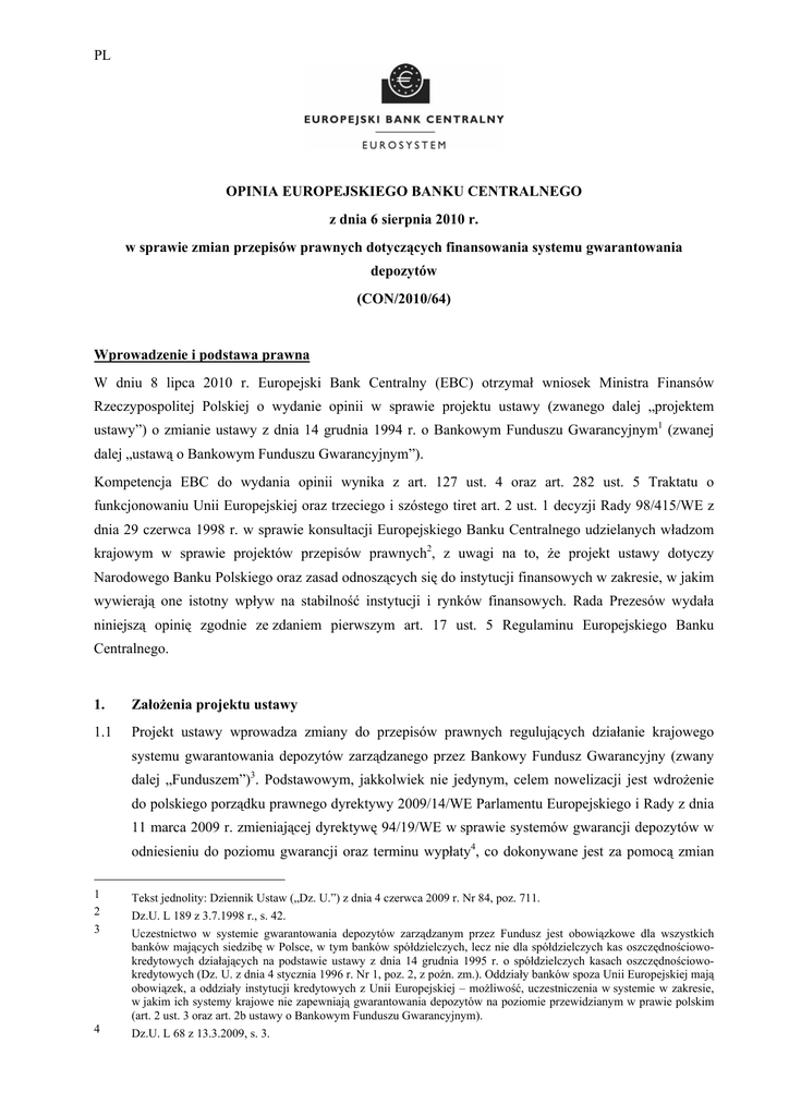 PL OPINIA EUROPEJSKIEGO BANKU CENTRALNEGO z dnia 6 sierpnia 2010 r. w sprawie zmian przepisów prawnych dotyczących finansowania systemu gwarantowania depozytów (CON/2010/64) Wprowadzenie i podstawa prawna W dniu 8 lipca 2010 r. Europejski Bank Centralny (EBC) otrzymał wniosek Ministra Finansów Rzeczypospolitej Polskiej o wydanie opinii w sprawie projektu ustawy (zwanego dalej „projektem ustawy”) o zmianie ustawy z dnia 14 grudnia 1994 r. o Bankowym Funduszu Gwarancyjnym1 (zwanej dalej „ustawą o Bankowym Funduszu Gwarancyjnym”). Kompetencja EBC do wydania opinii wynika z art. 127 ust. 4 oraz art. 282 ust. 5 Traktatu o funkcjonowaniu Unii Europejskiej oraz trzeciego i szóstego tiret art. 2 ust. 1 decyzji Rady 98/415/WE z dnia 29 czerwca 1998 r. w sprawie konsultacji Europejskiego Banku Centralnego udzielanych władzom krajowym w sprawie projektów przepisów prawnych2, z uwagi na to, że projekt ustawy dotyczy Narodowego Banku Polskiego oraz zasad odnoszących się do instytucji finansowych w zakresie, w jakim wywierają one istotny wpływ na stabilność instytucji i rynków finansowych. Rada Prezesów wydała niniejszą opinię zgodnie ze zdaniem pierwszym art. 17 ust. 5 Regulaminu Europejskiego Banku Centralnego. 1. Założenia projektu ustawy 1.1 Projekt ustawy wprowadza zmiany do przepisów prawnych regulujących działanie krajowego systemu gwarantowania depozytów zarządzanego przez Bankowy Fundusz Gwarancyjny (zwany dalej „Funduszem”)3. Podstawowym, jakkolwiek nie jedynym, celem nowelizacji jest wdrożenie do polskiego porządku prawnego dyrektywy 2009/14/WE Parlamentu Europejskiego i Rady z dnia 11 marca 2009 r. zmieniającej dyrektywę 94/19/WE w sprawie systemów gwarancji depozytów w odniesieniu do poziomu gwarancji oraz terminu wypłaty4, co dokonywane jest za pomocą zmian 1 2 3 4 Tekst jednolity: Dziennik Ustaw („Dz. U.”) z dnia 4 czerwca 2009 r. Nr 84, poz. 711. Dz.U. L 189 z 3.7.1998 r., s. 42. Uczestnictwo w systemie gwarantowania depozytów zarządzanym przez Fundusz jest obowiązkowe dla wszystkich banków mających siedzibę w Polsce, w tym banków spółdzielczych, lecz nie dla spółdzielczych kas oszczędnościowokredytowych działających na podstawie ustawy z dnia 14 grudnia 1995 r. o spółdzielczych kasach oszczędnościowokredytowych (Dz. U. z dnia 4 stycznia 1996 r. Nr 1, poz. 2, z poźn. zm.). Oddziały banków spoza Unii Europejskiej mają obowiązek, a oddziały instytucji kredytowych z Unii Europejskiej – możliwość, uczestniczenia w systemie w zakresie, w jakim ich systemy krajowe nie zapewniają gwarantowania depozytów na poziomie przewidzianym w prawie polskim (art. 2 ust. 3 oraz art. 2b ustawy o Bankowym Funduszu Gwarancyjnym). Dz.U. L 68 z 13.3.2009, s. 3. wprowadzanych m. in. w ustawie o Bankowym Funduszu Gwarancyjnym oraz w ustawie z dnia 29 sierpnia 1997 r. o Narodowym Banku Polskim5. Zgodnie z art. 1 ust. 2 decyzji Rady 98/415/WE, niniejsza opinia nie odnosi się do przepisów projektu ustawy, których wyłącznym celem jest wdrożenie dyrektywy 2009/14/WE do polskiego porządku prawnego. 1.2 Projekt ustawy wprowadza zmiany w przepisach ustawy o Bankowym Funduszu Gwarancyjnym oraz ustawy o NBP, które odnoszą się do źródeł finansowania Funduszu, a w szczególności do udzielania Funduszowi kredytu krótkoterminowego przez NBP. W tym zakresie projekt ustawy: a) precyzuje procedurę oraz kolejność, zgodnie z którą Fundusz korzysta z poszczególnych źródeł finansowania, w tym z kredytu krótkoterminowego z NBP6, oraz b) poszerza listę kryteriów warunkujących przyznanie kredytu krótkoterminowego przez NBP, dodając wymóg, zgodnie z którym kredyt ten powinien być udzielany w celu pokrycia pilnych potrzeb Funduszu7. 1.3 EBC wydawał opinie dotyczące kilku poprzednich nowelizacji ustawy o Bankowym Funduszu Gwarancyjnym, wprowadzających zmiany w sposobie finansowania, zarządzania oraz nadzorowania Funduszu8. 2. Zgodność z zakazem finansowania ze środków banku centralnego 2.1 Zasady finansowania krajowego systemu gwarantowania depozytów muszą być zgodne z zakazem finansowania ze środków banku centralnego określonym w art. 123 Traktatu. Przepis ten zabrania m.in. udzielania sektorowi publicznemu przez krajowe banki centralne pożyczek na pokrycie deficytu lub jakichkolwiek innych kredytów, w tym także w formie finansowania zobowiązań sektora publicznego wobec osób trzecich9. Zgodność z zakazem finansowania ze środków banku centralnego wymaga, aby przepływy krótkoterminowe z krajowego banku centralnego do krajowego systemu gwarantowania depozytów mogły być wykonywane jedynie w razie spełniania ściśle określonych kryteriów10. Jak ostatnio wskazano w Raporcie o konwergencji EBC z maja 2010 r. „Koszty wynikające z finansowania systemów rekompensat dla inwestorów muszą być ponoszone, odpowiednio, przez same instytucje kredytowe i przedsiębiorstwa inwestycyjne. Ustawodawstwo krajowe przewidujące finansowanie przez krajowy bank centralny krajowego systemu gwarantowania depozytów dla instytucji kredytowych lub krajowego systemu rekompensowania inwestorów dla przedsiębiorstw inwestycyjnych jest zgodne z zapisem o zakazie 5 6 7 8 9 10 Tekst jednolity: Dz. U z dnia 1 kwietnia 2005 r. Nr 1, poz. 2, z późn. zm. Zob. zmiany wprowadzone w art. 7 ust 2 pkt 4 oraz w art. 15 ust. 6 ustawy o Bankowym Funduszu Gwarancyjnym odpowiednio przez art. 1 pkt 4 oraz art. 1 pkt 5 projektu ustawy. Zob. art. 16a ust. 5 ustawy o Bankowym Funduszu Gwarancyjnym wprowadzony przez art. 1 pkt 6 projektu ustawy, który zastępuje uregulowania zawarte w dotychczasowym art. 34 ustawy o Bankowym Funduszu Gwarancyjnym, uchylonym przez art. 1 pkt 15 projektu ustawy. Zob. opinie EBC CON/2007/26, CON/2008/5 oraz CON/2008/32. Wszystkie opinie EBC są publikowane na stronie internetowej EBC pod adresem www.ecb.europa.eu. Zob. art. 1 ust. 1 lit. b) pkt ii) rozporządzenia Rady (WE) nr 3603/93 z dnia 13 grudnia 