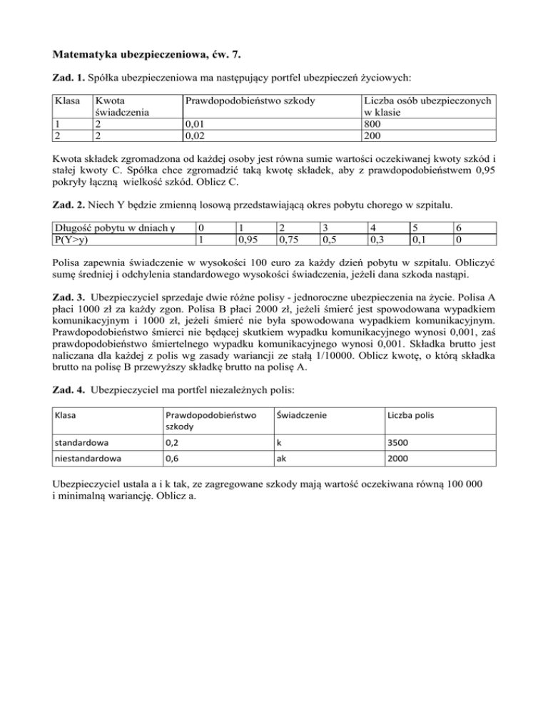 Matematyka ubezpieczeniowa, ćw. 7. - dr Lucyna Trojnar