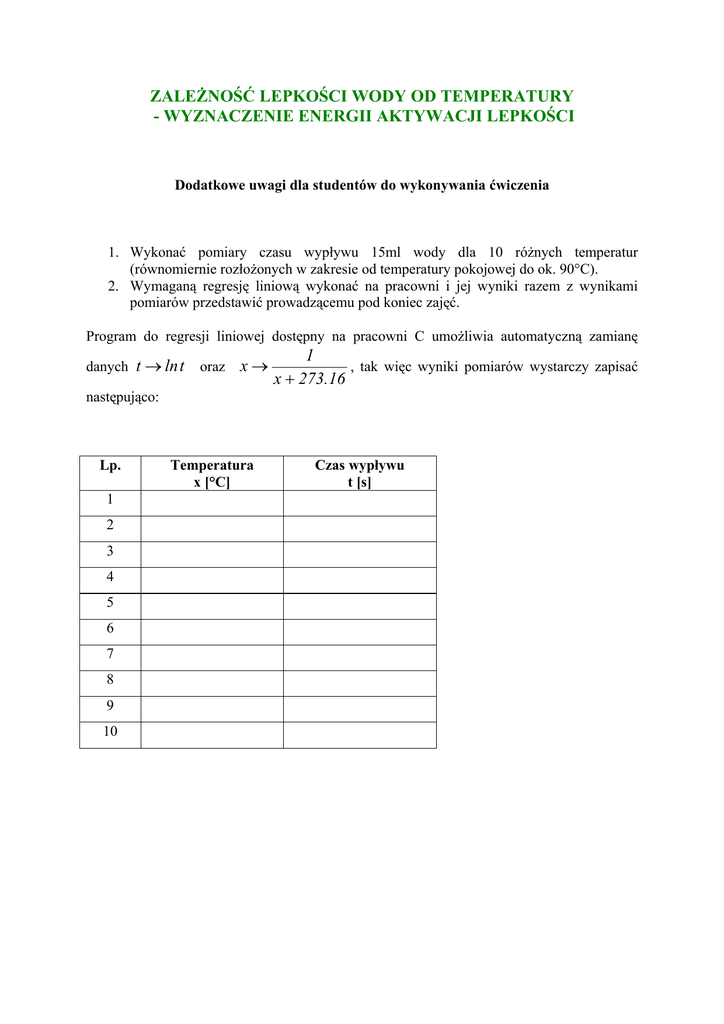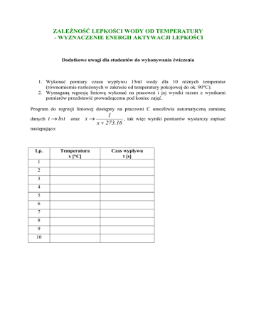 ZALEŻNOŚĆ LEPKOŚCI WODY OD TEMPERATURY - WYZNACZENIE ENERGII AKTYWACJI LEPKOŚCI Dodatkowe uwagi dla studentów do wykonywania ćwiczenia 1. Wykonać pomiary czasu wypływu 15ml wody dla 10 różnych temperatur (równomiernie rozłożonych w zakresie od temperatury pokojowej do ok. 90°C). 2. Wymaganą regresję liniową wykonać na pracowni i jej wyniki razem z wynikami pomiarów przedstawić prowadzącemu pod koniec zajęć. Program do regresji liniowej dostępny na pracowni C umożliwia automatyczną zamianę danych t → ln t oraz x→ 1 , tak więc wyniki pomiarów wystarczy zapisać x + 273.16 następująco: Lp. 1 2 3 4 5 6 7 8 9 10 Temperatura x [°C] Czas wypływu t [s]