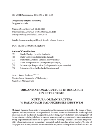 Organisational culture in research on enterprises, ZN WSH Tom XVII