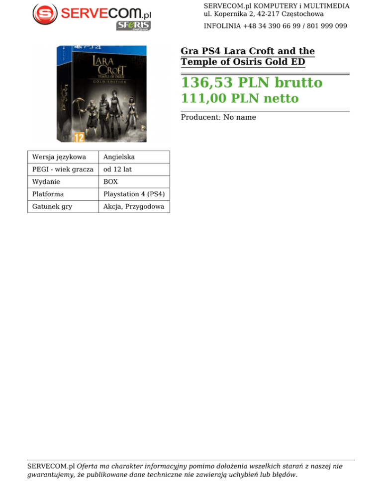 SERVECOM.pl KOMPUTERY i MULTIMEDIA ul. Kopernika 2, 42-217 Częstochowa INFOLINIA +48 34 390 66 99 / 801 999 099 Gra PS4 Lara Croft and the Temple of Osiris Gold ED 136,53 PLN brutto 111,00 PLN netto Producent: No name Wersja językowa Angielska PEGI - wiek gracza od 12 lat Wydanie BOX Platforma Playstation 4 (PS4) Gatunek gry Akcja, Przygodowa SERVECOM.pl Oferta ma charakter informacyjny pomimo dołożenia wszelkich starań z naszej nie gwarantujemy, że publikowane dane techniczne nie zawierają uchybień lub błędów.