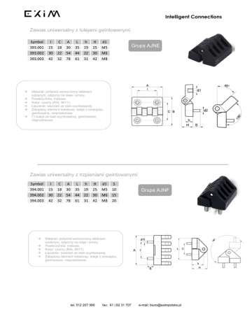 Intelligent Connections Zawias uniwersalny z tulejami gwintowanymi Symbol 393.001 393.002 393.003 I 15 30 42 C 18 22 32 A 30 54 78 L 35 44 61 h 19 22 31 H 25 30 42 d1 M5 M6 M8 Grupa AJNE Materiał: poliamid wzmocniony włóknem szklanym, odporny na oleje i smary. Powierzchnia: matowa. Kolor: czarny (RAL 9011). Łączenie: sworzeń ze stali ocynkowanej. Zatopiony element metalowy: tuleje z mosiądzu, gwintowane, nieprzelotowe, (*) tuleje ze stali ocynkowanej, gwintowane, nieprzelotowe. Zawias uniwersalny z trzpieniami gwintowanymi Symbol 394.001 394.002 394.003 I 15 30 42 C 18 22 32 A 30 54 78 L 35 44 61 h 19 22 31 H 25 30 42 d1 M5 M6 M8 S 10 15 20 Grupa AJNF Materiał: poliamid wzmocniony włóknem szklanym, odporny na oleje i smary. Powierzchnia: matowa. Kolor: czarny (RAL 9011). Łączenie: sworzeń ze stali ocynkowanej. Zatopiony element metalowy: tuleje z mosiądzu, gwintowane, nieprzelotowe, tel. 512 207 990 fax: 61 | 62 31 707 e-mail: [email protected] Intelligent Connections Zawias uniwersalny z tulejami gwintowanymi Symbol 395.001 395.002 395.003 I 15 30 42 A 30 54 78 L 36 44 62 H 25 30 42 d1 M5 M6 M8 Grupa AJNG Materiał: poliamid wzmocniony włóknem szklanym, odporny na oleje i smary. Powierzchnia: matowa. Kolor: czarny (RAL 9011). Łączenie: sworzeń ze stali ocynkowanej. Zatopiony element metalowy: tuleje z mosiądzu, gwintowane, nieprzelotowe, (*) tuleje ze stali ocynkowanej, gwintowane, nieprzelotowe. Zawias uniwersalny z trzpieniami gwintowanymi Symbol 396.001 396.002 396.003 I 15 30 42 A 30 54 78 L 36 44 62 H 25 30 42 d1 M5 M6 M8 Grupa AJNH Materiał: poliamid wzmocniony włóknem szklanym, odporny na oleje i smary. Powierzchnia: matowa. Kolor: czarny (RAL 9011). Łączenie: sworzeń ze stali ocynkowanej. Zatopiony element metalowy: trzpienie wykonane ze stali ocynkowanej, gwintowane. tel. 512 207 990 fax: 61 | 62 31 707 e-mail: [email protected] Intelligent Connections Zawias z otworami przelotowymi Symbol 387.001 387.002 387.003 387.004 387.005 I 20 30 40 60 60 C 20 30 40 63 63 A 32 48 64 96 96 B 32 48 64 96 96 h 7 10,5 13 16 16 H 10,5 15,5 19 24 24 d1 4,5 6,5 6,5 8,5 10,5 Grupa AJNI Materiał: poliamid wzmocniony włóknem szklanym, odporny na oleje i smary. Powierzchnia: matowa. Kolor: czarny (RAL 9011). Łączenie: sworzeń ze stali ocynkowanej. Otwór: otwory w tworzywie pod śruby zgodne z normą DIN 799/UNI5933. Wykonanie na specjalne zamówienie: – inne kolory według tabeli barw. Zawias z tulejami gwintowanymi Symbol 386.001 386.002 386.003 386.004 386.005 386.006 I 30 30 40 40 60 60 C 30 30 40 40 63 63 A 48 48 64 64 95 95 B 48 48 64 64 95 95 h 10,5 10,5 13 13 19 19 H 15,5 15,5 19 19 28,5 28,5 d1 M5 M6 M6 M8 M8 M10 Grupa AJNJ Materiał: poliamid wzmocniony włóknem szklanym, odporny na oleje i smary. Powierzchnia: matowa. Kolor: czarny (RAL 9011). Łączenie: sworzeń ze stali ocynkowanej. Zatopiony element metalowy: tuleje z mosiądzu, gwintowane, nieprzelotowe. Wykonanie na specjalne zamówienie: – sworzeń i tuleje z innego materiału, – inne kolory według tabeli barw. tel. 512 207 990 fax: 61 | 62 31 707 e-mail: [email protected] Intelligent Connections Zawias płaski z tulejami gwintowanymi z otworami przelotowymi Symbol 390.001 390.002 I 30 40 C 30 40 A 48 64 B 48 64 h 10,5 13 H 15,5 19 d1 M6 M6 d2 6,5 6,5 Grupa AJNB Materiał: poliamid wzmocniony włóknem szklanym, odporny na oleje i smary. Powierzchnia: matowa. Kolor: czarny (RAL 9011). Łączenie: sworzeń ze stali ocynkowanej. Zatopiony element metalowy: tuleje z mosiądzu, gwintowane, nieprzelotowe. Otwór: otwory w tworzywie pod śruby zgodne z normą DIN 799/5933. Wykonanie na specjalne zamówienie: – tuleje z innego materiału, – inne kolory według tabeli barw. Zawias płaski z trzpieniami gwintowanymi Symbol 391.001 391.002 391.003 391.004 391.005 391.006 l 30 30 40 40 60 60 C 30 30 40 40 63 63 A 48 48 64 64 95 95 B 48 48 64 64 95 95 h 10,5 10,5 13 13 19 19 H 15,5 15,5 19 19 28,5 28,5 d1 M5 M6 M6 M8 M8 M10 S 15 15 20 20 20 20 Grupa AJNC Materiał: poliamid wzmocniony włóknem szklanym, odporny na oleje i smary. Powierzchnia: matowa. Kolor: czarny (RAL 9011). Łączenie: sworzeń ze stali ocynkowanej. Zatopiony element metalowy: trzpienie ze stali ocynkowanej, gwintowane. Wykonanie na specjalne zamówienie: – sworzeń i trzpienie z innego materiału, – inne kolory według tabeli barw. tel. 512 207 990 fax: 61 | 62 31 707 e-mail: [email protected] Intelligent Connections Zawias płaski z trzpieniami i tulejami gwintowanymi Symbol 392.001 392.002 392.003 392.004 392.005 392.006 l 30 30 40 40 60 60 C 30 30 40 40 63 63 A 48 48 64 64 95 95 B 48 48 64 64 95 95 h 10,5 10,5 13 13 19 19 H 15,5 15,5 19 19 28,5 28,5 d1 M5 M6 M6 M8 M8 M10 d2 M5 M6 M6 M8 M8 M10 S 15 15 20 20 20 20 Grupa AJND Materiał: poliamid wzmocniony włóknem szklanym, odporny na oleje i smary. Powierzchnia: matowa. Kolor: czarny (RAL 9011). Łączenie: sworzeń ze stali ocynkowanej. Zatopiony element metalowy: tuleje z mosiądzu, gwintowane, nieprzelotowe, trzpienie ze stali ocynkowanej, gwintowane. Wykonanie na specjalne zamówienie: – inne kolory według tabeli barw. tel. 512 207 990 fax: 61 | 62 31 707 e-mail: [email protected]
