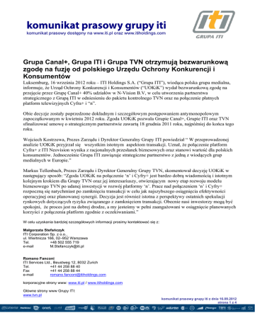 Grupa Canal+, Grupa ITI i Grupa TVN otrzymują bezwarunkową zgodę na fuzję od polskiego Urzędu Ochrony Konkurencji i Konsumentów Luksemburg, 16 września 2012 roku – ITI Holdings S.A. (“Grupa ITI”), wiodąca polska grupa medialna, informuje, że Urząd Ochrony Konkurencji i Konsumentów (“UOKiK”) wydał bezwarunkową zgodę na przejęcie przez Grupę Canal+ 40% udziałów w N-Vision B.V, w celu utworzenia partnerstwa strategicznego z Grupą ITI w odniesieniu do pakietu kontrolnego TVN oraz na połączenie płatnych platform telewizyjnych Cyfra+ i “n”. Obie decyzje zostały poprzedzone dokładnym i szczegółowym postępowaniem antymonopolowym zapoczątkowanym w kwietniu 2012 roku. Zgoda UOKiK pozwala Grupie Canal+, Grupie ITI oraz TVN sfinalizować umowę o strategicznym partnerstwie zawartą 18 grudnia 2011 roku, najpóźniej do końca tego roku. Wojciech Kostrzewa, Prezes Zarządu i Dyrektor Generalny Grupy ITI powiedział “ W przeprowadzonej analizie UOKiK przyjrzał się wszystkim istotnym aspektom transakcji. Uznał, że połączenie platform Cyfra+ z ITI Neovision wynika z racjonalnych przesłanek biznesowych oraz stanowi wartość dla polskich konsumentów. Jednocześnie Grupa ITI zawiązuje strategiczne partnerstwo z jedną z wiodących grup medialnych w Europie.” Markus Tellenbach, Prezes Zarządu i Dyrektor Generalny Grupy TVN, skomentował decyzję UOKiK w następujący sposób: “Zgoda UOKiK na połączenie ‘n’ i Cyfry+ jest bardzo dobrą wiadomością i istotnym kolejnym krokiem dla Grupy TVN oraz jej interesariuszy, otwierającym nowy etap rozwoju modelu biznesowego TVN po udanej inwestycji w rozwój platformy ‘n’. Prace nad połączeniem ‘n’ i Cyfry+ rozpoczną się natychmiast po zamknięciu transakcji w celu jak najszybszego osiągnięcia efektywności operacyjnej oraz planowanej synergii. Decyzja jest również istotna z perspektywy ostatnich spekulacji rynkowych dotyczących ryzyka związanego z zamknięciem transakcji. Obecnie nasi inwestorzy mogą być spokojni, że proces jest na dobrej drodze, a my jesteśmy w pełni zaangażowani w osiągnięcie planowanych korzyści z połączenia platform zgodnie z oczekiwaniami.” W celu uzyskania bardziej szczegółowych informacji prosimy kontaktować się z: Małgorzata Stefańczyk ITI Corporation Sp. z o.o., ul. Wiertnicza 166, 02–952 Warszawa Tel. +48 502 555 719 e-mail [email protected] Romano Fanconi ITI Services Ltd., Beustweg 12, 8032 Zurich Tel. +41 44 258 88 40 Fax +41 44 258 88 44 e-mail [email protected] korporacyjne strony www: www.iti.pl / www.itiholdings.com Główne strony www Grupy ITI: www.tvn.pl komunikat prasowy grupy iti z dnia 16.09.2012 strona 1 z 4 www.onet.pl www.n.pl www.multikino.pl www.legia.com *** Grupa ITI Grupa ITI jest wiodącą na polskim rynku grupą medialną działającą w obszarze transmisji telewizyjnej, nowych mediów, prowadzenia multipleksów, a także dystrybucji kinowej i piłki nożnej. Nadawanie programów telewizyjnych Grupa ITI prowadzi działalność na rynku telewizyjnym głównie poprzez Grupę TVN, jedną z największych komercyjnych sieci telewizyjnych w Polsce. Grupa TVN jest właścicielem dziesięciu kanałów telewizyjnych. Grupa TVN jest notowana na Giełdzie Papierów Wartościowych w Warszawie (kod notowań na GPW: TVN) od grudnia 2004 roku, będąc częścią indeksu WIG 20. TVN, główny kanał telewizyjny Grupy, jest na polskim rynku uznawany za czołowy program telewizyjny, oferujący wysokiej jakości programy rozrywkowe oraz rzetelne i niezależne audycje informacyjne. TVN dociera do 93% gospodarstw domowych w Polsce. TVN7 to kanał telewizyjny o profilu filmowo-serialowym, uzupełniający ofertę programową TVN. Kanał dociera do 74% gospodarstw domowych w Polsce. TVN24 jest pierwszym polskim 24-godzinnym informacyjno-publicystycznym docierającym do 61% gospodarstw domowych w Polsce. kanałem telewizyjnym TVN CNBC jest kanałem informacyjnym o tematyce biznesowej, przygotowywanym we współpracy z CNBC Europe. Kanał dociera do 55% gospodarstw domowych w Polsce. TVN Meteo to pierwszy polski kanał telewizyjny o pogodzie, docierający do 59% gospodarstw domowych w Polsce. TVN Turbo jest pierwszym polskim kanałem tematycznym adresowanym do mężczyzn i zarazem pierwszym poświęconym głównie motoryzacji. Kanał dociera do 60% gospodarstw domowych. TVN Style jest kanałem telewizyjnym poświęconym urodzie, stylom życia, modzie oraz zdrowiu adresowanym do kobiet. Dociera do 60% gospodarstw domowych. ITVN jest kanałem telewizyjnym skierowanym do widowni pochodzenia polskiego zamieszkałej za granicą, dostępnym w Europie, Ameryce Północnej i w Australii. Telezakupy Mango to jedyny w Polsce całodobowy kanał telesprzedażowy, docierający do 58% gospodarstw domowych. NTL jest lokalnym kanałem telewizyjnym adresowanym do mieszkańców Radomska i okolic. TVN News & Services Agency, najbardziej wszechstronnie działająca agencja mediowa w Europie Środkowej i Wschodniej, jako jedyna w regionie oferuje pełną kompleksowość usług. Oprócz tego Grupa ITI jest właścicielem Telewizji Religia.tv Religia.tv to kanał poruszający tematy z obszaru szeroko pojętej wiary i religii. Kanał nadaje całodobowo, dociera do 8.3 miliona odbiorców poprzez platformy cyfrowe: n, Cyfrę+, Cyfrowy Polsat i TNK oraz największe polskie sieci kablowe i ponad 150 mniejszych sieci lokalnych, dostępny jest w Stanach Zjednoczonych na platformie DISH Network. Online Grupa ITI prowadzi działalność w segmencie nowych mediów poprzez Grupę Onet.pl S.A., największego wydawcy internetowego w Polsce, właściciela portalu Onet oraz innych najchętniej odwiedzanych tematycznych serwisów internetowych, takich jak Sympatia.pl, Zumi.pl, Biznes.pl, Digart.pl, PCLab.pl. Grupa Onet.pl S.A. jest jednostką całkowicie zależną od TVN S.A. komunikat prasowy grupy iti z dnia 16.09.2012 strona 2 z 4 Onet jest największym i najczęściej odwiedz