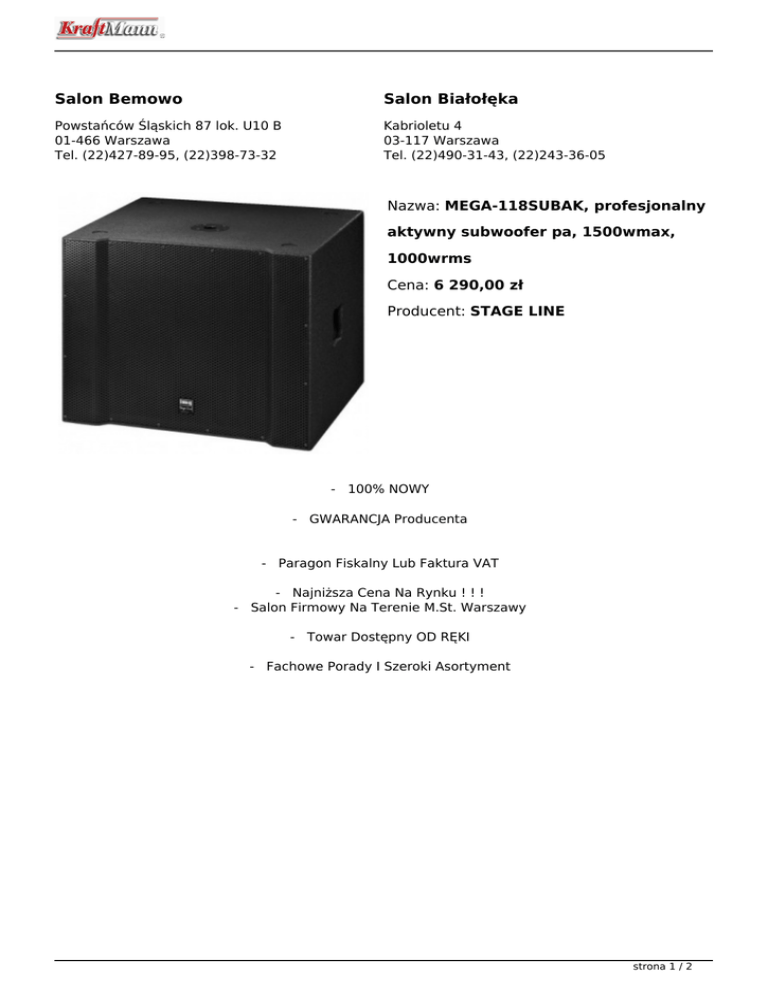 Salon Bemowo Salon Białołęka Powstańców Śląskich 87 lok. U10 B 01-466 Warszawa Tel. (22)427-89-95, (22)398-73-32 Kabrioletu 4 03-117 Warszawa Tel. (22)490-31-43, (22)243-36-05 Nazwa: MEGA-118SUBAK, profesjonalny aktywny subwoofer pa, 1500wmax, 1000wrms Cena: 6 290,00 zł Producent: STAGE LINE - 100% NOWY - GWARANCJA Producenta - Paragon Fiskalny Lub Faktura VAT - Najniższa Cena Na Rynku ! ! ! - Salon Firmowy Na Terenie M.St. Warszawy - Towar Dostępny OD RĘKI - Fachowe Porady I Szeroki Asortyment strona 1 / 2 MEGA - seria profesjonalnych zestawów głośnikowych PA wykonana z doskonałej jakości materiałów oraz głośników renomowanych producentów (Beyma, Celestion). Kształt obudów, wykonanych z brzozowej sklejki, pozwala na uniwersalne zastosowanie. Profesjonalny aktywny subwoofer PA, 1500WMAX, 1000WRMS Aktywny subwoofer w drewnianej obudowie bass-reflex 46cm (18", Celestion FTR18-4080HDX) głośnik basowy Wbudowany moduł wzmacniacza cyfrowego o dużych rezerwach mocy Regulacja częstotliwości filtru dolnoprzepustowego (50-250Hz), wzmocnienia, przełącznik fazy Symetryczne wejścia (combo XLR/6.3mm) oraz zrówn. wyjścia (XLR) Dodatkowe liniowe wyjścia górnoprzepustowe (XLR L/P, 50-250 Hz) do podłączania aktywnych zestawów głośnikowych oraz liniowe wyjście dolnoprzepustowe (XLR) dla kolejnego aktywnego subwoofera Dodatkowe wyjście (min. 8Ω, NEUTRIK SPEAKON) do podłączania pasywnego subwoofera Obudowa wykonana z wysokiej jakości, wzmocnionej sklejki Podwójne, wytrzymałe pokrycie PU Gwintowane otwory na kółka, gumowe nóżki, gniazdo na statyw, oraz maskownica Płyta montażowa M20, odpowiednia do statywu: KM-21367 (wyposaż. dodatk.) W komplecie kabel zasilający NEUTRIK POWERCON KONTAKT: Marcin 506-732-725 strona 2 / 2 Powered by TCPDF (www.tcpdf.org)