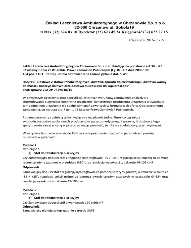 Zakład Lecznictwa Ambulatoryjnego w Chrzanowie Sp. z o.o. 32-500 Chrzanów ul. Sokoła19 tel/fax.(32) 624 03 10 Dyrektor (32) 623 45 34 Księgowość (32) 623 27 15 __________________________________________________________________ Chrzanów 2016-11-15 Zakład Lecznictwa Ambulatoryjnego w Chrzanowie Sp. z.o.o działając na podstawie art.38 ust.1 i 2 ustawy z dnia 29.01.2004r. Prawo zamówień Publicznych (t.j. Dz.U. Z dnia 2006r. Nr 164 poz. 1163 – ze zm) udziela odpowiedzi na zadane pytania dot. SIWZ. Dotyczy: „Dostawa 2 stołów rehabilitacyjnych, dostawa aparatu do elektroterapii, dostawa wanny do masażu kończyn dolnych oraz dostawa mikroskopu do kapilaroskopii” Znak sprawy: ZLA-ZP-752w/18/16 W powyższym ogłoszeniu oraz specyfikacji istotnych warunków zamówienia znalazły się sformułowania sugerujące konkretne urządzenie, konkretnego producenta urządzenia w związku z tym żadne inne urządzenie nie spełni wymagań zawartych w formularzach oferty Opis przedmiotu zamówienia, co narusza art. 7 ust. 1 i 2 Ustawy Prawo Zamówień Publicznych. Podane parametry spełniają tylko i wyłącznie urządzenia jednej firmy co ogranicza swobodę gospodarczą dla innych producentów sprzętu medycznego i sprawia, iż dostawca tego sprzętu może zawyżyć cenę w przetargu mając pewność, że nikt nie spełni powyższych wymagań. W związku z tym zwracamy się do Państwa o dopuszczenie urządzeń o parametrach poniżej opisanych w pytaniach. Pytanie 1 dot. część 1 a) Stół do rehabilitacji 3-sekcyjny Czy Zamawiający dopuści stół z regulacją kąta zagłówka -85 / +35°, regulacją sekcji nożnej za pomocą jednej sprężyny gazowej w przedziale 0:80°oraz regulacją wysokości w zakresie 49-105 cm? Odpowiedź: Zamawiający dopuści stół z regulacją kąta zagłówka za pomocą sprężyny gazowej w zakresie w zakresie -85 / +35°, regulacją sekcji nożnej za pomocą dwóch sprężyn gazowych w przedziale 0º-85º oraz regulacją wysokości w zakresie 49-105 cm. Pytanie 2 dot. część 1 b) Stół do rehabilitacji 3-sekcyjny Czy Zamawiający dopuści stół o wymiarach 190 x 66cm? Odpowiedź: Zamawiający planuje zakup zgodnie z treścią SIWZ Pytanie 3 dot. część 1 c) Stół do rehabilitacji 5-sekcyjny Czy Zamawiający dopuści stół z regulacją kąta zagłówka w zakresie -85 / +35°, regulacją sekcji nożnej za pomocą jednej sprężyny gazowej w przedziale 0:80°oraz regulacją wysokości w zakresie 49-105 cm? Odpowiedź: Zamawiający dopuści stół z regulacją kąta zagłówka za pomocą sprężyny gazowej w zakresie -85 / +35°, regulacją sekcji nożnej za pomocą dwóch sprężyn gazowych w przedziale 0º-85º oraz regulacją wysokości w zakresie 49-105 cm. Pytanie 4 dot. część 1 d) Stół do rehabilitacji 5-sekcyjny Czy Zamawiający dopuści stół o wymiarach 190 x66 cm? Odpowiedź: Zamawiający planuje zakup zgodnie z treścią SIWZ Pytanie 5 dot. część 2 – wanna do masażu kończyn dolnych i obręczy biodrowej Czy Zamawiający dopuści urządzenie o lepszych parametrach wyposażone dodatkowo w system kąpieli perełkowej, system chromoterapii, system 3 całkowicie niezależnych stref masażu umożliwiający wybór terapii z 7 kombinacji, dotykowy panel sterujący z opcją wprowadzania własnych programów, materiał kompozytowy wykonany z powłoki antybakteryjnej o pojemności 70l/ 185 l? Odpowiedź: Zamawiający planuje zakup zgodnie z treścią SIWZ V-CE PREZES ZARZĄDU Dyrektor ds. administracyjno – organizacyjnych mgr Grażyna Skopińska