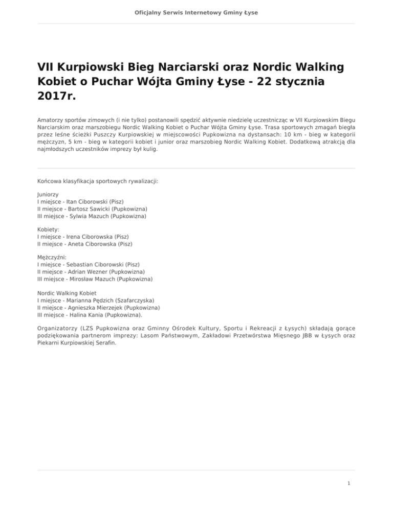 Oficjalny Serwis Internetowy Gminy Łyse VII Kurpiowski Bieg Narciarski oraz Nordic Walking Kobiet o Puchar Wójta Gminy Łyse - 22 stycznia 2017r. Amatorzy sportów zimowych (i nie tylko) postanowili spędzić aktywnie niedzielę uczestnicząc w VII Kurpiowskim Biegu Narciarskim oraz marszobiegu Nordic Walking Kobiet o Puchar Wójta Gminy Łyse. Trasa sportowych zmagań biegła przez leśne ścieżki Puszczy Kurpiowskiej w miejscowości Pupkowizna na dystansach: 10 km - bieg w kategorii mężczyzn, 5 km - bieg w kategorii kobiet i junior oraz marszobieg Nordic Walking Kobiet. Dodatkową atrakcją dla najmłodszych uczestników imprezy był kulig. Końcowa klasyfikacja sportowych rywalizacji: Juniorzy I miejsce - Itan Ciborowski (Pisz) II miejsce - Bartosz Sawicki (Pupkowizna) III miejsce - Sylwia Mazuch (Pupkowizna) Kobiety: I miejsce - Irena Ciborowska (Pisz) II miejsce - Aneta Ciborowska (Pisz) Mężczyźni: I miejsce - Sebastian Ciborowski (Pisz) II miejsce - Adrian Wezner (Pupkowizna) III miejsce - Mirosław Mazuch (Pupkowizna) Nordic Walking Kobiet I miejsce - Marianna Pędzich (Szafarczyska) II miejsce - Agnieszka Mierzejek (Pupkowizna) III miejsce - Halina Kania (Pupkowizna). Organizatorzy (LZS Pupkowizna oraz Gminny Ośrodek Kultury, Sportu i Rekreacji z Łysych) składają gorące podziękowania partnerom imprezy: Lasom Państwowym, Zakładowi Przetwórstwa Mięsnego JBB w Łysych oraz Piekarni Kurpiowskiej Serafin. 1