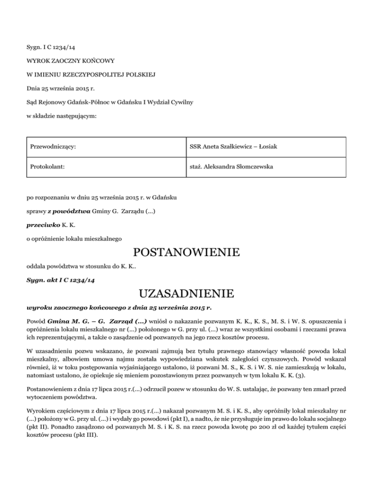 Sygn. I C 1234/14 WYROK ZAOCZNY KOŃCOWY W IMIENIU RZECZYPOSPOLITEJ POLSKIEJ Dnia 25 września 2015 r. Sąd Rejonowy Gdańsk-Północ w Gdańsku I Wydział Cywilny w składzie następującym: Przewodniczący: SSR Aneta Szałkiewicz – Łosiak Protokolant: staż. Aleksandra Słomczewska po rozpoznaniu w dniu 25 września 2015 r. w Gdańsku sprawy z powództwa Gminy G. Zarządu (...) przeciwko K. K. o opróżnienie lokalu mieszkalnego POSTANOWIENIE oddala powództwa w stosunku do K. K.. Sygn. akt I C 1234/14 UZASADNIENIE wyroku zaocznego końcowego z dnia 25 września 2015 r. Powód Gmina M. G. – G. Zarząd (...) wniósł o nakazanie pozwanym K. K., K. S., M. S. i W. S. opuszczenia i opróżnienia lokalu mieszkalnego nr (...) położonego w G. przy ul. (...) wraz ze wszystkimi osobami i rzeczami prawa ich reprezentującymi, a także o zasądzenie od pozwanych na jego rzecz kosztów procesu. W uzasadnieniu pozwu wskazano, że pozwani zajmują bez tytułu prawnego stanowiący własność powoda lokal mieszkalny, albowiem umowa najmu została wypowiedziana wskutek zaległości czynszowych. Powód wskazał również, iż w toku postępowania wyjaśniającego ustalono, iż pozwani M. S., K. S. i W. S. nie zamieszkują w lokalu, natomiast ustalono, że opiekuje się mieniem pozostawionym przez pozwanych w tym lokalu K. K. (3). Postanowieniem z dnia 17 lipca 2015 r.(...) odrzucił pozew w stosunku do W. S. ustalając, że pozwany ten zmarł przed wytoczeniem powództwa. Wyrokiem częściowym z dnia 17 lipca 2015 r.(...) nakazał pozwanym M. S. i K. S., aby opróżniły lokal mieszkalny nr (...) położony w G. przy ul. (...) i wydały go powodowi (pkt I), a nadto, że nie przysługuje im prawo do lokalu socjalnego (pkt II). Ponadto zasądzono od pozwanych M. S. i K. S. na rzecz powoda kwotę po 200 zł od każdej tytułem części kosztów procesu (pkt III). Pozwany K. K. (3), któremu prawidłowo doręczono odpis pozwu i zawiadomienie o terminie rozprawy, nie składał wyjaśnień i nie wniósł o rozpoznanie sprawy pod jego nieobecność. Sąd ustalił następujący stan faktyczny: Lokal mieszkalny nr (...) położony w G., przy ul. (...) znajduje się w zasobach mieszkaniowych Gminy M. G.. (bezsporne) M. S., K. S. oraz W. S. zajmowali lokal mieszkalny nr (...) położony w G., przy ul. (...) na podstawie umowy najmu z dnia 01 lutego 1988 r. (dowód: umowa najmu – k. 4) Pismami z dnia 22 kwietnia 2008 r. Gmina M. G. wypowiedziała M. S., K. S. i W. S. umowę najmu przedmiotowego lokalu mieszkalnego. (dowód: pisma z dnia 22 kwietnia 2008 r. wraz z dowodami nadania – k. 12-17) W toku postępowania wyjaśniającego przeprowadzonego przez pracowników G. Zarządu (...) korzystający z sąsiadujących lokali mieszkalnych oświadczyli, że nie jest im wiadomym, aby ktokolwiek w sposób stały zamieszkiwał bądź opiekował się lokalem mieszkalnym nr (...) przy ul. (...). (dowód: oświadczenia – k. 19-21, 97-99) Sąd zważył, co następuje: Powództwo w stosunku do K. K. nie było zasadne i nie zasługiwało na uwzględnienie. Sąd ustalił okoliczności mające znaczenie dla rozstrzygnięcia sprawy na podstawie załączonych dokumentów, których prawdziwość i autentyczność zasadniczo nie budziła wątpliwości Sądu. Jednak, w ocenie Sądu, powód nie wykazał, by pozwany K. K. (4) zamieszkuje w spornym lokalu, jak również tego, że posiada w nim swoje rzeczy. Jedynym dokumentem, który miał powyższą okoliczność potwierdzić była notatka sporządzona przez pracownika powoda, w której zapisano, że 25.10.2012r. pozwany oświadczyć miał, że zamieszkuje w przedmiotowym lokalu mieszkalnym, opiekując się rzeczami pozwanych. Okoliczność powyższa nie została jednak w żaden sposób potwierdzona w procesie. Zgodnie z art. 222 § 1 k.c. właściciel może żądać od osoby, która włada faktycznie jego rzeczą, ażeby rzecz została mu wydana, chyba że osobie tej przysługuje skuteczne względem właściciela uprawnienie do władania rzeczą. Przesłanką powstania roszczenia windykacyjnego, o którym mowa w cyt. wyżej przepisie jest m.in. faktyczne władanie rzeczą właściciela przez osobę, której nie przysługuje jakikolwiek tytuł prawny do władania nią. Jednocześnie zgodnie z treścią art. 6 k.c., ciężar udowodnienia faktu spoczywa na osobie, która z faktu tego wywodzi skutki prawne. Przepis ten określa reguły dowodzenia, tj. przedmiot dowodu oraz osobę, na której spoczywa ciężar udowodnienia faktów mających istotne znaczenie dla rozstrzygnięcia sprawy. Zaznaczyć też trzeba, że przy rozpoznawaniu sprawy na podstawie przepisów kodeksu postępowania cywilnego rzeczą sądu nie jest zarządzenie dochodzeń w celu uzupełnienia lub wyjaśnienia twierdzeń stron i wykrycia środków dowodowych pozwalających na ich udowodnienie, ani też Sąd nie jest zobowiązany do przeprowadzenia z urzędu dowodów zmierzających do wyjaśnienia okoliczności istotnych dla rozstrzygnięcia sprawy (art. 232 k.p.c.). Obowiązek przedstawienia dowodów spoczywa na stronach (art. 3 k.p.c.), a ciężar udowodnienia faktów mających dla rozstrzygnięcia sprawy istotne znaczenie (art. 227 k.p.c.) spoczywa na stronie, która z faktów tych wywodzi skutki prawne. Zaprzeczenie dokonane przez stronę procesową powoduje, że istotne dla rozstrzygnięcia sprawy okoliczności stają się sporne i muszą być udowodnione. W razie ich nieudowodnienia Sąd oceni je na niekorzyść strony, na której spoczywał ciężar dowodu, chyba że miał możność przekonać się o prawdziwości tych twierdzeń na innej podstawie (orzeczenie SN z 28.04.1975 r., sygn. akt III CRN 26/75). W przedmiotowej sprawie powód w żaden sposób nie wykazał, aby pozwany K. K. (3) władał lokalem objętym żądaniem pozwu, nie przedstawił na tę okoliczność żadnego wiarygodnego dokumentu, jak też nie wnioskowano o przesłuchanie świadków, którzy fakt ten mogliby potwierdzić. Więcej, pow