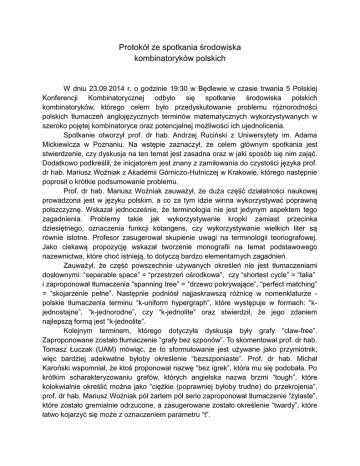 Protokół ze spotkania środowiska kombinatoryków polskich W dniu 23.09.2014 r. o godzinie 19:30 w Będlewie w czasie trwania 5 Polskiej Konferencji Kombinatorycznej odbyło się spotkanie środowiska polskich kombinatoryków, którego celem było przedyskutowanie problemu różnorodności polskich tłumaczeń anglojęzycznych terminów matematycznych wykorzystywanych w szeroko pojętej kombinatoryce oraz potencjalnej możliwości ich ujednolicenia. Spotkanie otworzył prof. dr hab. Andrzej Ruciński z Uniwersytety im. Adama Mickiewicza w Poznaniu. Na wstępie zaznaczył, że celem głównym spotkania jest stwierdzenie, czy dyskusja na ten temat jest zasadna oraz w jaki sposób się nim zająć. Dodatkowo podkreślił, że inicjatorem jest znany z zamiłowania do czystości języka prof. dr hab. Mariusz Woźniak z Akademii Górniczo-Hutniczej w Krakowie, którego następnie poprosił o krótkie podsumowanie problemu. Prof. dr hab. Mariusz Woźniak zauważył, że duża część działalności naukowej prowadzona jest w języku polskim, a co za tym idzie winna wykorzystywać poprawną polszczyznę. Wskazał jednocześnie, że terminologia nie jest jedynym aspektem tego zagadnienia. Problemy takie jak wykorzystywanie kropki zamiast przecinka dziesiętnego, oznaczenia funkcji kotangens, czy wykorzystywanie wielkich liter są równie istotne. Profesor zasugerował skupienie uwagi na terminologii teoriografowej. Jako ciekawą propozycję wskazał tworzenie monografii na temat podstawowego nazewnictwa, które choć istnieją, to dotyczą bardzo elementarnych zagadnień. Zauważył, że część powszechnie używanych określeń nie jest tłumaczeniami dosłownymi: “separable space” = “przestrzeń ośrodkowa”, czy “shortest cycle” = “talia” i zaproponował tłumaczenia “spanning tree” = “drzewo pokrywające”, “perfect matching” = “skojarzenie pełne”. Następnie podniósł najjaskrawszą różnicę w nomenklaturze polskie tłumaczenia terminu “k-uniform hypergraph”, które występuje w formach: “kjednostajne”, “k-jednorodne”, czy “k-jednolite” oraz stwierdził, że jego zdaniem najlepszą formą jest “k-jednolite”. Kolejnym terminem, którego dotyczyła dyskusja były grafy “claw-free”. Zaproponowane zostało tłumaczenie “grafy bez szponów”. To skomentował prof. dr hab. Tomasz Łuczak (UAM) mówiąc, że to sformułowanie jest używane jako przymiotnik, więc bardziej adekwatne byłoby określenie “bezszponiaste”. Prof. dr hab. Michał Karoński wspomniał, że ktoś proponował nazwę “bez igrek”, która mu się podobała. Po krótkim scharakteryzowaniu grafów, których angielska nazwa brzmi “tough”, które kolokwialnie określić można jako “ciężkie (poprawniej byłoby trudne) do przekrojenia”, prof. dr hab. Mariusz Woźniak pół żartem pół serio zaproponował tłumaczenie “żylaste”, które zostało gremialnie odrzucone, a zasugerowane zostało określenie “twardy”, które łatwo kojarzyć się może z oznaczeniem parametru “t”. Odnosząc się do zarzutu śmieszności niektórych proponowanych nazw zauważono, że z biegiem lat przestaje być to problemem. Jako przykład wskazano, że w środowisku nikogo nie śmieszy określenie “matematyka dyskretna”, które bawi większość innych ludzi. Innym podanym przykładem zabawnego określenia były “żmirłacze”, która to klasa grafów w języku angielskim określana jest jako “snark”. Kończąc dyskusję dotyczącą konkretnych tłumaczeń postawiono problem efektów jakie winno nieść to spotkanie. Pomysł powołania oficjalnej komisji nie spotkał się z przychylnymi komentarzami. Natomiast ustalenie terminu kolejnego takiego zebrania na kolejną edycję konferencji (za dwa lata) zostało uznane za sensowne. Prof. dr hab. Jerzy Jaworski zaproponował utworzenie słownika, który można byłoby umieścić na stronie internetowej, który niekoniecznie musiałby być wspólny dla wszystkich (co zauważył prof. dr hab. Michał Karoński). Dodatkowo prof. dr hab. Jerzy Jaworski zasugerował, żeby był on powszechnie dostępny, a na spotkaniu ustalić pewne standardy umieszczania w nim wpisów. Podnosząc przykład pewnej konferencji medycznej, na której występował językoznawca prof. dr hab. Jerzy Bralczyk, prof. dr hab. Andrzej Ruciński zaproponował możliwość konsultacji językoznawczych. Jednocześnie ponowił pytanie o wnioski ze spotkania i dalsze plany i zasugerował, by kolejne zebrania odbywały się w mniejszych gronach i miały charakter bardziej roboczy. Na to prof. dr hab. Jerzy Jaworski zapytał, czy jesteśmy w stanie stworzyć forum. Nawiązując do pytania o efekty spotkania prof. dr hab. Andrzeja Rucińskiego, prof. dr hab. Tomasz Łuczak zaproponował znalezienie dobrego tłumaczenia dla “extremal graph theory”, którego często potrzebuje we wnioskach grantowych i recenzjach. Określenie “ekstremalna teoria grafów” uznał za nieładne. W odpowiedzi prof. dr hab. Andrzej Ruciński zaproponował “teorię grafów ekstremalnych”. Prof. dr hab. Jerzy Jaworski wskazał, że to już drugie określenie, które udało się ustalić, na co prof. dr hab. Andrzej Ruciński zaprotestował, że nie takie decyzje nie powinny być dokonywane ad hoc, bo może to doprowadzić do powstanie “dżungli” terminologicznej. Jednocześnie jako źródło problemu wskazał prace magisterskie, które powstają w języku polskim. Dołączył do tego prof. dr hab. Jerzy Jaworski dodając prace doktorskie i wykłady dla studentów. Podsumował to prof. dr hab. Andrzej Ruciński stwierdzając, że w sytuacji niemożności znalezienia dobrego tłumaczenia używa form angielskich. Następnie została otwarta szersza dyskusja, w której pierwszy wypowiedział się dr Karol Suchan (AGH). Zauważył, że język to twór kultury i naturalnym jest to, że różne ośrodki wytwarzają własne określenia. Uzgodnienie ich następuj