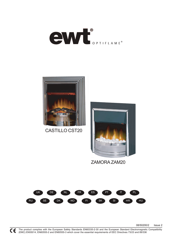CASTILLO CST20 ZAMORA ZAM20 UK RU DE SE NL DK FR NO ES FI PT SK IT SI PL HR HU 08/50200/2 Issue 2 The product complies with the European Safety Standards EN60335-2-30 and the European Standard Electromagnetic Compatibility (EMC) EN55014, EN60555-2 and EN60555-3 which cover the essential requirements of EEC Directives 73/23 and 89/336 1 424 603 226 536 A B 665 Castillo CST20 Zamora ZAM20 2 3 1 2 (a) 3 (b) I II (c) 4 5 WAĩNE: PRZECZYTAJ DOKàADNIE NINIEJSZĄ INSTRUKCJĉ ORAZ ZACHOWAJ JĄ W CELU WYKORZYSTANIA W PRZYSZàOĝCI PL MontaĪ moduáu efektu kamieni WaĪne zalecenia dotyczące bezpieczeĔstwa: Przy korzystaniu z urządzeĔ elektrycznych, naleĪy zawsze postĊpowaü zgodnie z wymienionymi poniĪej podstawowymi zasadami bezpieczeĔstwa, w celu unikniĊcia ryzyka poĪaru, poraĪenia prądem elektrycznym lub powstania obraĪeĔ cielesnych: JeĪeli urządzenie jest uszkodzone, przed rozpoczĊciem instalowania i eksploatacji, naleĪy skontaktowaü siĊ z dostawcą. Nie wolno uĪywaü go na zewnątrz. Grzejnika tego nie moĪna uĪywaü w bezpoĞrednim sąsiedztwie wanny, prysznica ani basenu. Grzejnika nie wolno ustawiaü bezpoĞrednio pod staáym gniazdkiem elektrycznym ani skrzynką rozdzielczą. Urządzenie nie moĪe byü uĪywane przez dzieci ani inne osoby bez pomocy czy nadzoru, jeĪeli ich fizyczne, zmysáowe lub psychiczne zdolnoĞci uniemoĪliwiają bezpieczne uĪywanie nagrzewnicy. NaleĪy dopilnowaü, aby dzieci nie uĪywaáy urządzenia do zabawy. Tego grzejnika nie wolno uĪywaü z szeregowo zainstalowanym regulatorem temperatury, regulatorem programowym, timerem ani Īadnym innym urządzeniem automatycznie wáączającym grzanie, poniewaĪ przypadkowe przykrycie grzejnika lub przesuniĊcie go stworzy zagroĪenie poĪarowe. Upewnij siĊ, Īe meble, zasáony i inne przedmioty palne znajdują siĊ co najmniej 1 m od grzejnika. W przypadku awarii naleĪy wyciągnąü z gniazdka wtyczkĊ przewodu zasilającego. JeĪeli grzejnik nie jest uĪywany przez dáuĪszy czas, naleĪy wyciągnąü z gniazdka wtyczkĊ przewodu zasilającego. Grzejnik jest zgodny z normami bezpieczeĔstwa, jednak nie zaleca siĊ stosowania go na dywanach czy kocach z dáugim wáosiem. Urządzenie naleĪy ustawiü w taki sposób, aby zapewniü áatwy dostĊp do wtyczki zasilania. W przypadku uszkodzenia kabla musi on zostaü wymieniony przez producenta, serwisanta lub osobĊ o podobnych kwalifikacjach, aby zapobiec niebezpieczeĔstwu. Kabel zasilający naleĪy prowadziü z dala od grzejnika. OSTRZEĩENIE: W celu unikniĊcia przegrzania, nie wolno przykrywaü grzejnika. Nie wolno káaĞü na grzejniku Īadnych materiaáów i odzieĪy, ani blokowaü przepáywu powietrza wokóá grzejnika. Na grzejniku umieszczony jest symbol ostrzegawczy informujący, Īe nie wolno przykrywaü grzejnika. Ustaw moduá efektu kamieni we wáaĞciwym poáoĪeniu i dokrĊü go Ğrubami. UmieĞü kamienie na podkáadzie páomienia. Uwaga: Podzespóá efektu káody drewna naleĪy zachowaü do wykorzystania w przyszáoĞci. Recykling Dotyczy urządzeĔ elektrycznych sprzedawanych na terenie Unii Europejskiej. Po zakoĔczeniu okresu uĪywalnoĞci urządzenia nie wolno utylizowaü go wraz z odpadami domowymi. W miarĊ moĪliwoĞci naleĪy oddaü je do recyklingu. W celu uzyskania szczegóáowych informacji dotyczących recyklingu naleĪy skontaktowaü siĊ z lokalnymi wáadzami lub sprzedawcą. Czyszczenie OSTRZEĩENIE: ZAWSZE ODàĄCZ URZĄDZENIE OD SIECI PRZED ROZPOCZĉCIEM CZYSZCZENIA GRZEJNIKA. Do czyszczenia naleĪy uĪywaü áagodnego Ğrodka czyszczącego – nie wolno uĪywaü Ğrodków czyszczących o wáaĞciwoĞciach Ğciernych. Szklane okno naleĪy czyĞciü ostroĪnie za pomocą miĊkkiej szmatki. NIE WOLNO stosowaü Īadnych Ğrodków do czyszczenia szkáa. Aby usunąü kurz i káaczki z kratki wylotowej wentylatora grzejnika, od czasu do czasu naleĪy oczyĞciü ją odkurzaczem z zaáoĪoną koĔcówką w postaci miĊkkiej szczotki. Obsáuga posprzedaĪowa Gdy zajdzie potrzeba skorzystania z serwisu posprzedaĪnego lub zakupu czĊĞci zamiennych, naleĪy skontaktowaü siĊ ze sprzedawcą urządzenia lub zadzwoniü na podany na karcie gwarancyjnej numer serwisu w Twoim kraju. Nie naleĪy od razu odsyáaü uszkodzonego urządzenia do producenta, poniewaĪ moĪe to spowodowaü jego utratĊ, uszkodzenie lub opóĨnienie naprawy. Prosimy doáączyü paragon jako dowód zakupu. Informacje ogólne Grzejnik naleĪy ostroĪnie rozpakowaü i zachowaü opakowanie do przyszáego uĪycia – na wypadek przewoĪenia lub zwrotu do dostawcy. Grzejnik wyposaĪony jest w tzw. efekt páomieni, który moĪna stosowaü przy wáączonym lub wyáączonym grzaniu; w ten sposób moĪna siĊ nim cieszyü przez caáy rok. UĪywanie wyáącznie efektu páomienia wiąĪe siĊ jedynie z niewielkim poborem prądu. Przed podáączeniem grzejnika naleĪy sprawdziü, czy napiĊcie zasilania jest takie samo, jak wymienione na tabliczce znamionowej grzejnika. Uwaga: W przypadku uĪywania grzejnika w miejscu o bardzo niskim poziomie haáasu moĪe byü sáyszalny dĨwiĊk związany z dziaáaniem efektu páomienia. Jest to normalne zjawisko i nie powinno budziü niepokoju. Poáączenia elektryczne OSTRZEĩENIE — TO URZĄDZENIE MUSI BYû UZIEMIONE Grzejnik musi byü zasilany wyáącznie prądem zmiennym o napiĊciu zgodnym z wartoĞcią podaną na tabliczce znamionowej urządzenia. Przed wáączeniem grzejnika naleĪy przeczytaü wszystkie zasady bezpieczeĔstwa i instrukcje obsáugi. Sterowanie — zobacz Rys. 2 Sposób grzania ustawia siĊ za pomocą trzech przeáączników. Przeáącznik jest w pozycji Wà., gdy strona z oznaczeniami (n.p. I, I lub II) jest wciĞniĊta. Przeáącznik 1 (I) Reguluje zasilanie elektryczne i efekt páomienia. Uwaga: Przeáącznik musi znajdowaü siĊ w pozycji ON (I), aby grzejnik mógá pracowaü, z grzaniem lub bez. Przeáącznik 2 (I) Zapewnia moc grzania 1 kW Przeáącznik 3 (II) Z przeáącznikiem 2 zapewnia moc grzania 