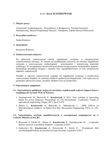 dr inż. Jerzy KASZKOWIAK 1. Miejsce pracy: Uniwersytet Technologiczno - Przyrodniczy w Bydgoszczy, Wydział Inżynierii Mechanicznej, Instytut Eksploatacji Maszyn i Transportu, Zakład Maszyn Roboczych 2. Dyscyplina naukowa: Nauki Rolnicze 3. Specjalność: Inżynieria Rolnicza 4. Zainteresowania naukowe: Do głównych zainteresowań należą zagadnienia związane z energetycznym wykorzystaniem biomasy. W ramach tej problematyki mieszczą się również zagadnienia związane z nowoczesnymi technologiami pozyskaniem i konserwacją materiału roślinnego. W szczególności możliwość pozyskania energii poprzez bezpośrednie spalanie, fermentację (produkcja biogazu i etanolu) oraz zagospodarowanie na cele energetyczne odpadów organicznych. Ponadto w zakresie zainteresowań znajdują się zagadnienia związane z możliwością wykorzystania biopaliw do zasilania silników spalinowych biopaliwami i ich wpływem na parametry jakościowe pracy, trwałość silników oraz na środowisko. 5. Najważniejsze osiągnięcia 5.1. Najważniejsze publikacje mających określony współczynnik wpływu Impact factor i znajdujących się bazie Web of Scienses: 1. Zastempowski M., Borowski S., Kaszkowiak J. 2013. New solution in harvesting plants for power purposes. Proceedings of 5th International Conference Trends in agricultural engineering, Prague 2013, pp.673-676. 2. Dulcet E., Kaszkowiak J., Borowski S., Mikołajczak J. 2006. Effects of Microbiological Additive on Baled Wet Hay. Biosystems Engineering, 95(3), ss. 379384. 5.2. Najważniejsze artykuły opublikowanych w czasopismach znajdujących się w wykazie Ministra (Lista B): 1. Borowski S, Żarski W., Dulcet E., Kaszkowiak J., Zastempowski M., „Logistyka dostaw surowca w produkcji biopaliw” Logistyka 4/2015 2. Grabowicz M., Kaszkowiak J., Dorszewski P., Szterk P., Przydatność folii oksybiodegradowalnej do przechowywania kiszonek Logistyka 4/2015 3. Markiewicz-Patalon M., Kaszkowiak J., Borowski S., Pietrzak W., Hujo L., The analysis of the problems with management of wastes generated by a transport company Logistyka 5/2015 4. Kaszkowiak J. TECHNIKA APLIKACJI DODATKÓW UŁATWIAJ_CYCH ZAKISZANIE MATERIAŁÓW ROŚLINNYCH PRZEZNACZONYCH DO PRODUKCJI BIOGAZU „Journal of Research and Applications 52 in Agricultural Engineering” 2014, Vol. 59(1) 5. Kaszkowiak J, Kroll M., Kłosowski M., Analiza eksploatacyjnych, technicznych i technologicznych możliwości ograniczenia nakładów energetycznych w produkcji rolniczej STUDIA I MATERIAŁY POLSKIEGO STOWARZYSZENIA ZARZĄDZANIA WIEDZĄ 2014 6. Kaszkowiak E., Kaszkowiak J., “Plon i wydajność bioetanolu z kukurydzy w warunkach gleb lekkich” Inżynieria i Aparatura Chemiczna 2/2013 7. Kaszkowiak E., Kaszkowiak J., Szymczak M,. “Spalanie ziarna kukurydzy, pszenżyta i żyta uprawianych przy ograniczonym nawożeniu azotowym” Inżynieria i Aparatura Chemiczna 2/2013 8. Kaszkowiak J., “Possibilities of beet use for needs of a biogas plant” ” Journal of research and applications in agricultural engineering” 59/2013 9. Borowski S., Dorszewski P., Kaszkowiak J., Dulcet E., Mikołajczak J. 2013. Application of the additives which increase the biogas production in the context of improvement of the biogas production process. Journal of Research and Applications in Agricultural Engineering, Vol. 58(2). p. 21-24. 10. Kaszkowiak J., Borowski S., Dulcet E. 2013. Silage of feeds in coated tank - a method to recommend for use in organic farming. Journal of Research and Applications in Agricultural Engineering, Vol. 58(2). p. 61-64. 5.3. Uzyskane Patenty 1. Kaszkowiak J., (współautor) Sposób siewu bruzdowego punktowego P.408866: 2013 2. Wzór przemysłowy (współautor) -Redlica do bruzdowego wysiewu nasion W.121815 2013 3. Wzór przemysłowy (współautor) – Rozdzielacz nr 5995 z dn. 02.12.2004 4. Wzór przemysłowy (współautor) - Przyrząd do pobierania próbek materiałów stałych nr 5994 z dn. 02.12.2004 5.4. Publikacje książkowe i monografie: 1. Banaszak J., Borowski S., Bujaczek R., Chojnacki J., Dulcet E., Fleszar J., Kaszkowiak E., Kaszkowiak J., Konieczny M., Kukiełka K., Kukiełka L., Mandzejewski A., Piskier T., Rama R., Sławiński K., Zastempowski M. 2015. Trawniki. Projektowanie. Technika w zakładaniu i pielęgnacji. Wydawnictwa Uczelniane UTP Bydgoszcz, ss. 1-230 2. Kaszkowiak E., Kaszkowiak J., 2010 Podstawy Agromechaniki Wydawnictwa Uczelniane UTP Bydgoszcz s. 1-124 3. Jarmocik E., Bochat A., Borowski S., Dulcet E., Kaszkowiak J., Ziętara W. 2007. Praca zbiorowa. Maszyny i Narzędzia Rolnicze., Wydawnictwa Uczelniane UTP Bydgoszcz, ss. 1-277 4. Dulcet E., Jarmocik E., Kaszkowiak J., Ziętara W., Borowski S. 2005. Praca zbiorowa. Podstawy Agrotechnologii. Wydawnictwa Uczelniane ATR Bydgoszcz, ss. 1-230. 5.5. Prestiżowe nagrody i wyróżnienia: Nagroda Ministra Rolnictwa i Rozwoju Wsi „Za osiągnięcia w zakresie wdrażania postępu w rolnictwie, rozwoju wsi i rynkach rolnych” za realizację pracy zespołowej pt.: „Opracowanie i wdrożenie techniki aplikacji konserwantów przy zbiorze wilgotnego siana prasami zwijającymi”, Warszawa, 2005.