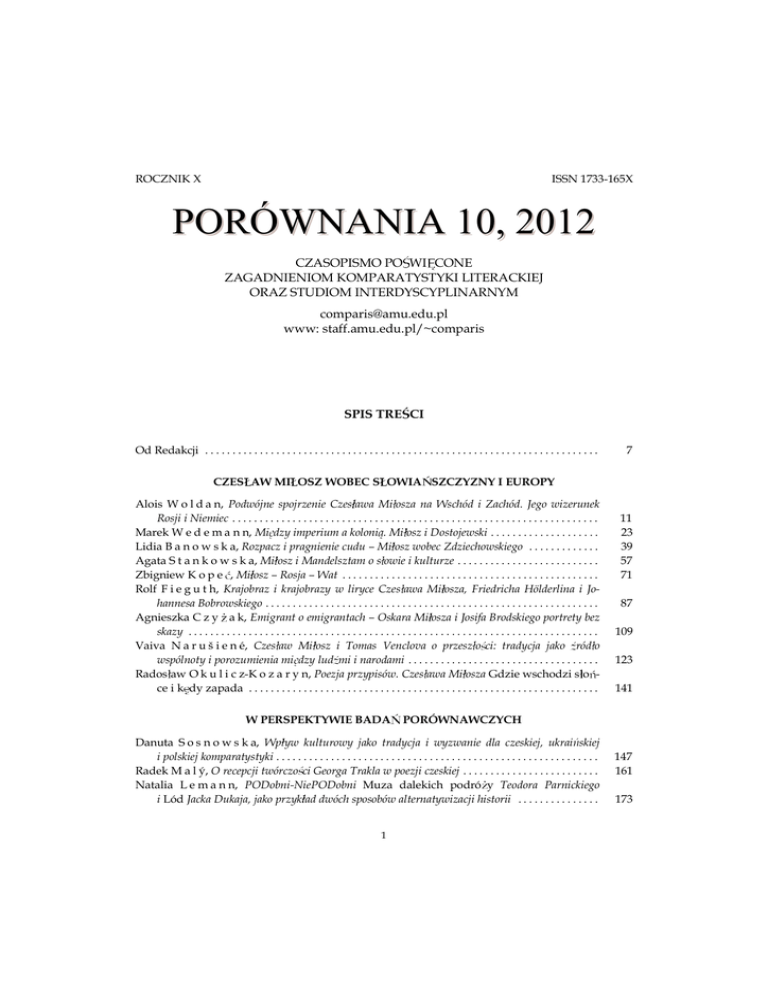 ROCZNIK X ISSN 1733-165X PORÓWNANIA 10, 2012 CZASOPISMO PO WI CONE ZAGADNIENIOM KOMPARATYSTYKI LITERACKIEJ ORAZ STUDIOM INTERDYSCYPLINARNYM [email protected] www: staff.amu.edu.pl/~comparis SPIS TRE CI Od Redakcji . . . . . . . . . . . . . . . . . . . . . . . . . . . . . . . . . . . . . . . . . . . . . . . . . . . . . . . . . . . . . . . . . . . . . . . . 7 CZES AW MI OSZ WOBEC S OWIA SZCZYZNY I EUROPY Alois W o l d a n, Podwójne spojrzenie Czes awa Mi osza na Wschód i Zachód. Jego wizerunek Rosji i Niemiec . . . . . . . . . . . . . . . . . . . . . . . . . . . . . . . . . . . . . . . . . . . . . . . . . . . . . . . . . . . . . . . . . . . Marek W e d e m a n n, Mi dzy imperium a koloni . Mi osz i Dostojewski . . . . . . . . . . . . . . . . . . . . Lidia B a n o w s k a, Rozpacz i pragnienie cudu Mi osz wobec Zdziechowskiego . . . . . . . . . . . . . Agata S t a n k o w s k a, Mi osz i Mandelsztam o s owie i kulturze . . . . . . . . . . . . . . . . . . . . . . . . . . Zbigniew K o p e , Mi osz Rosja Wat . . . . . . . . . . . . . . . . . . . . . . . . . . . . . . . . . . . . . . . . . . . . . . . Rolf F i e g u t h, Krajobraz i krajobrazy w liryce Czes awa Mi osza, Friedricha Hölderlina i Johannesa Bobrowskiego . . . . . . . . . . . . . . . . . . . . . . . . . . . . . . . . . . . . . . . . . . . . . . . . . . . . . . . . . . . . . Agnieszka C z y a k, Emigrant o emigrantach Oskara Mi osza i Josifa Brodskiego portrety bez skazy . . . . . . . . . . . . . . . . . . . . . . . . . . . . . . . . . . . . . . . . . . . . . . . . . . . . . . . . . . . . . . . . . . . . . . . . . . . Vaiva N a r u i e n é, Czes aw Mi osz i Tomas Venclova o przesz o ci: tradycja jako ród o wspólnoty i porozumienia mi dzy lud mi i narodami . . . . . . . . . . . . . . . . . . . . . . . . . . . . . . . . . . . Rados aw O k u l i c z-K o z a r y n, Poezja przypisów. Czes awa Mi osza Gdzie wschodzi s o ce i k dy zapada . . . . . . . . . . . . . . . . . . . . . . . . . . . . . . . . . . . . . . . . . . . . . . . . . . . . . . . . . . . . . . . . W PERSPEKTYWIE BADA 87 109 123 141 PORÓWNAWCZYCH Danuta S o s n o w s k a, Wp yw kulturowy jako tradycja i wyzwanie dla czeskiej, ukrai skiej i polskiej komparatystyki . . . . . . . . . . . . . . . . . . . . . . . . . . . . . . . . . . . . . . . . . . . . . . . . . . . . . . . . . . . Radek M a l ý, O recepcji twórczo ci Georga Trakla w poezji czeskiej . . . . . . . . . . . . . . . . . . . . . . . . . Natalia L e m a n n, PODobni-NiePODobni Muza dalekich podró y Teodora Parnickiego i Lód Jacka Dukaja, jako przyk ad dwóch sposobów alternatywizacji historii . . . . . . . . . . . . . . . 1 11 23 39 57 71 147 161 173 SZKICE O KULTURZE I LITERATURZE Daniel T o m c z a k, Poeta, poecie, poet Mi dzy artystyczn wolno ci a intencj autora . . . . . Kinga P i o t r o w i a k-J u n k i e r t, Bycie ydem jako sytuacja uniwersalna. ydowska faculté maîtresse Victora Klemperera . . . . . . . . . . . . . . . . . . . . . . . . . . . . . . . . . . . . . . . . . . . . . . . . . . . . . . Sabina G i e r g i e l, Sarajewski elementarz Miljenka Jergovicia . . . . . . . . . . . . . . . . . . . . . . . . . . . . . 189 207 221 RECENZJE Katarzyna L u k a s, Interdyskursywne maski Brunona Schulza (Dieter de Bruyn, Kris van Heuckelom (red.), (Un)masking Bruno Schulz. New Combinations, Further Fragmentations, Ultimate Reintegrations. Studies in Slavic Literature and Poetics LIV. Rodopi, Amsterdam New York 2009, ss. 529) . . . . . . . . . . . . . . . . . . . . . . . . . . . . . . . . . . . . . . . . . . . . . . . . . . . Agata P o p d a, Interdyscyplinarno (Robert Frodeman, Julie Thompson Klein, Carl Mitcham (red.), The Oxford Handbook of Interdisciplinarity. Oxford University Press 2010, pp. 304) . . . . Tomasz S ó j k a, Czytanie gwiazd (Grzegorz Raubo, Ludzie si na górne zapatruj obroty. Astronomiczne konteksty literatury polskiego baroku. Pozna 2011, ss. 244) . . . . . . . . . . . . . . Dobrochna D a b e r t, Wszystko, co chcieliby cie wiedzie o literaturze erotycznej w Czechach, a do tej pory wstydzili cie si zapyta . (Radim Kopá , Josef Schwarz, Z sta te tudí tajemstvím Známá i neznámá erotika (a skatologika) v eské literatu e 18092009. Artes Liberales. Wyd. Paseka, Praha 2010, ss. 128) . . . . . . . . . . . . . . . . . . . . . . . . . . . . . . . . . . . . . . . Jan G a l a n t, Odwil i poezja (Janusz Detka Wiersze polskiej odwil y (19531957). Wydawnictwo Uniwersytetu Humanistyczno-Przyrodniczego, Kielce 2010, ss. 256) . . . . . . Dorota S k o t a r c z a k, Historyk ogl da film (Marc Ferro, Kino i historia. T um. T. Falkowski. Warszawa 2011, ss. 292) . . . . . . . . . . . . . . . . . . . . . . . . . . . . . . . . . . . . . . . . . . . . . . . . . . . . . . Anna I d z i k o w s k a-C z u b a j, Czterdzie ci lat z ycia partii niezjednoczonej i nierobotniczej (Bohdan Halczak, Polska Zjednoczona Partia Robotnicza w powiecie. Funkcjonowanie powiatowych instancji PZPR na przyk adzie Zielonej Góry (19491989). Oficyna Wydawnicza Uniwersytetu Zielonogórskiego, Zielona Góra 2011, ss. 280) . . . . . . . . . . . . . . . . . . . 239 249 259 265 271 276 281 OMÓWIENIA Czes awa Mi osza pó nocna strona. Red. naukowa tomu Ma gorzata Czermi ska i Katarzyna Szalewska. Nadba tyckie Centrum Kultury w Gda sku. Gda sk 2011, ss. 496 (Jaros aw Bytner); Postscriptum Polonistyczne 2011, 1 (7) Mi osz w stulcie urodzin (Bogus aw Baku a); Kultur und / als Übersetzung. Russisch-deutsche Beziehungen im 20. und 21. Jahrhundert. Red. Christine Engel, Birgit Menzel. Frank & Timme. Berlin 2011, ss. 344 (Wolfgang Schlott, prze o y a Emilia Kledzik); Karol Irzykowski, A tizedik múzsa. A filmesztétika kérdései. Fordította: Dabi M. István és Szíjártó Imre. Magyar Képz m vészeti Egyetem Doktori Iskola Brozsek Kiadó, Budapest, 2011, ss. 218 (Kinga Piotrowiak-Junkiert); The Sarmatian Review, September 2011January 2012 (Bogus aw Baku a) . . . . . . . . . . . . . . . . . . . . . . . . . . . . . . 289 Au